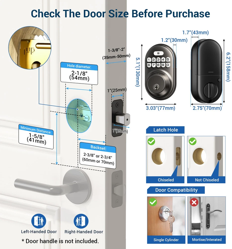 Keyless Entry: With 20 password code + 2 spare keys + -time password for temporary visitors, the -time code will automatically deleted after use Smart and Convenient: With anti peeping function when entering passwords, and the front door lock set can 'auto lock' in 10-99 seconds, or press a key for 2 seconds to lock the door manually Keypad Deadbolt: The ANSI 3 smart door lock was made with sturdy lock cylinder and alloy, powered by 4 AA batteries, work last for more than 1 year Electronic Door Lock: Has backlit keypad and low battery alert, mute mode and vacation mode, water resistant, go perfectly with both traditional and modern house Easy to Install: Just with a screwdriver, the door lock will be easily installed and program all by yourself in several minutes, with all American standard left and right handed doors offers at least 1 year product customer support from the date of purchase, 24/7 support for you