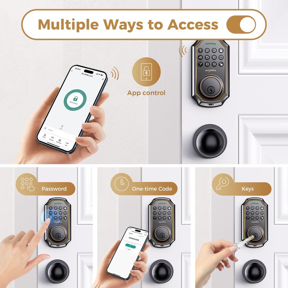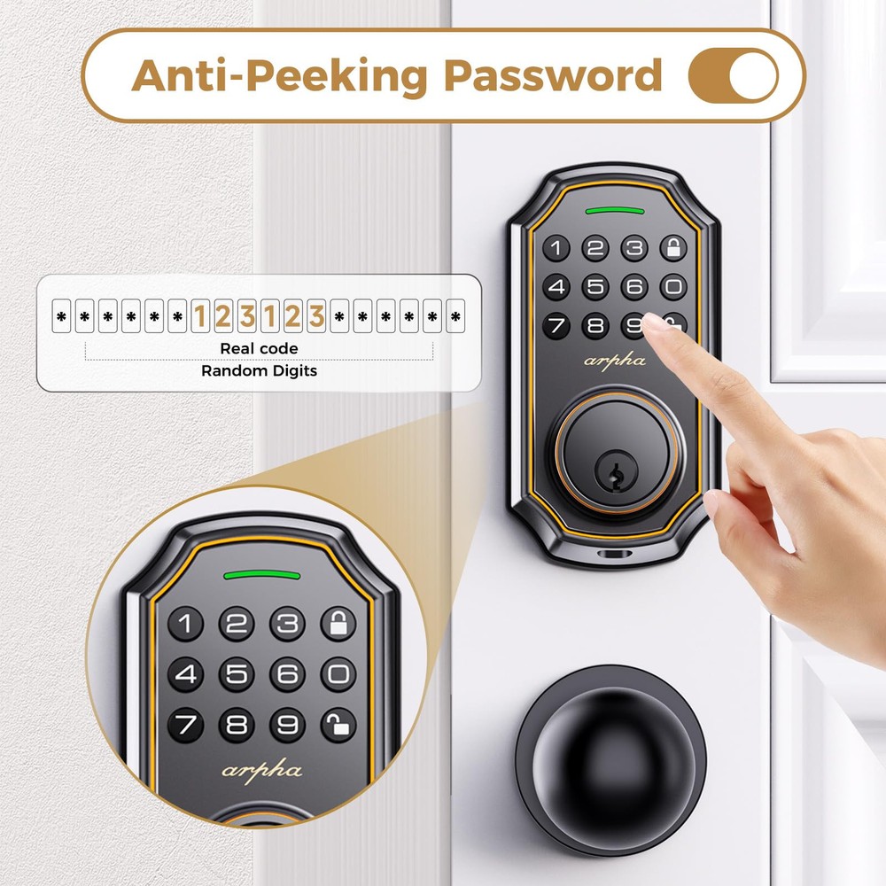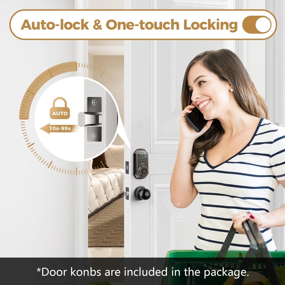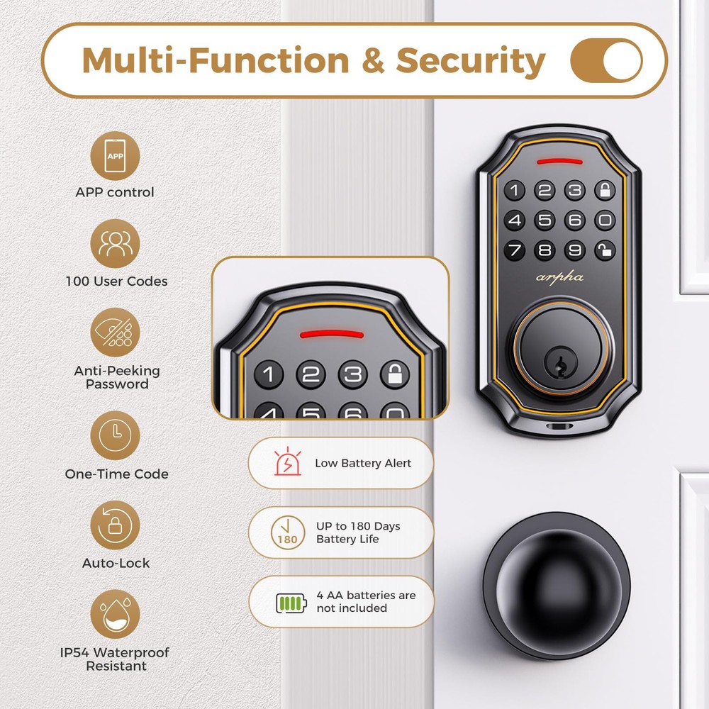 Keyless Entry Door Lock: keyless entry door lock could be unlocked via App + Password + EKey + Mechanical key. Smart deadbolt supports 100 groups of access codes for the front door, including 97 users and 3 admin passcodes. Everything you need in 1 safe and secure smart lock. App Control: User could generate and share -time, permanent, scheduled, and recurring code with your family, house sitters and guests. Manage users, and view access records in the app management system. The App is no additional charge and can be used forever. App remote unlocking requires the use of a gateway : B09YHFG933 Auto Lock and Touch Lock: Electronic keypad door lock is designed with a smart -touch switch. Keypad door lock offers -touch lock feature to control the door easily. You can enable the auto-lock feature and set the timer from 10s-30min! Now you don't need to worry about forgetting to lock the door. Anti Peeping Password: keyless entry door lock deadbolt with handle set supports 16-digit virtual password unlocking method. Users could unlock by entering 10 to 8 digits before or after setting a 6 to 8 digit password. Add random numbers before or after your correct passcode to protect it from prying eyes. Long Battery Life: Keypad door lock supports 4 AA batteries. **Batteries would not be included in the package.** Digital door lock could be used for around 180 days without frequent battery . Easy to Install and Programme: keypad code door lock fits for most US standard left and right hand doors. You can easily install it in a few minutes without drilling. VIDEO GUIDE will walk you through the whole setting process. ๐„๐ฑ๐œ๐ž๐ฉ๐ญ๐ข๐จ๐ง๐š๐ฅ ๐’๐ฎ๐ฉ๐ฉ๐จ๐ซ๐ญ & ๐€๐ฌ๐ฌ๐ฎ๐ซ๐š๐ง๐œ๐ž: Our dedicated support team is available 24/7 after-sales service to assist you.offers a 30-day money-back and 18 monthassurance and technical support, Please do not hesitate to tell us if you need ourhelp.