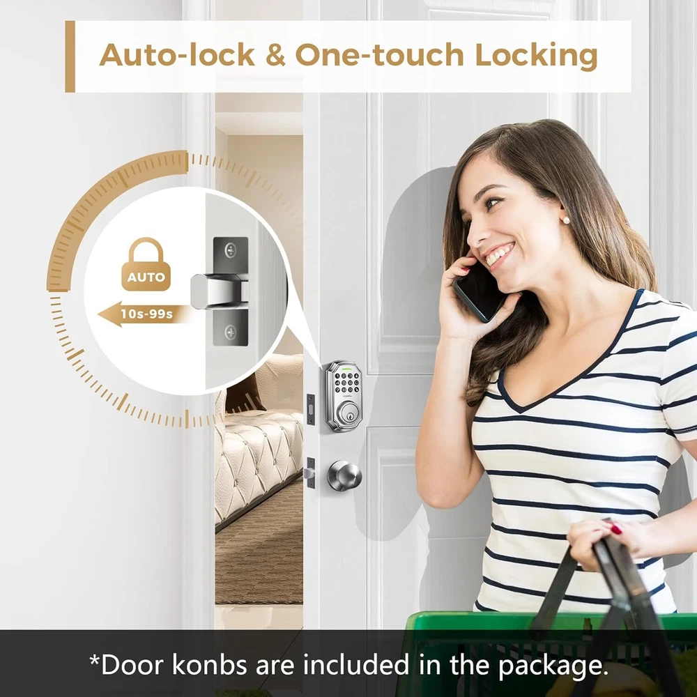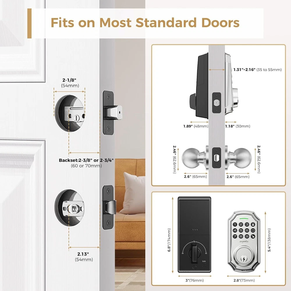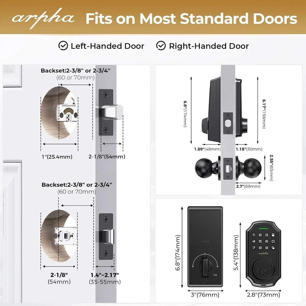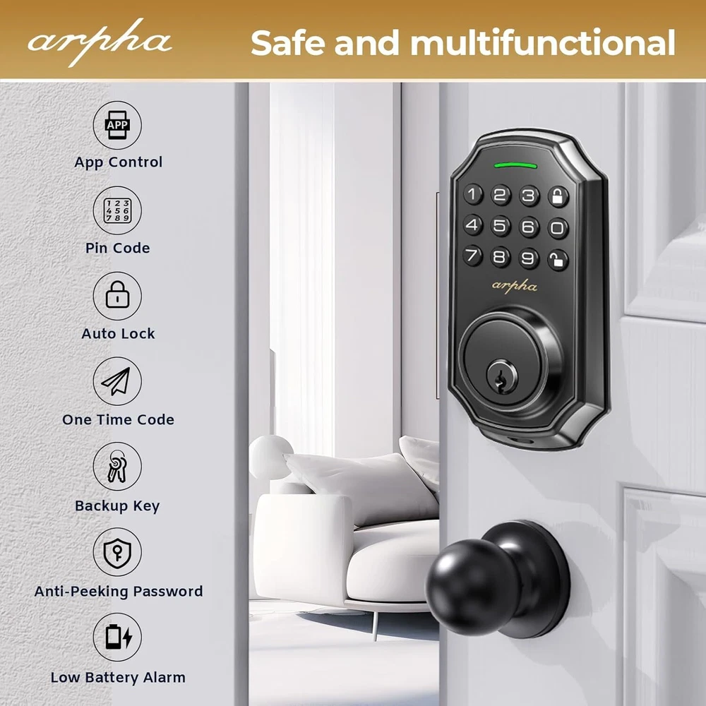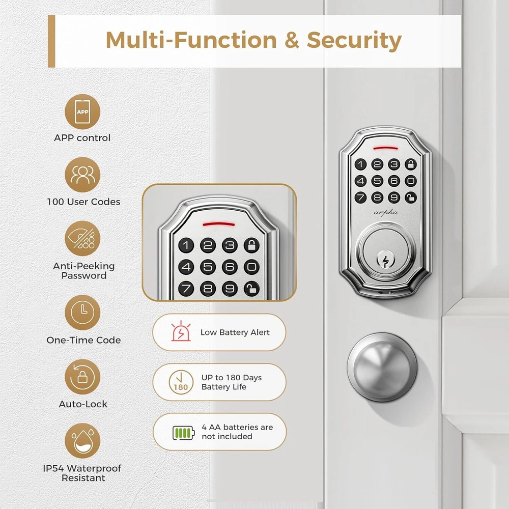 Keyless Entry Door Lock: Arpha keyless entry door lock could be unlocked via App + Password + EKey + Mechanical key. Smart deadbolt supports 100 groups of access codes for the front door, including 97 users and 3 admin passcodes. Everything you need in 1 safe and secure smart lock. App Control: User could generate and share one-time, permanent, scheduled, and recurring code with your family, house sitters and guests. Manage users, and view access records in the app management system. The App is no additional charge and can be used forever. App remote unlocking requires the use of a gateway ASIN: B09YHFG933 Anti Peeping Password: keyless entry door lock deadbolt with handle set supports 16-digit virtual password unlocking method. Users could unlock by entering 10 to 8 digits before or after setting a 6 to 8 digit password. Add random numbers before or after your correct passcode to protect it from prying eyes. Auto Lock and One Touch Lock: Electronic door lock is designed with a smart one-touch switch. Keypad door lock offers one-touch lock feature to control the door easily. You can enable the auto-lock feature and set the timer from 10s-30min! Now you don't need to worry about forgetting to lock the door. Long Battery Life: Keypad door lock supports 4 AA batteries. **Batteries would not be included in the package.** Digital door lock could be used for around 180 days without frequent battery replacement. Easy to Install and Programme: Arpha code door lock fits for most US standard left and right hand doors. You can easily install it in a few minutes without drilling. VIDEO GUIDE will walk you through the whole setting process. Exceptional Support and Assurance: Our dedicated support team is available 24/7 after-sales email service to assist you.Arpha offers a 30-day money-back and 18 monthassurance and lifetime technical support, Please do not hesitate to tell us if you need ourhelp.