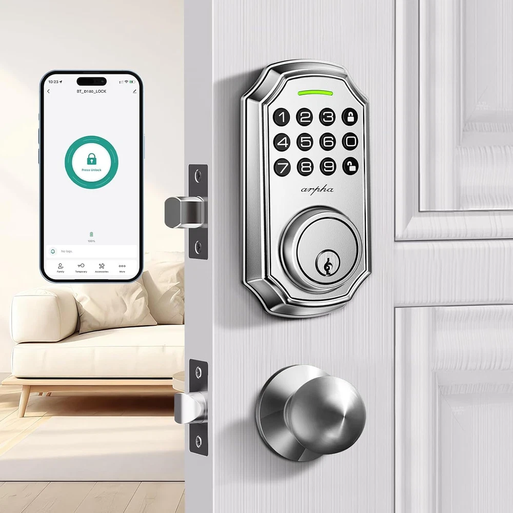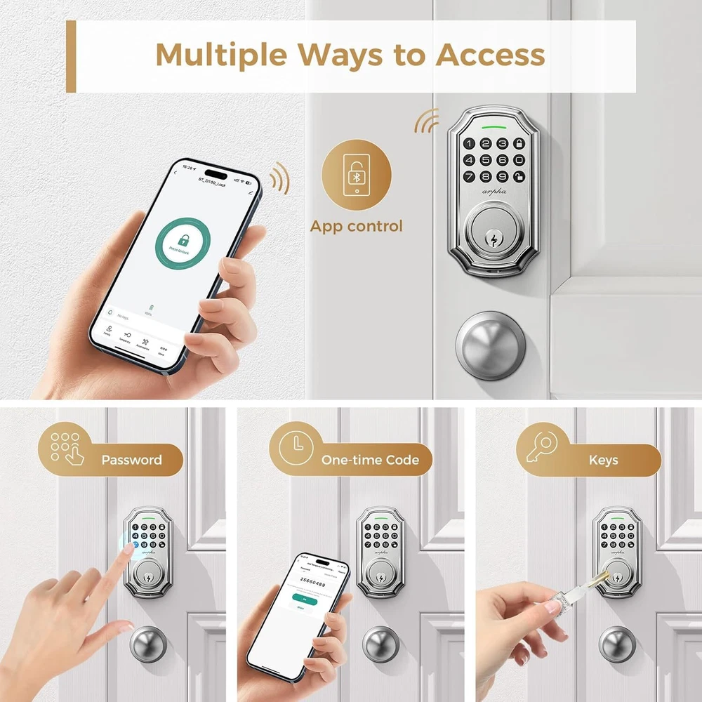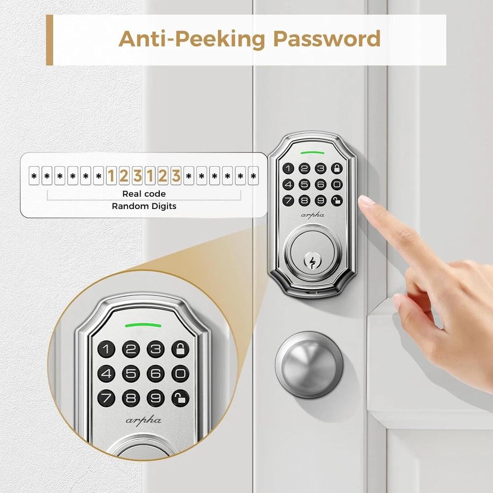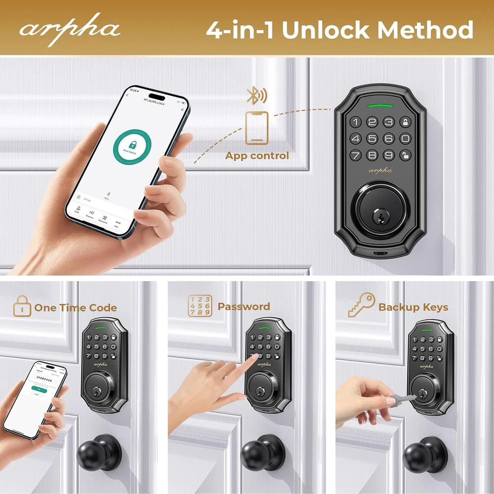 Keyless Entry Door Lock: Arpha keyless entry door lock could be unlocked via App + Passwor Easy to Install and Programme: Arpha keypad code door lock fits for most US standard left and ri Anti Peeping Password: keyless entry door lock deadbolt with handle set supports 16-digi Brand: ARPHA Auto Lock and One Touch Lock: Electronic keypad door lock is designed with a smart one-touch sw App Control: User could generate and share one-time,permanent,scheduled,and re Long Battery Life: Keypad door lock supports 4 AA batteries. **Batteries would not b