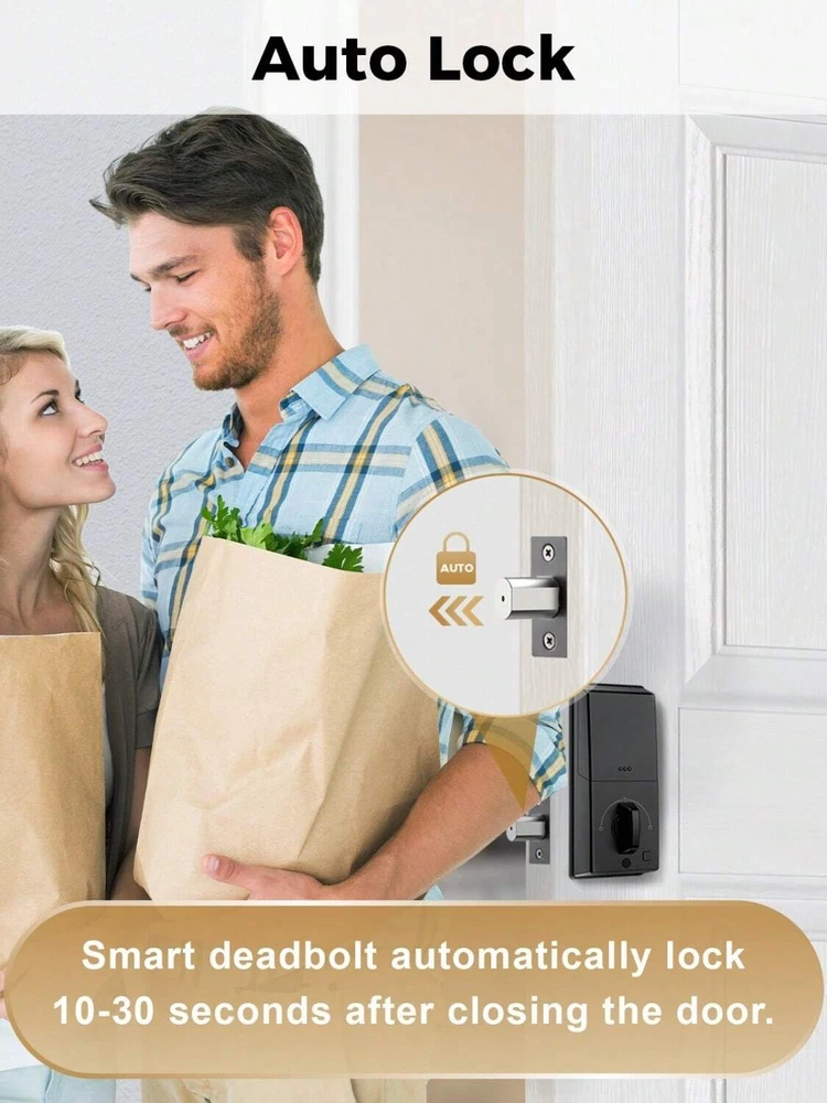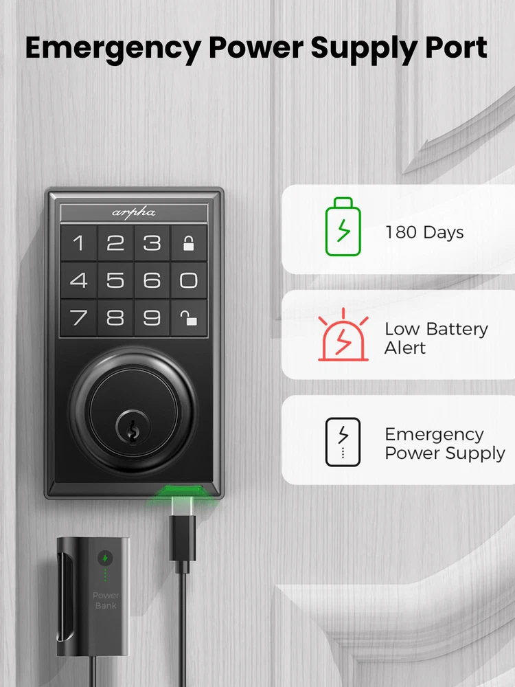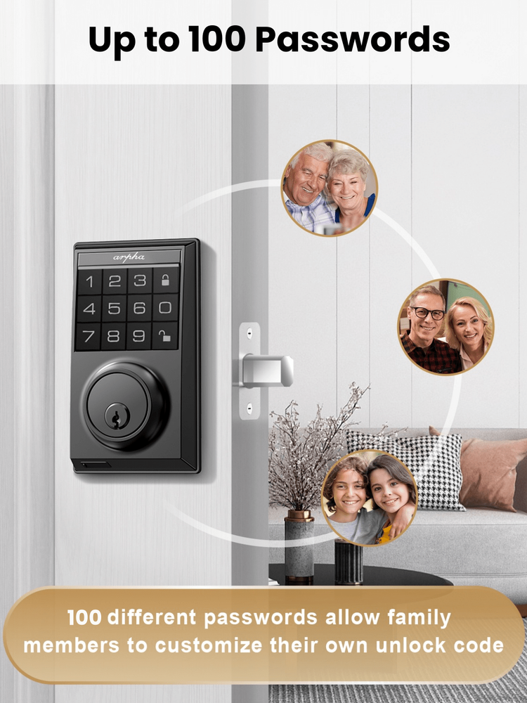 Up to 100 User Passwords: With our keypad deadbolt, you can effortlessly create and manage up to 100 user passwords, comprising 3 administrators and 97 users. This expansive feature allows you to securely manage access for family, friends, employees, and more. Whether for residential or commercial use, our digital door lock provides the flexibility and convenience you need to control who enters your space! Anti-Peeping Password: Boost your door locks for the front door with added protection! Our enhanced password setup allows users to add extra digits before and after entering the 6-10 digit real password to unlock the door, with a maximum of 16 digits. Smart locks for front doors are suitable for various settings including hotels, apartments, homes, offices, and shops. Auto Lock & One Touch Lock/Unlock: Experience the ultimate convenience with our electronic door lock customizable auto-lock feature - set to lock after 10 seconds by default, with an optional 20 or 30 seconds delay. Plus, enjoy seamless control with one-touch locking/unlocking, and whether you're coming home or leaving, our smart deadbolt lock combines convenience and security that's always at your fingertips. Suitable for Indoor/Outdoor: The electronic door lock is made of zinc alloy; IP54 waterproof (lightly sprinkled, can not be placed in heavy rain), fully operating temperature between -13℉and 140℉ (Please note, do not exceed this temperature use). In addition, the bedroom door lock can be adjusted to unlock in silent mode. Effortless Installation: Arpha keyless deadbolt can be easily installed in minutes with a screwdriver. Universally compatible, this door keypad locks seamlessly fits both left and right door orientations. The deadbolt lock accommodates door thicknesses ranging from 1-3/8" to 2-1/8" (35mm - 55mm), with lock edge distances of 2-3/8 inches (60mm) and 2-3/4 inches (70mm). Color: Black Power Supply: Battery Powered(Others Battery) Batteries Included: No