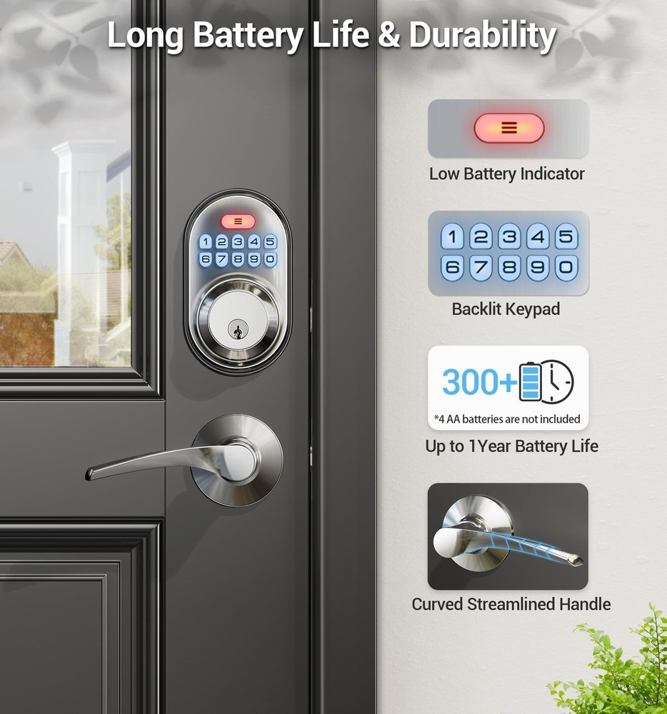 Keyless Entry: Stores twenty permanent PIN codes, retains backup keys, and generates a -time code for guests that automatically deletes after use Quick Locking: Set the door lock to automatically lock within 10-99 seconds. Press any key for seconds to instantly lock from outside Keypad Door Lock with Handle: Features a deadbolt with matching lever handles, backlit keypad, low battery alerts, silent mode, and vacation mode. Waterproof design complements traditional and modern homes Long-Lasting Home Protection: ANSI 3 certified construction with sturdy alloy materials. Powered by four AA batteries (more than year operation in all weather conditions) Easy Installation: Install and program within minutes using a screwdriver. with standard US left and right-opening doors offers at least a 1-year product , online support from Monday to Friday, 9 AM to 5 PM PST, and 24/7 after-sales service