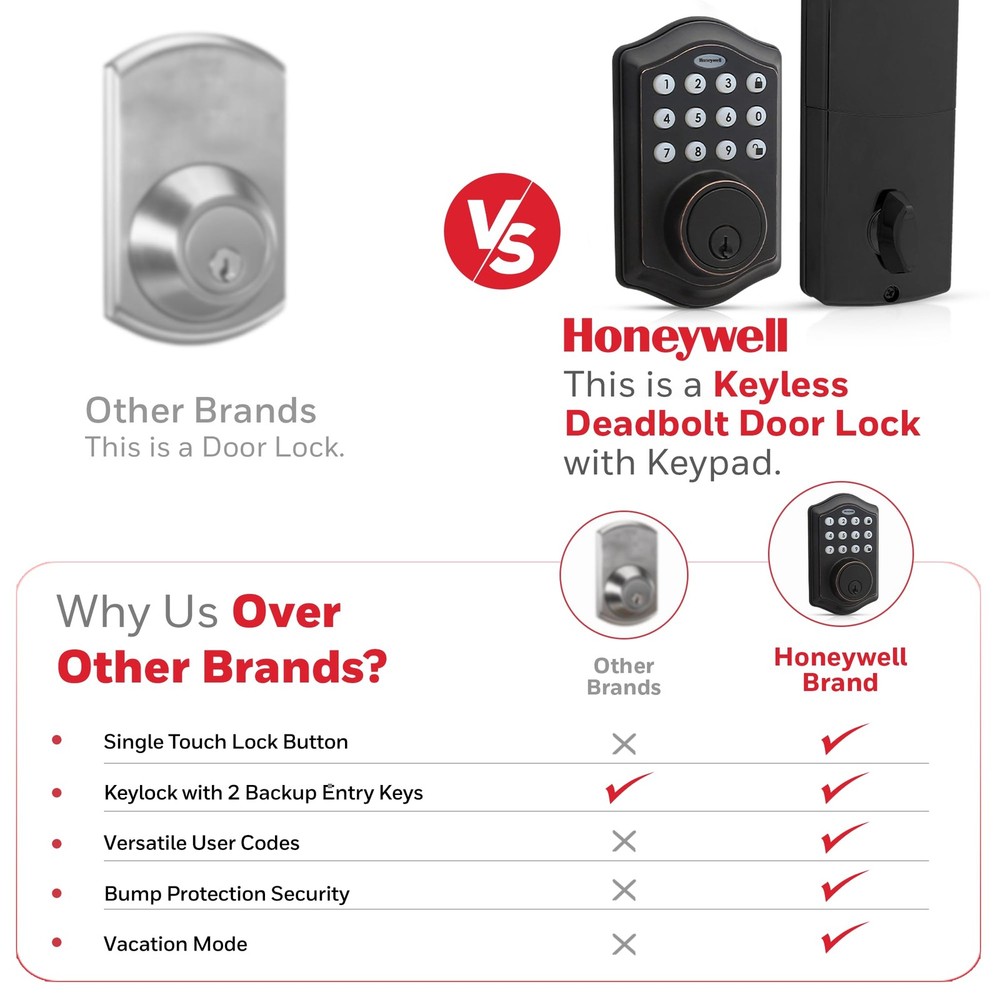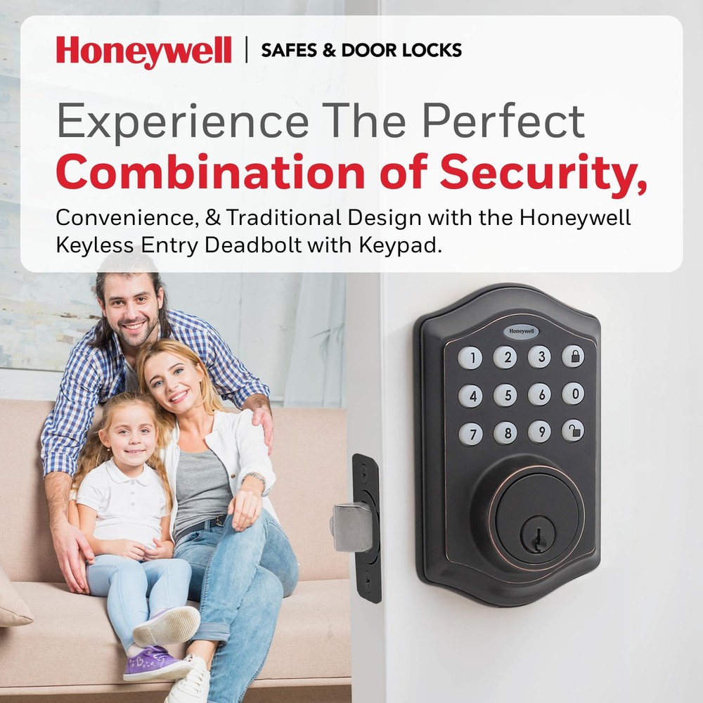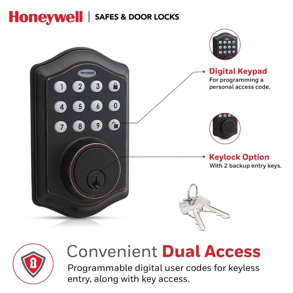 DIGITAL DOOR LOCKS - install in minutes with pre-drilled holes in the door, all you need is a Philips screwdriver!.Note: Measure your door's backset, cross bore and thickness to ensure you find the right fit. FEATURES - oil rubbed bronze brass electronic deadbolt suits a range of doors and home decor styles. Requires 4 "aa" alkaline batteries VACATION MODE - system into a low power state, disabling all buttons and functions until reactivated SECURE - a convenient -touch locking system, 50 programmable user codes, and an alarm that sounds after four incorrectly entered codes. TRUSTED COMPANY - Honeywell digital door locks provide for your home with a convenient keyless entry function.