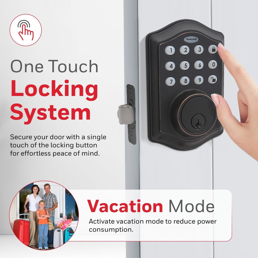 Honeywell electronic digital deadbolts feature traditional key access as well as the ability to unlock with a Programmable 4 to 8 digit user code (keyless entry). These Honeywell locks allow the owner to program up to 50 different user codes and delete them as desired. The Honeywell oil rubbed bronze electronic digital deadbolt allows you to set an automatic lock function that will return the deadbolt to the locked position at a programmed amount of time after the lock is opened. There is also a vacation mode that puts the system into a low power consumption state and disables all buttons and functions until the programmer chooses to reactivate the lock. The lock features bump protection, an installation hardware kit and 2 keys, a single cylinder deadbolt, and is easy to install with PHILLIPS head screwdriver. The battery requires 4 'aa’ alkaline batteries (not included). LH Licensed Products, Inc. leverages premium consumer brand power to deliver innovative solutions for unmet and emerging consumer needs around the world. Our products are currently available in over 70 countries across the globe. LH Licensed Products, Inc. is the exclusive licensee and manufacturer of Honeywell Safes, Paper Shredders and Door Locks. Our partner company, Lewis Hyman Inc. began in 1930 as a family window treatment business in New York City. Widely recognized for lifestyle product innovation, Lewis Hyman Inc. has established a tradition of quality and service, spanning three generations and over eighty years of expertise. DIGITAL DOOR LOCKS - install in minutes with pre-drilled holes in the door, all you need is a Philips screwdriver!.Note: Measure your door's backset, cross bore and thickness to ensure you find the right fit. FEATURES - oil rubbed bronze brass electronic deadbolt suits a range of doors and home decor styles. Requires 4 "aa" alkaline batteries VACATION MODE - system into a low power state, disabling all buttons and functions until reactivated SECURE - a convenient -touch locking system, 50 programmable user codes, and an alarm that sounds after four incorrectly entered codes. TRUSTED COMPANY - Honeywell digital door locks provide for your home with a convenient keyless entry function.