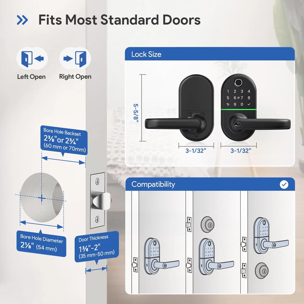 Smart Door Lock with Handle for Front Door Features: 1. Multiple inteligente access from outdoor: Use our app via Bluetooth, thumbprint, touchpad smartcode, IC card, or keys. 2. Easy DIY installation: Quickly replace the latch or deadbolt of your existing door locksets. 3. Biometric fingerprint sensor: Use your thumb to access your home by placing your finger on the sensor and print. 4. Electronic touch keypad: Comes with upgraded anti-peeping password function and supports input of 6-9 digital numbers. 5. Fits most American front doors, exterior doors, interior doors, and more. 6. Smartkey technology: Copy your keys in the US if you need more. 7. Automatic locking function: The door will auto lock after you close it. 8. Wi-Fi enabled: Connect to a Wi-Fi network with a Wi-Fi hub (not included) to remotely control your door lock from anywhere. Ease of Installation: Fits 99% of American front wooden doors. Our smart handle lock can be installed in minutes using just a screwdriver. No extra drilling required. It is suitable for both left and right-handed doors.. Our compact and secure keypad lock is designed to give you and your family an outstanding user experience. 7 in 1 Keyless Door Lock with Handle: Upgrade your front door with 7 different unlocking ways - fingerprint recognition, Bluetooth app control, keypad password, key fob, physical key, remote unlocking, and Alexa voice commands (Gateway required). Offer personalized access for your children, elderly, and other family members, eliminating the worries of lost or stolen keys. Remotely Control Anywhere(Gateway required): No worry about the bluetooth distance. No need to worry about multiple users logging in the conflict at the same time, causing failed unlocking. With the gateway paired into app, share permanent, temporary, or scheduled access with friends and family. Check real-time access logs from anywhere. Voice Control(Gateway required): You can connect to Alexa and Google Home voice assistants to control your lock with just a command. Simply say the word, and the lock will unlock. Elevate your smart living with the smart lock. Satisfaction Service: door lock provides durability and style. With a 30-day money-back, 1-year product coverage, and lifetime after-sales support, you can trust your investment is protected. Get the ultimate safe solution for your home today!