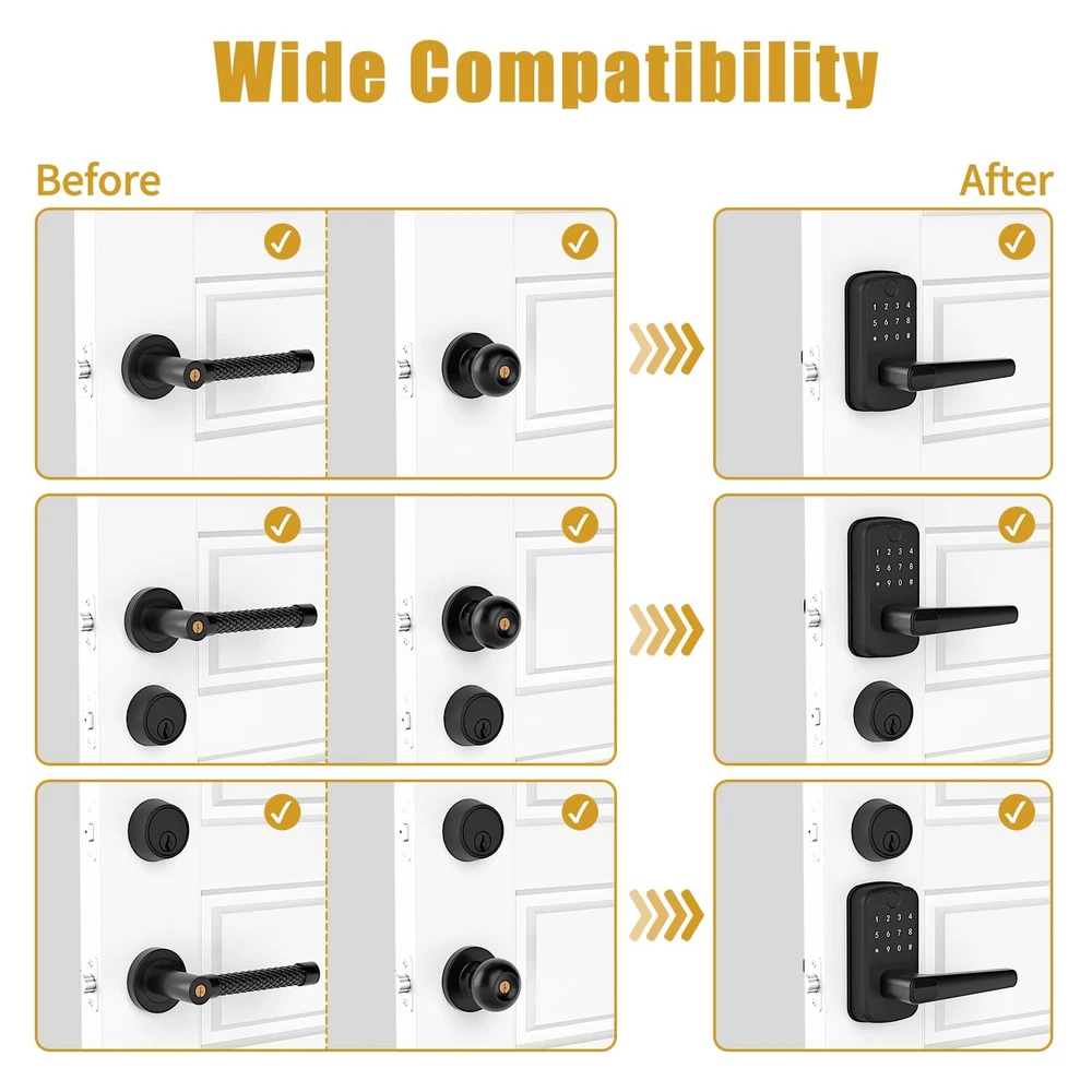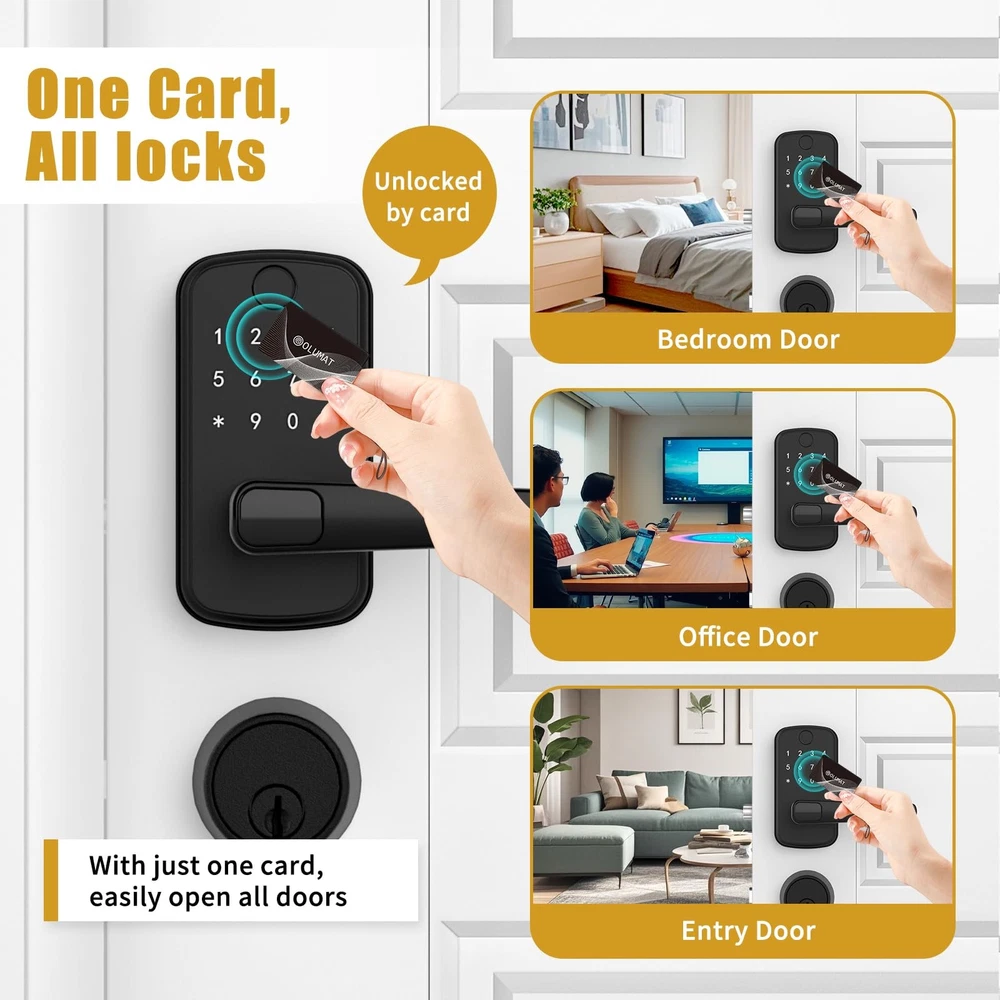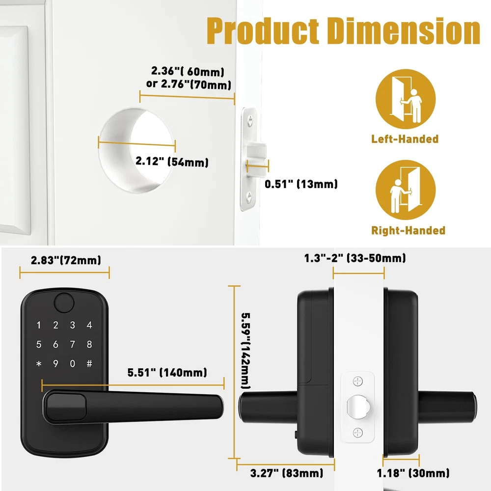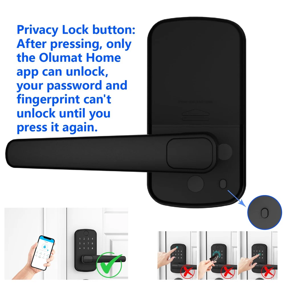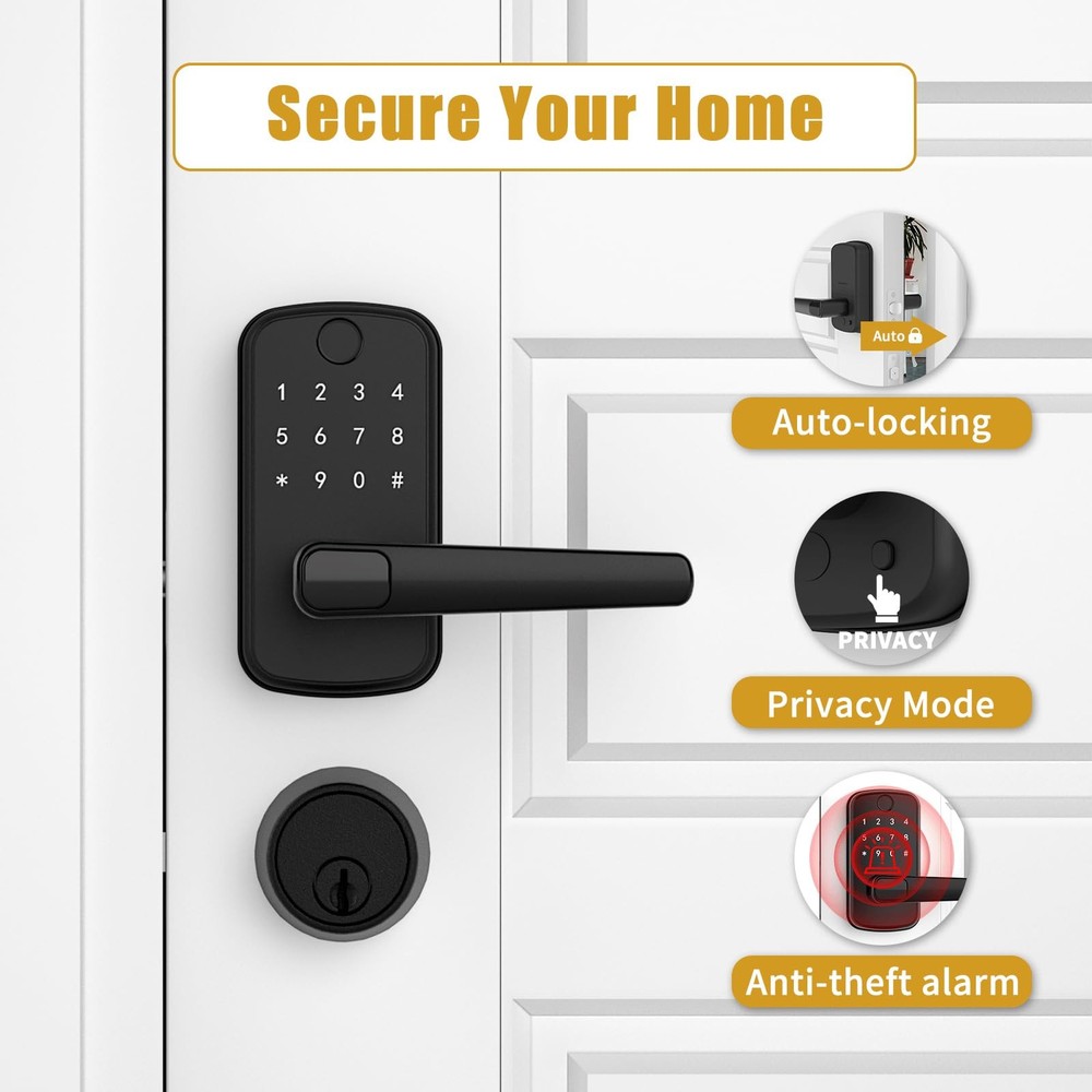 Smart Door Lock with Handle: Keyless Entry Door Lock with Keypad, Fingerprint, and App Control - Biometric Door Lock for Home Security - Easy Installation 6-in-1 Versatile Unlocking Methods: Unlock your door with ease using fingerprint recognition, a Bluetooth-enabled mobile app, personalized PIN code, key fobs, mechanical keys, or even voice commands through Alexa (requires WiFi gateway) Energy-Efficient Design: Wake up the keypad with a simple hand swipe for enhanced energy efficiency. Four AA batteries last longer, reducing environmental impact Hassle-Free Installation: Install in just 10 minutes on most standard U.S. wooden front doors with no extra drilling needed. The reversible handle fits both left and right-handed doors perfectly Smart Access Management: Use the mobile app to grant permanent or temporary access, create one-time PIN code for visitors, and monitor unlock records remotely with ease Perfect for Property Managers: Ideal for landlords, Airbnb hosts, and property managers, this smart lock allows you to manage multiple properties effortlessly through a single app or web-based management system