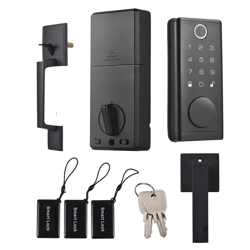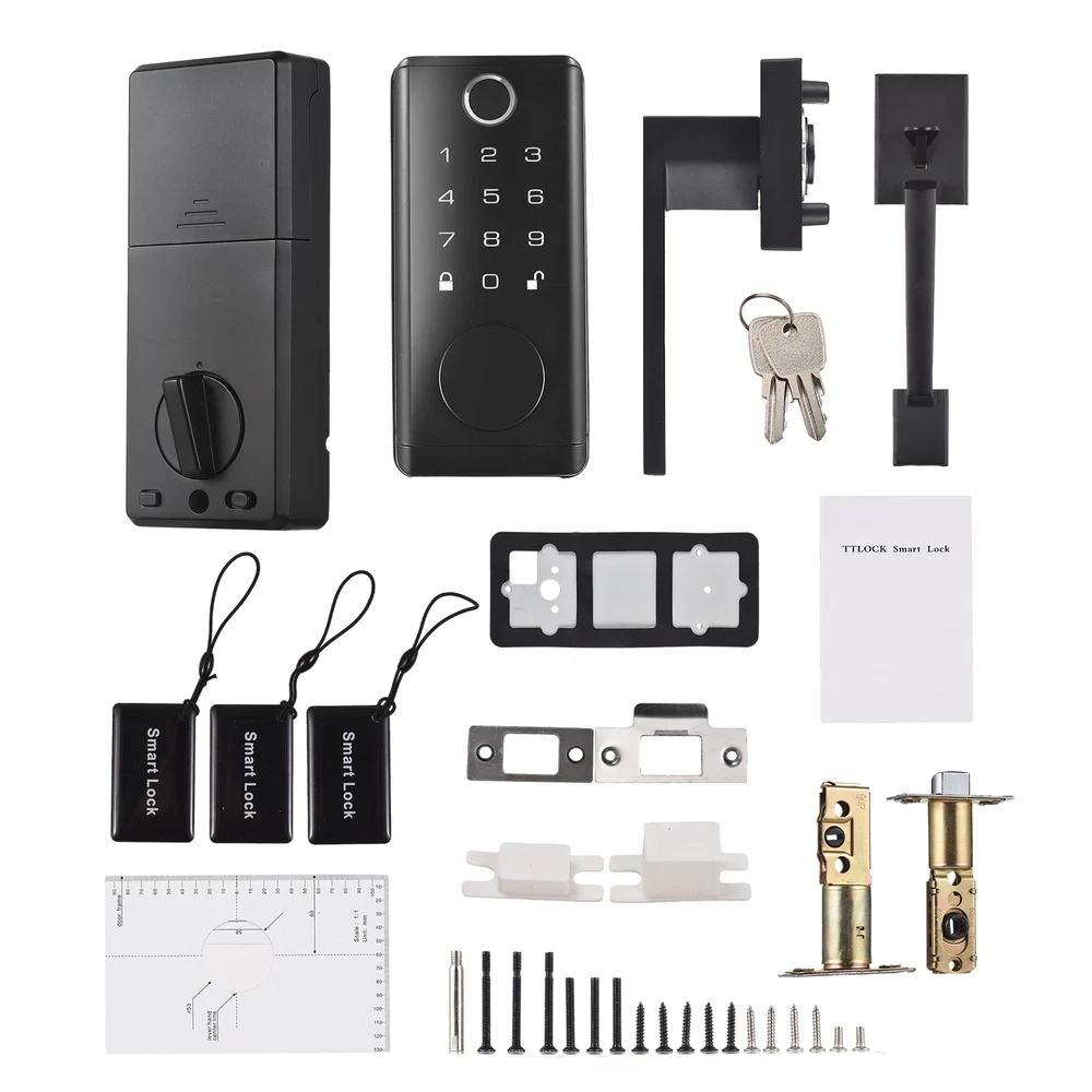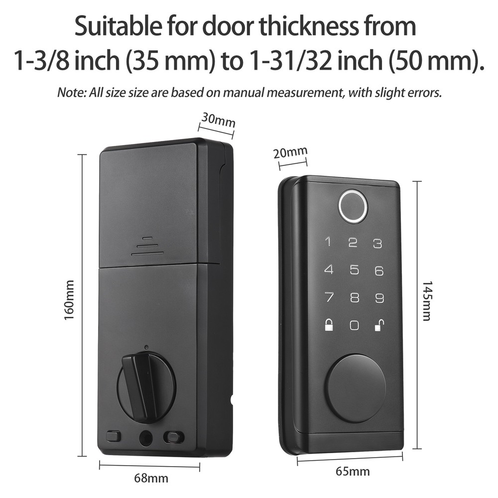 Keyless entry door lock with built-in Wi-Fi allows fingerprint, smartphone APP, digital code, IC card and keys to enter. Allows to create and manage up to 150 access codes and 100 access fingerprints, and temporary access for visitors. Built-in alarm technology low battery warning. Zinc alloy anti-pry lock body, suitable for door thickness from 1-3/8 inch (35 mm) to 1-31/32 inch (50 mm). Features: 【Smart Lock with 5 Entry Method】 Keyless entry door lock with built-in Wi-Fi allows fingerprint, smartphone APP, digital code, IC card and keys to enter. Convenient APP remote control and more secure biometric fingerprint recognition. 【Support Temporary, Multi-person and Multi-scenario Use】 Smart door lock allows to create and manage up to 150 access codes and 100 access fingerprints, and temporary access for visitors. Widely used for home entry door, hotel, office, ect. 【Safety Alarm】 Electronic door lock built-in alarm technology. It will alarm if anyboby enter the wrong password multiple times. Support Battery operated and USB emergency charging, while the low battery indicator offers advanced warning for battery replacement. 【Anti-theft Security Deadbolt Lock】 Security door locks with strengthened and thickened zinc alloy anti-pry lock body, no fear of violent lock collision and lock picking, anti-peeping user code protection, locked automatically when close the door, effective home protection and anti-theft. 【Easy to Install with Complete Accessories】 Keypad door lock with handle set are easy to install with full accessories,you just need to prepare a screwdriver and 4*AA batteries(package not include). Suitable for door thickness from 1-3/8 inch (35 mm) to 1-31/32 inch (50 mm). Specifications: Material: ABS + zinc alloy Product color: Black Waterproof: IP67 Fingerprint recognition: ≤0.5s False recognition rate: ≤0.001% True rejection rate: ≤0.01% Fingerprint storage: 100 sets Code storage: 150 sets Unlock method: Fingerprint, code, BT, card, key Charging method: 4*AA battery(not include) Package Size: 39 * 26.3 * 9cm / 15.3 * 10.3 * 3.5in Package Weight: 2.06kg / 4.5lbs Packing List: HB0234 1 * Front lock 1 * Rear lock 1 * Front door handle 1 * Rear door handle 2 * keys 3 * Cards 1 * Installation tool set 1 * Instructions 1 * Installation size card