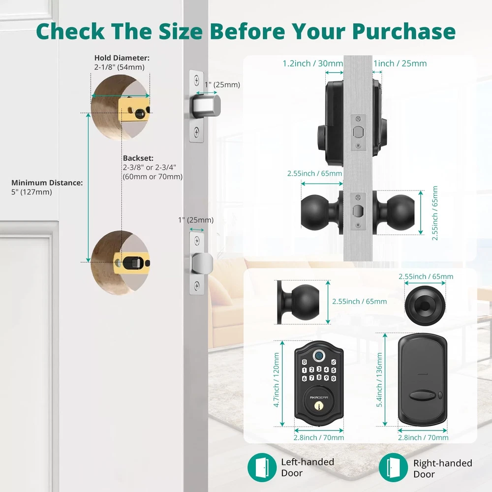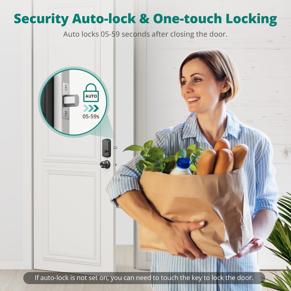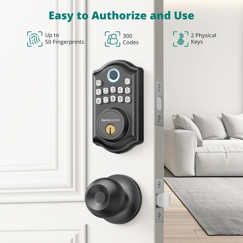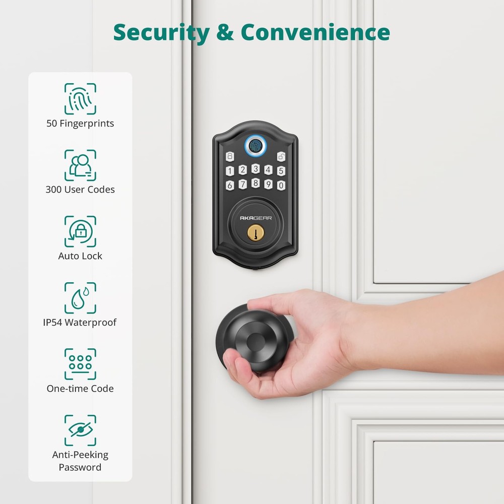 Multiple Unlocking Options: This keyless entry door lock solves the problem of being unable to open the door due to forgetting keys. You can use your fingerprints, electronic passwords, or backup keys to unlock, which is very convenient. Secure Fingerprint Unlock: The biometric fingerprint identification technology enhances security and allows users to unlock the door in one second without keys or cumbersome passwords. The smart door lock can store up to 50 user fingerprints, recognizing your fingerprint in just 0.3 seconds for effortless unlocking within 1 second. User-Friendly of Keyless Entry: 's DS10 fingerprint smart door lock offers unparalleled convenience and security features. With up to 50 user fingerprints and 300 access codes, create temporary codes for guests. Additionally, it comes equipped with two spare keys for family members, further enhancing accessibility and peace of mind. Convenience and Security: Easily lock the door with a button without a key, streamlining the locking process. Set the automatic locking to activate within 5-59 seconds, ensuring property security even if manual locking is overlooked. Long Battery Life & Backup Power: With low power consumption, 4 AA batteries can operate for a year or up to 7,000 cycles, eliminating the need for frequent battery changes and saving time. The door lock features a low-battery alert. If the lock runs out of power, simply recharge it with backup power. Note: 4 AA batteries are not included. Voice Guidance: The DS10 smart door lock with 2 door knob handle set enhances traditional operation guides with the addition of voice guidance functionality. This innovative feature provides clear instructions to help users unlock or adjust settings accurately. By offering this capability, users can swiftly and precisely set up and operate the door lock, improving their overall user experience. Additionally, if the user finds the voice prompts too loud, they can easily disable this feature according to their preferences. Easy to Install: With just a screwdriver, set up your lock in a few minutes for all US standard left and right-handed doors. No need to select the correct version; automatic recognition guarantees seamless operation without manual adjustments.
