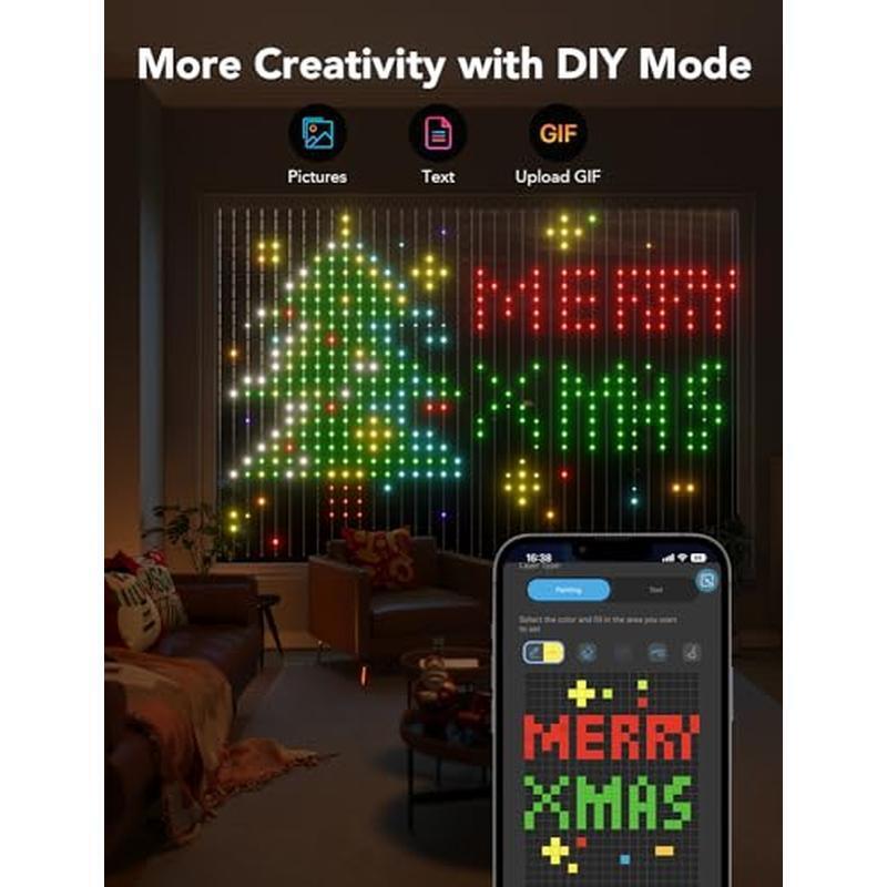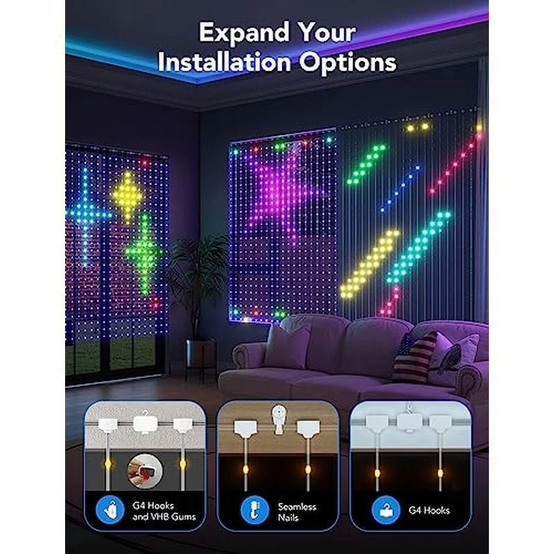 You may also like Waterproof Anti-Allergen Mattress Protector Anti-microbial Zippered Closure Twin 19.19 USD Free shipping Porcelain Dinnerware Set 16 Pc Service 4 Scratch Resistant Plates Bowls Mugs New 48.15 USD Free shipping Non Stick Baking Sheet Set W/ Gold Cooling Rack Baking Roasting Cookies Pastries 19.91 USD Free shipping Neon Y2K Bead Mix Alphabet Rainbow Acrylic Beads Jewelry Craft Party Activity US 11.6 USD Free shipping Foldable Utility Cart Portable Rolling Crate Handcart Plastic Telescoping Handle 75.32 USD Free shipping Adjustable Weight Bench Foldable Workout Benches Home Gym Strength Training New 46.45 USD 39.99 USD Brushed Nickel Bathroom Faucet Centerset 2 Handle Ceramic Disk Valve Drip Free 62.3 USD Free shipping 4 Pack Microfiber 360-degree Spin Mop Replacement Heads Machine Washable Indoor 19.13 USD Free shipping Large Multi-Level Cat Tree W/ Scratching Posts Condo Hammock Perch Toy Cats New 73.49 USD Free shipping 64oz Blender Container Compatible W/ Portion Systems Drink Machines BarBoss New 69.1 USD Free shipping Dual Surface Non-Slip Rug Pad 1/4 In Thick Durable Cushioning Safe All Floors 83.45 USD 39.99 USD Simple Writing Desk W/ Side Shelves Compact Computer Table Minimalist Design New 69.95 USD Free shipping About this item Gorgeous Pattern Displays: Newest app version supports Music Mode to link with up to 2 or 3 sets. These Govee Wi-Fi curtain lights are 4. 9 x 6. 6 feet and contain 520 light beads, allowing for a higher pixel density. Suitable for Home or Moment decorations. DIY Your Canvas: With 5 canvas layers, add more dimension to your lighting effects with Govee LED Curtain Lights. You can also upload pictures and GIFs for a fun animated decoration to complete your space. Note: GIF function only works with one set. 107+ Dynamic Scene Modes: Amplify the coolest vibes for Christmas or special occasion likes party decorations. Whether you're in charge of a local festival, hosting a party, or looking for extra lighting for wall decorations, these curtain lights are a nice choice. Enhanced Music Mode: Make your space the life of the party with our animated Music Mode, which allows your playlists to sync with the DIY curtain string lights. You can also use DreamView to sync the rest of your Govee lights for window decor. Easy to Install: There are multiple ways to install these IP65 waterproof outdoor curtain lights. Use the included adhesive tape, seamless nails, or hooks to place the Govee smart lights in bedrooms, gaming rooms, outdoor patios, living rooms, and more. Free Your Hands: When you're away from home and want to leave a surprise for a friend or loved one, you can remotely control these LED curtain lights via Govee Home App. You can use Govee Home App to adjust brigtness from 1%-100% or use voice control via Alexa/Google Assistant. › product details Color:White Brand:Govee Indoor/Outdoor Usage:Indoor Special Feature:Corded Light Source Type:LED Power Source:Corded Electric Light Color:Multicolor : : : You may also like Vinyl Record Mailers 1-4 LP Cardboard Shipping Boxes 50 Pack Multi-Depth White 55.06 USD Free shipping 2 Pack Long-lasting Flashlights High Lumens Weatherproof Rechargeable Flashlight 24.29 USD Free shipping Lightweight Foldable Side Table Durable Resin Perfect Camping Patio Small Spaces 23.71 USD Free shipping Self-Cleaning Dual Nozzle Non-Electric Bidet Attachment Toilet Seat Adjustable 53.89 USD Free shipping Durable Hardside Carry-On Luggage 20 In Spinner Wheels Travel Ergonomic Handle 324.99 USD Free shipping Small Moving Box 15 Pack Pre-Printed Labeling Cardboard 16.5 x 12.25 x 12.63 In 55.11 USD Free shipping Silicone Electric Warming Mat W/ 9 Temp Levels Timer Auto Shut-Off Food Heating 38.27 USD Free shipping Large Waterproof Outdoor Flameless Candles W/ Remote Control Timer Set 2 Pcs New 35.77 USD Free shipping 40" Tower Fan Remote Control 3 Speed Settings LED Display Bedroom & Office Use 86.44 USD Free shipping 3-Gal Sprayer Fertilizers Herbicides Pesticides Anti-Clog Wand Hose Adjustable 56.8 USD Free shipping Shower Mirror Fogless Shaving Flat Anti Fog W/ Razor Holder Bathroom Accessories 20.19 USD Free shipping Foldable Weight Bench Press 660LBS Incline Decline Home Gym Sit-Up Training New 73.49 USD Free shipping