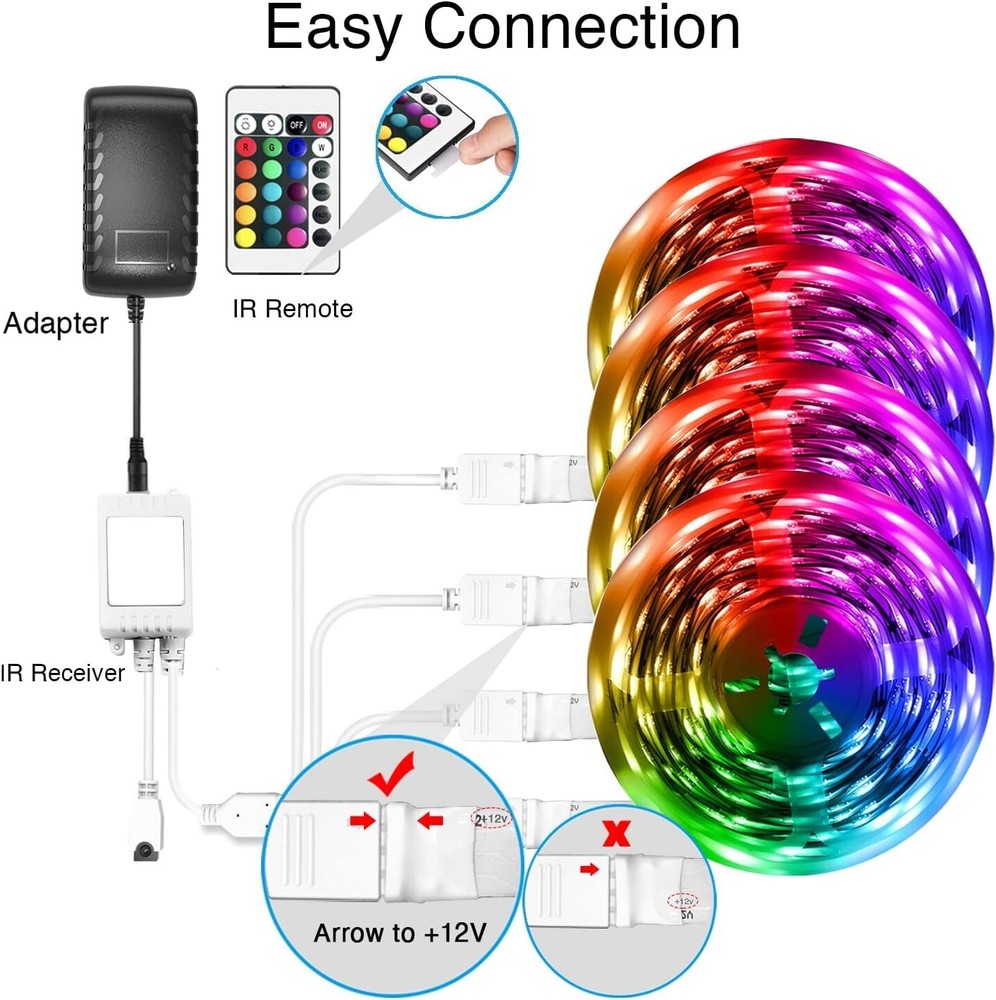 Led Strip Lights Smart with App Control Remote, 5050 RGB for Bedroom, Music Sync Color Changing for Room Party 200 ft 4 Rolls of 50 ft Smart app control, ir remote control: The 200 feet led strip lights support both app and 24 keys ir remote for control, which allow you change the led lights color and modes are conveniently for bedroom, ceiling, kitchen, living room, and party decoration Easy installation: The led strip lights 200 feet, 4 rolls of 50 feet, ultra long is enough to reach around your entire bedroom and light up the whole home for party, wedding indoor Music sync: Led lights strip color changing sync to music by smart with App, make your party up to the high peak, light up your life and makes life more colorful and wonderful Smart timing settings: With timer function, the rgb led strip lights allow you to pre set time to turn on off led lights and change color at certain times, just enjoy it in a smart way Led lights features: Our rgb led chips allows the led lights to be very colorful and durable. The remote can dim the led light strip and offer different colors and modes by remote