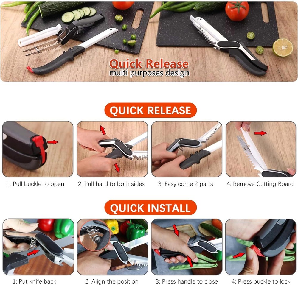 Smart Vegetable Slicer Cutter Kitchen Cutting Board Scissors Large, Black Product Details Color: Black Material: Stainless Steel, Plastic Brand: XGIZMOO Blade Material: Stainless Steel Product Dimensions: 10.63"L x 2.7"W Style: Modern Item Weight: 289 Grams Blade Length: 4.53 Inches Blade Edge: Straight, Wave Finish Type: Brushed Hand Orientation: Ambidextrous Unit Count: 1.0 Count Number of Items: 1 Manufacturer: XGIZMOO Item Weight: 10.2 ounces Country of Origin: China Item model number: cutting board scissors knife combo Size: Large Finish: Brushed Included Components: cutting board scissors slicer, straight edge kitchen knife, fish scale remover with bottle opener, wave edge kitchen knife, Cutting Board Batteries Required?: No Color: Black Material: Stainless Steel, Plastic Brand: XGIZMOO Blade Material: Stainless Steel Product Dimensions: 10.63"L x 2.7"W Smart Quick Release/Install Kitchen Scissors -- The kitchen cutting board scissors are easy came apart to knife(straight and wave edge knife replacement), cutting board, sawtooth fish scale remover, and easy install back, very clever and easy use to save time; Multi Purpose Cooking Cutting Board Knife Combo -- The vegetable scissors is a multi-functional kitchen must have chopper, good for cut melons, veggie, fruit, potato, tomato, carrot into slices for making food or salad; Come apart sharp knife for cutting food, fruits, vegetable, meat, fish; Sawtooth blade for removing fish scales, and loosen/soften meat block, and forking meat to barbecue; Of course including bottle opener; Really a best kitchen shears for home kitchen and outdoor culinary dinners; Food Scissors Using Security -- The safety latch at the tail of smart scissors for closing the kitchen scissors; When carried and not using, it can ensure that it will not harm the human body. The most convenient is that vegetable scissors can be cleaned in the dishwasher after locking; Ergonomic Design and Material: The food chopper scissors grips are based on the ergonomic design that will comfort your hands and finger, easy use for left handed and right hand; And sharp cutting part made of high quality stainless steel; Environmentally friendly PP handle; Environmentally friendly resin cutting board; Great Gift Idea -- The multipurpose vegetable scissors make cooking easy and enjoyable, and great gift for friends and family, or your wife/husband/mother chef.