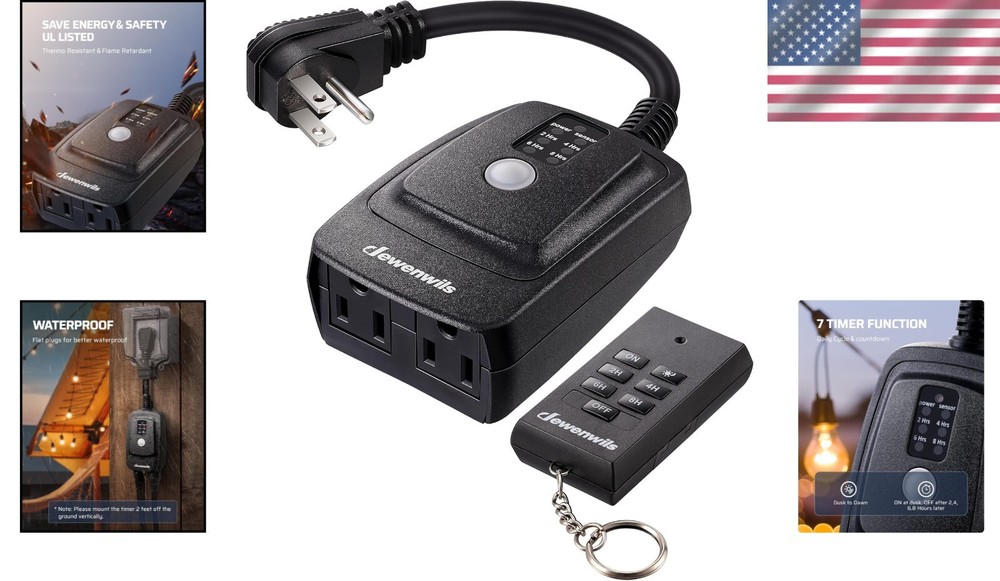 Brand: Unbranded Upper Temperature Rating: 140 Degrees Fahrenheit Maximum Amperage: 15 A Port Type: Power Smart Home Protocol: X-10 Circuit Type: Remote Room: Outdoor Model: Outdoor Light Timer Item Width: Outdoor Light Timer Item Height: Outdoor Light Timer Controller Type: Rf Remote Control Current Rating: 15 A Control Method: Remote Application: Home/Garden, Outdoor, Electrical Wiring Electrical Connection: Plug-In Type: Timer Wall Switch Current Type: AC Orientation: Horizontal Number of Switches: 1 Item Dimensions L X W X H: 7 X 5.2 X 2.1 Inches Number of Gangs: 1 Material: Plastic, PBT Box Shape: Rectangular Item Length: Outdoor Light Timer Finish: Black Mounting Style: Plug-In Switch Style: Push Button/Retractive Voltage: 125 V Interruption Type: Timer Number of Outlets: 2 Terminal: Through Hole gtin13: Does Not Apply Features: Timer, Dusk-to-Dawn Cycle, App-Controlled, Remote Access Control Style: Remote Control, Push Button Number of Ways: 1 Operation Method: Timer Number of Phases: 1 Resistance Properties: Waterproof Color: Black Smart Home Compatibility: Universal Number of Ports: 1 Suitable For: Exterior, Wall, Ground UPC: Does Not Apply