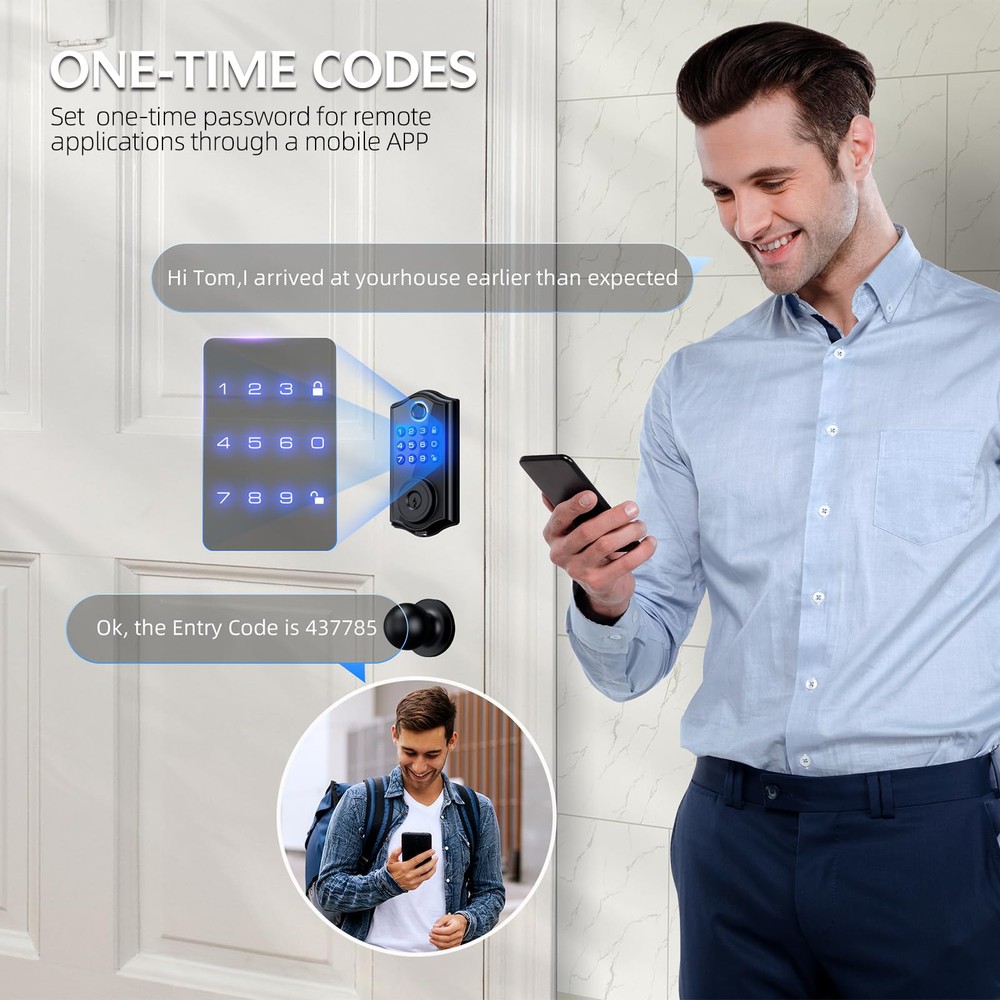 Advanced Fingerprint Recognition: Our state of the art fingerprint door lock can store up to 50 unique fingerprint codes and 50 digital codes, including three manager codes for heightened security. Unlock your door in just 1 second with seamless fingerprint identification. Plus, generate and share permanent, temporary, or one-time passwords remotely via the app for guests and babysitters Smart Security Features: Enhance your home security with an adjustable auto-lock feature that activates in 1 second to 30 minutes. Effortlessly lock the door using the exterior keypad with a simple “one-touch lock.”interior, easily lock and unlock with the knob in a split second—perfect for quick entries and exits Versatile Access Options: Experience the ultimate convenience with multiple access methods—fingerprint recognition, smartphone app, customizable codes, e-key sharing, or a traditional mechanical key. This smart lock is perfect for various settings, including homes, commercial,properties, apartments, offices, and hotels Hassle-Free Installation: Our smart lock installs quickly with just a screwdriver. Compatible with 1-3/8" to 2 (35mm to 50mm) thick doors, it's suitable for all standard American left and right-handed doors. The lock runs on 4 AA batteries for up to 12 months, features a low battery alert, and includes an external Type-C emergency power supply. Even when the batteries are depleted, your access codes remain stored securely, ensuring hassle-free entry. Durable Keypad Door Lock:Our smart lock for front doors comes complete with 2 knob handles and a user friendly keypad deadbolt featuring backlighting, adjustable volume, and a convenient vacation mode. Built to last, it boasts an IP65 weatherproof rating, effortlessly withstanding temperatures from -4°F to 122°F Touch & Go Fingerprint Lock:lock's fingerprint scanner boasts high security against spoofing, leveraging advanced biometric technology and a multi-layer security approach. It employs live data detection to effectively reject counterfeit prints made from materials like silicone or clay, ensuring robust protection against unauthorized access.Experience seamless usability with our lock's 360-degree fingerprint recognition capability, allowing for quick and effortless access from any angle. Security Anti-Peep Electronic Keypad:For added security and to prevent snooping, our system utilizes an anti-snooping password feature. This feature allows the user to add random numbers (up to 20 digits) before and after the password when entering the correct password.