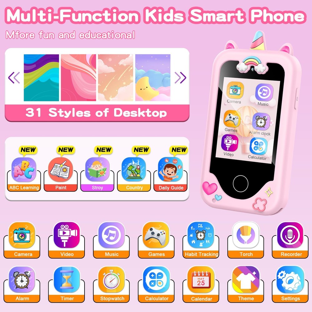 Safe and Durable Shockproof Kids Toy: The play for kids is professionally designed for age 3 4 5 6 7 8. Made with high-quality non-toxic soft plastic, this toddler music player is safe and comfortable for children's skin. The shockproof shell provides effective anti-fall protection, ensuring the device lasts longer. You can also adjust the brightness of the smart screen to protect children's eyes New Upgraded Toddler : The kids play offers more diverse entertainment and new features. Including 10 fable stories, 24 landmark buildings, 26 ABC learning, 5 daily life, and painting. Kids supports selfies, video recording, and a 3.5mm audio jack. Improve the experience for your kids growth with interesting. Provide entertainment while keeping kids away from the with the internet Multi-functional Kids Learning Toys: All in one and easy to use. The kids smart includes a built-in flashlight for emergencies or exploring, a timer for managing activities, and a calculator for mathematical calculations. Besides, the habits recorder helps the child to learn time management skills allowing them to focus on their priorities. Kids toy designed to be a child's first with features that cater to their various needs Kids Gift for Girls Boys Age 3-8: Kids pretend comes with a charming cute pattern design, and the 2.8" touchscreen is very easy to operate for toddler kids. Your child will have their first own fake music cell , and you will never worry about your child messing up your smartphone again. This Kids Smart makes for the ideal Birthday, Christmas, Children's Day, festival, or holiday gift for boys and girls 3 4 5 6 7 8 years old Fun Puzzle Games Play for Kids: The kids play cell has 13 Puzzle games to choose from. Which can help kids develop their logical thinking, reaction skills, and hand-eye coordination. The kid also has an anti-addiction school mode that allows parents to control the kids’ daily game time. The toy comes with a portable lanyard for easy carrying, a USB Type-C cable and an 8GB SD card