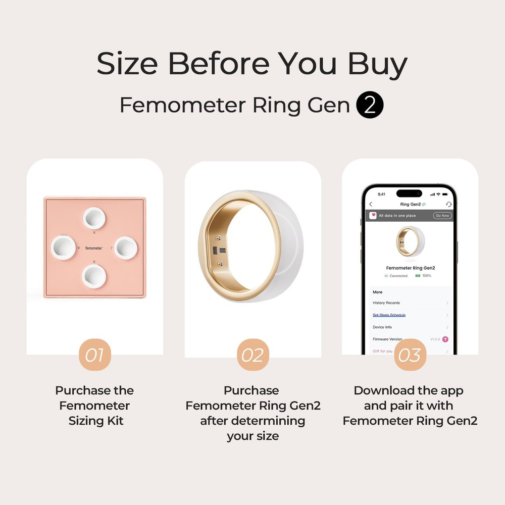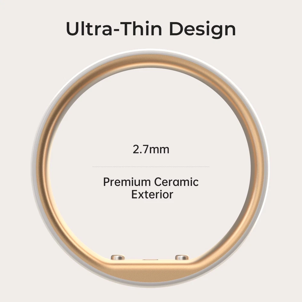 Transform Your Health Journey with Ring Gen2 The world's thinnest health ring delivers comprehensive women's health insights with unmatched comfort and style. Why Choose Ring 2? - Advanced BBT Technology: 1,400+ nightly temperature measurements - Ultra-Thin Design: Just 2.7mm thick with premium ceramic exterior - Complete Health Tracking: Cycle, sleep, heart, stress, and activity monitoring - Long Battery Life: Up to 7 days with convenient charging case - Global Community: Join 15M+ women using 24/7 HEALTH COMPANION: Continuous heart rate monitoring and HRV tracking provide stress insights and health trends. Track daily activity, steps, and calorie burn. All health data syncs seamlessly with the lifetime free app. PROFESSIONAL SLEEP INSIGHTS: Track sleep stages (Deep, Light, REM), blood oxygen levels while you rest. Get detailed sleep scores and personalized recommendations. ADVANCED CYCLE TRACKING: Revolutionary BBT technology with 1,400+ nightly temperature measurements provides accurate cycle predictions and ovulation detection. Part of trusted ecosystem with 15M+ women worldwide. COMFORT MEETS ELEGANCE: Just 2.7mm. Premium ceramic exterior with aluminum core ensures durability while weighing only 3.3g. Scratch-resistant, water-resistant to 100m, and designed for 24/7 wear. Size First with Sizing Kit. SIMPLE & RELIABLE: Up to 35-day battery life with quick charging case (stores 5 full charges). Pair with app to get lifetime subscription. Compatible with iOS and Android. Includes 1-year warranty and dedicated customer support. Regular firmware updates ensure continuous improvement.