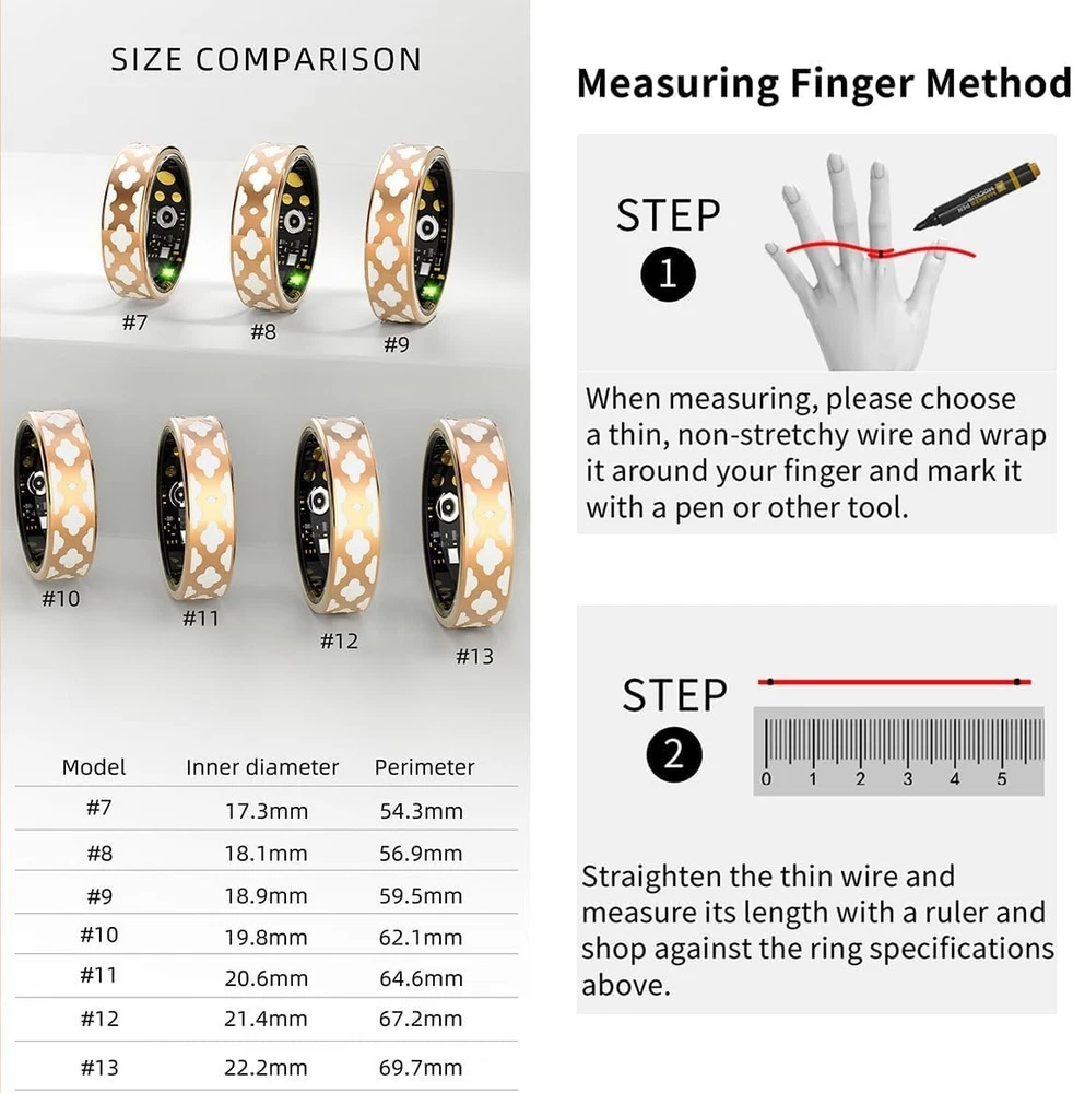 Smart Ring Health Tracker for Women Men, Fitness/Sleep/Stress/HR Tracker, Fitness Tracker with Steps, Distance & Calorie Count, iOS & Android Compatible, IP68 Waterproof 【Elegant Design】This health tracker with exquisite appearance, when paired with a beautiful crystal charging case, represents a unique style that belongs to your life. 【Multiple Exercise Modes】This smart ring supports multiple exercise modes such as running, cycling, jumping rope, walking, hiking, yoga, golf, dancing. 【Recording of Exercise Data】This smart ring is equipped with high-quality sensors, which can accurately record steps, distance, calories and other workout data. 【24/7 Health Tracking】This health tracking ring can 24/7 monitor your heart rate, blood pressure, blood oxygen, sleep and more, serving as your personal health assistant. 【IP68 Waterproof】The smart ring with IP68 waterproof rating can meet your waterproof and dustproof needs in your daily life or outdoor sports. 【15mAh Battery Capacity】This health tracker has a powerful battery capacity, which can provide up to 7-10 days of standby time and 3-5 days of normal working time with just 1-2 hours of charging. 【Bluetooth 5.0】The smart ring is compatible with most smartphones on the market, with system requirements of Android 5.1 or above, and iOS 8.0 or above.
