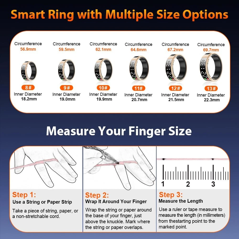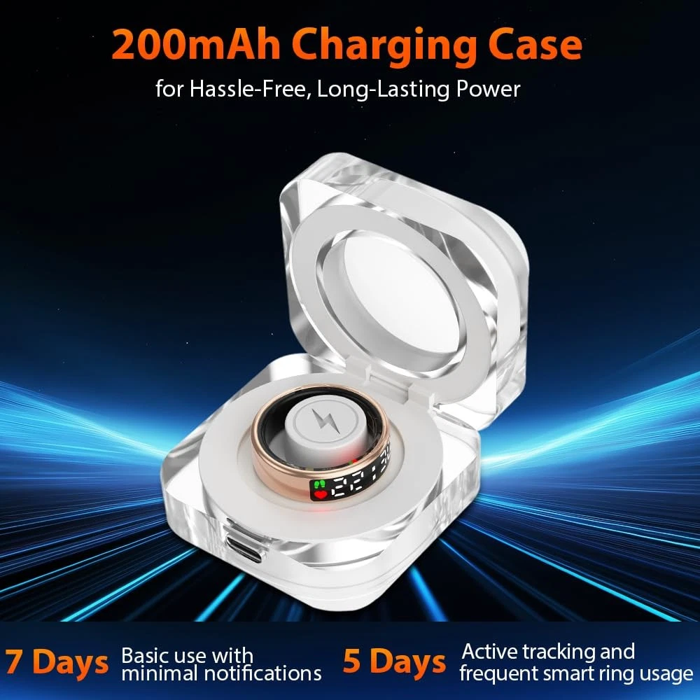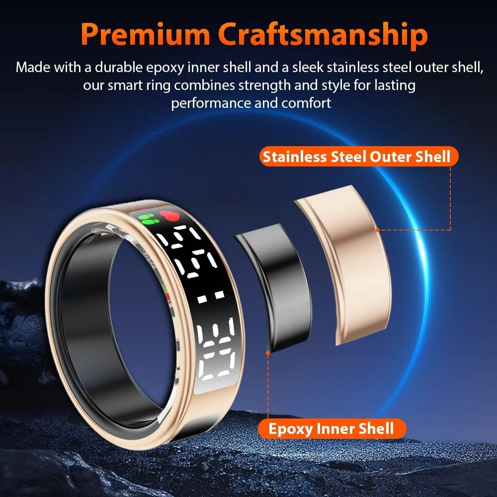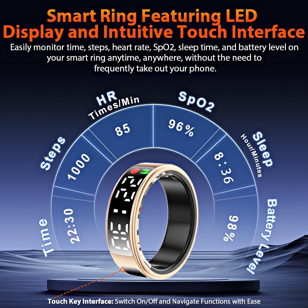smart ring smart rings for men smart ring for women fitness ring health ring health rings for women smart rings health ring for men smart ring health tracker health rings for men fitness tracker ring sleep tracker fitness rings for women fitness rings for men fitness tracker step tracker smart ring for men sleep ring health ring sleep tracker ring health tracker ring smart rings for women health rings health ring step tracker ring heart rate ring smart ring health tracker for women health tracker smart ring for men heart monitor ring fitness ring best smart ring fitness tracker rings 2025 Upgraded Smart Ring with LED Screen & Touch Button: Experience seamless device management with a high-definition LED screen and intuitive touch control. With a simple tap, you can effortlessly monitor essential data such as time, step count, heart rate, blood oxygen, sleep, and battery—without needing to constantly take out your phone. Designed for ultimate convenience, our smart ring is perfect for work, fitness, and leisure, adding a modern, stylish edge to your daily digital experience. 24-Hour Health Monitoring & Multiple Fitness Tracker: Track heart rate, blood oxygen, and sleep quality with detailed insights via the companion app. Monitor trends in heart rate, blood oxygen levels, and sleep patterns, including duration and stages. It also tracks multiple sports activities such as walking, running, cycling, hiking, and golf, helping you stay on top of your fitness goals. Make data-driven decisions for a healthier lifestyle with this all-in-one wellness tracker. Fashion Smart Ring with Gesture Control for Apps: Enjoy easy control with air gesture functionality. Simply wear the ring and use gestures to browse TikTok, scroll through videos, flip pages in e-books, shop online, browse websites, or capture photos, providing hands-free convenience in daily tasks. Simple to Use with No Subscription Fees: Easily connect your smart ring to iOS 10.0+ or Android 5.0+ devices via Bluetooth for seamless data tracking and app control. No subscription fees required. Once synced, you can conveniently manage and view your data directly from your smartphone. Premium Material & IP68 Waterproof: Crafted from high-quality epoxy resin and stainless steel, this ultra-light 4g smart ring is durable and comfortable to wear. With advanced sealing technology and an IP68 waterproof rating, it withstands water immersion, making it ideal for daily activities like hand washing, workouts, and even diving or snorkeling. Built for durability, its robust construction ensures long-lasting performance.