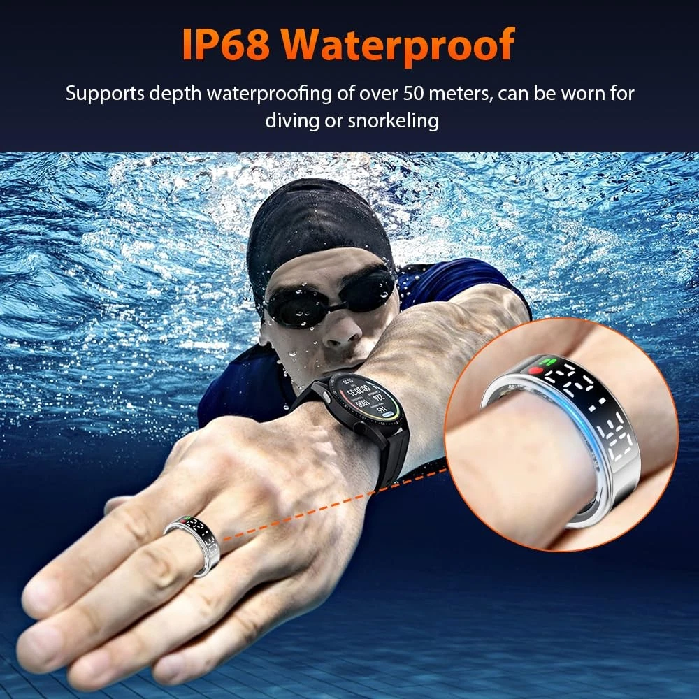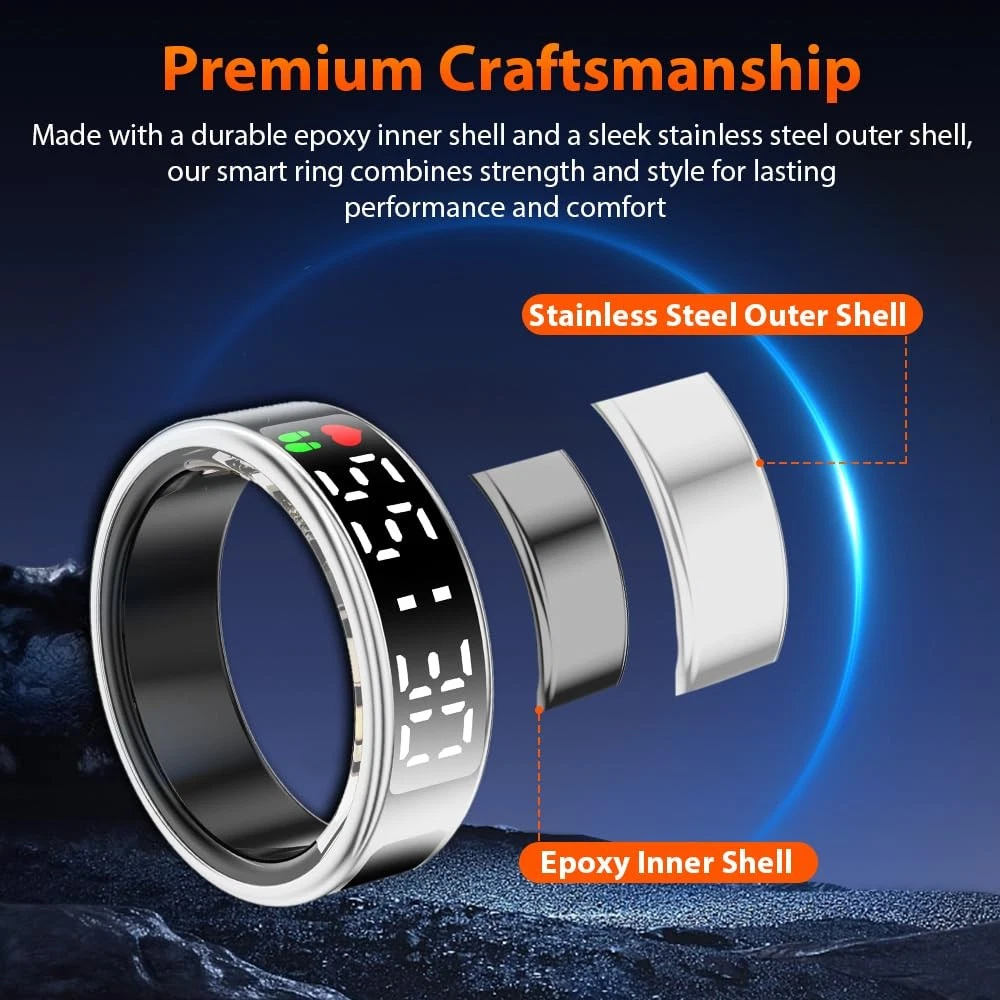 smart ring smart rings for men smart ring for women fitness ring health ring health rings for women smart rings health ring for men smart ring health tracker health rings for men fitness tracker ring sleep tracker fitness rings for women fitness rings for men fitness tracker step tracker smart ring for men sleep ring health ring sleep tracker ring health tracker ring smart rings for women health rings health ring step tracker ring heart rate ring smart ring health tracker for women health tracker smart ring for men heart monitor ring fitness ring best smart ring fitness tracker rings 2025 Upgraded Smart Ring with LED Screen & Touch Button: Experience seamless device management with a high-definition LED screen and intuitive touch control. With a simple tap, you can effortlessly monitor essential data such as time, step count, heart rate, blood oxygen, sleep, and battery—without needing to constantly take out your phone. Designed for ultimate convenience, our smart ring is perfect for work, fitness, and leisure, adding a modern, stylish edge to your daily digital experience. 24-Hour Health Monitoring & Multiple Fitness Tracker: Track heart rate, blood oxygen, and sleep quality with detailed insights via the companion app. Monitor trends in heart rate, blood oxygen levels, and sleep patterns, including duration and stages. It also tracks multiple sports activities such as walking, running, cycling, hiking, and golf, helping you stay on top of your fitness goals. Make data-driven decisions for a healthier lifestyle with this all-in-one wellness tracker. Fashion Smart Ring with Gesture Control for Apps: Enjoy easy control with air gesture functionality. Simply wear the ring and use gestures to browse TikTok, scroll through videos, flip pages in e-books, shop online, browse websites, or capture photos, providing hands-free convenience in daily tasks. Simple to Use with No Subscription Fees: Easily connect your smart ring to iOS 10.0+ or Android 5.0+ devices via Bluetooth for seamless data tracking and app control. No subscription fees required. Once synced, you can conveniently manage and view your data directly from your smartphone. Premium Material & IP68 Waterproof: Crafted from high-quality epoxy resin and stainless steel, this ultra-light 4g smart ring is durable and comfortable to wear. With advanced sealing technology and an IP68 waterproof rating, it withstands water immersion, making it ideal for daily activities like hand washing, workouts, and even diving or snorkeling. Built for durability, its robust construction ensures long-lasting performance.