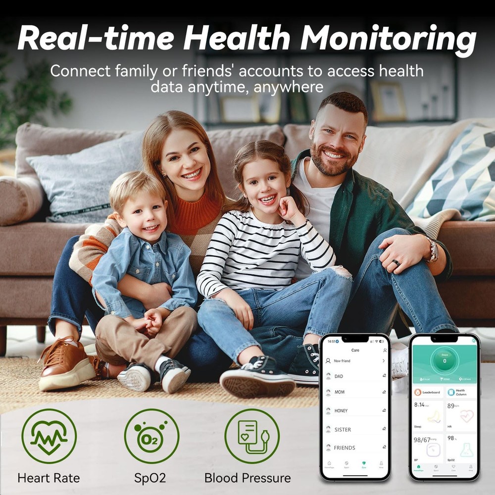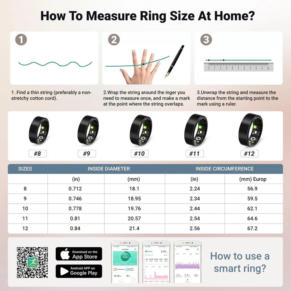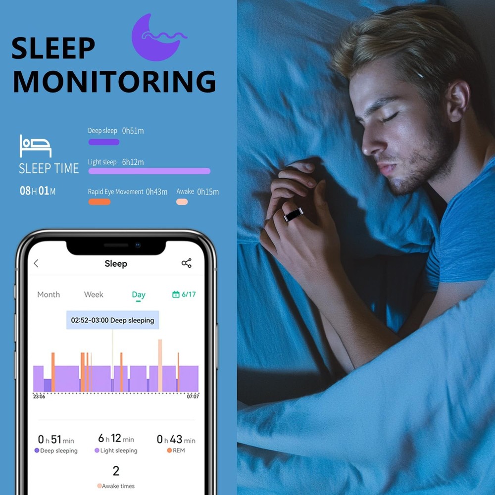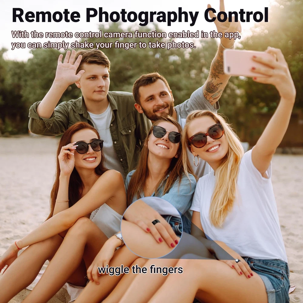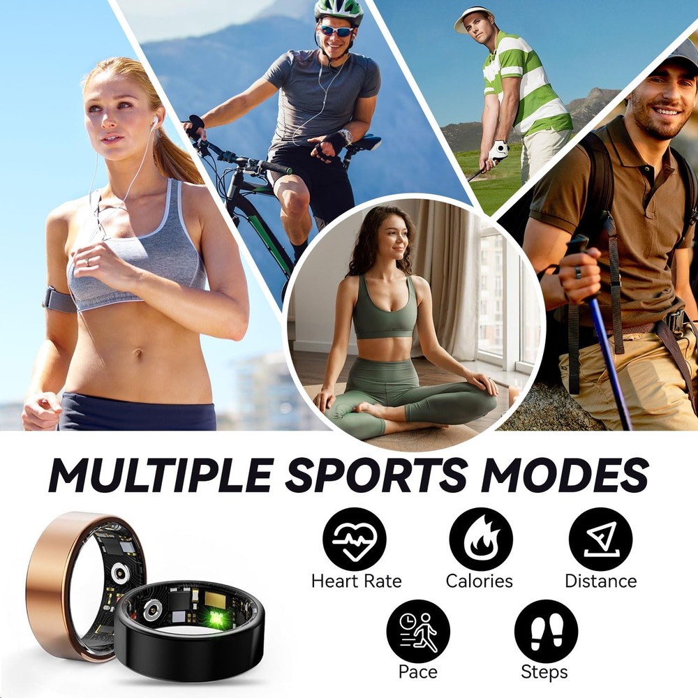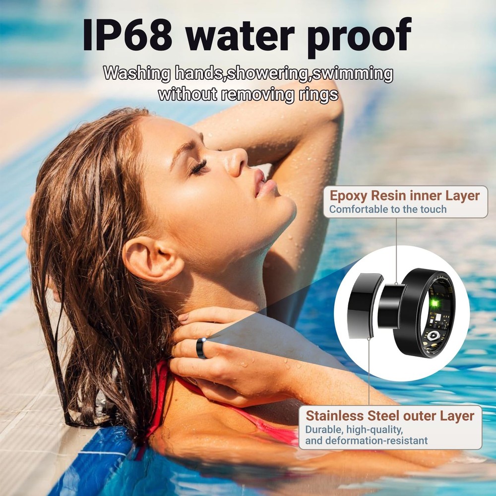 Step into the future of wellness tracking with this sophisticated smart ring. Combining sleek aesthetics with advanced technology, this ring serves as your personal health companion. Track your sleep patterns, heart rate, blood oxygen levels, and daily steps with precision - all from your finger. Supports multiple exercise modes including running, biking, walking, hiking, jumping rope, swimming etc. It can accurately record your steps, distance, activity trajectory and calories burned, helping you to be more regular with your exercise routine. Sleek Design, Built for Life’s Adventures Encased in a minimalist matte black & rose gold finish, this ring boasts an ultra-durable, IP68 waterproof build that withstands showers, swims, and sweat. Its featherlight, ergonomic design ensures all-day comfort, while the subtle aesthetic transitions effortlessly from gym sessions to formal occasions—no bulky gadgets required. Freedom from Fees, Full Ownership of Your Data Unlike competitors, our smart ring operates on a 100% subscription-free model. Enjoy lifetime access to your health analytics without hidden costs or recurring charges. Sync effortlessly with iOS and Android apps to view trends, set goals, and share progress with your family or friends—all from an intuitive, user-friendly dashboard. This smart ring can be fully charged in 60 minutes, with a long-lasting battery life of up to 5 days on a single charge. The included portable wireless charging case (300mAh) stores 30 extra charges, ensures your ring stays powered up and ready to track your wellness journey. Perfect for fitness enthusiasts and health-conscious individuals who prefer subtle yet powerful wearable technology. Specs: IP68 waterproof, 5-day battery life, iOS/Android compatibility, titanium alloy core, hypoallergenic finish. 【24/7 Health Insights】Advanced sensors monitor heart rate, blood oxygen, blood pressure, and more in real time, delivering a comprehensive health insights. Enjoy advanced sleep tracking with detailed sleep stage analysis (deep, light, REM) and personalized quality reports to optimize your rest. 【Fitness Activity Tracker】Seamlessly synchronizes with iPhone and Android devices to display notifications and track daily activities. Track 10+ exercise modes (running, swimming, cycling, etc.) with GPS-driven metrics for steps, distance, routes, and calories burned—ideal for fitness enthusiasts and casual users alike. 【IP68 Waterproof & All-Day Comfort】Engineered with advanced IP68 waterproof rating, this smart ring is rigorously tested to withstand swimming, showering, and all daily water exposure. Its hypoallergenic epoxy resin and stainless steel construction combines featherlight comfort with durable protection—perfect for 24/7 wear without irritation or bulk. 【NO Subscription Fees】Easy access to all features and health data without any recurring fees or paid memberships. Comes with a fun remote photography function, just shake your finger twice to remotely control your phone's camera to take photos, capturing hands-free photos effortlessly. 【Month-Long Battery Power】Full charge takes only 60 minutes and lasts for 3-5 days. The included 300mAh portable wireless charging case provides nearly 30 recharge cycles to meet your power needs for a month, ensuring you always have power when you need it. 【Perfect Fit, Modern Elegance】Sleek health-tracking ring available in multiple sizes (see image #7 for precise sizing) combines style with advanced wellness monitoring. Track heart rate, blood pressure, steps, calories, sleep quality, and more via the app—connect family/friends to remotely monitor their health data in real time, offering peace of mind and timely care. A great gift for your partner/family/friends.