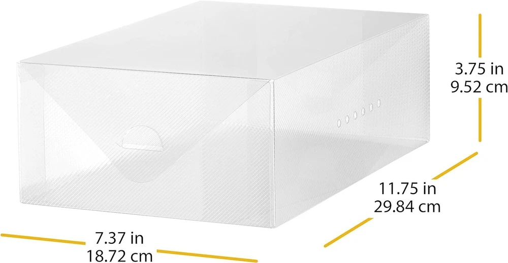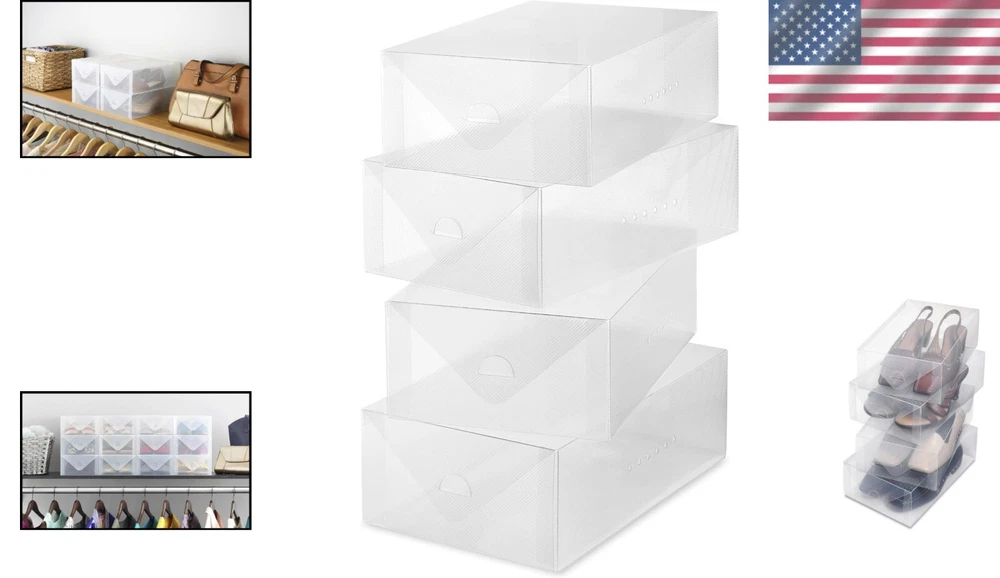 Smart Storage for Women: Stackable Clear Shoe Boxes, Set of 4 - Easy Assembly ‹ › ‹ › ‹ › ‹ › ‹ › ‹ › ‹ › ‹ › Smart Storage for Women: Stackable Clear Shoe Boxes Set of 4 - Easy Assembly Key Features: Stackable design that saves you precious space in your closet. Clear shoe storage containers with built-in vent holes to keep shoes fresh and ventilated. Effortless assembly and disassembly for hassle-free storage when not in use. Assembled dimensions: 11.75 L x 7.375 W x 3.75 H inches . One-piece construction easily folds into shape for immediate use. Transparent plastic design allows for instant identification of contents. Durable protection from dust and moisture, keeping your favorite shoes in pristine condition. Why You Need These Shoe Boxes: Transform cluttered spaces into organized bliss with a chic storage solution. Perfect for not just shoes, but also a variety of accessories and personal items. Designed for quality and care, ensuring that your treasured shoes are always protected. Easy cleaning; simply wipe with a damp cloth and towel dry for a spotless look. A family-owned brand with a legacy of commitment to quality since 1946. Dedicated customer service in English and Spanish for all your inquiries. Elevate Your Space with Style: Your shoes deserve a home as elegant as they are. Our Stackable Clear Shoe Boxes are the ultimate solution for organization, allowing you to showcase your shoe collection while keeping them safe from dust and moisture. With easy identification and smart stackability, you'll never have to struggle to find your favorite pair again. Experience the art of organization and order your set of stackable clear shoe boxes today! Embrace a clutter-free life with confidence and style! Shipping Free & Fast Shipping - We offer free shipping to most of the USA with a normal delivery time of 3-7 days. However, due to the current situation, additional delivery time (up to 3 weeks) may be required for some items. Alternative Carriers - We may use alternative carriers (e.g. USPS, FedEx, UPS, etc.) to ensure your package arrives safely and on time. Due to the use of multiple carriers, we are unable to provide a tracking number automatically. Handling Time - Orders are processed and shipped within 1-2 business days of receiving cleared payment. Shipping Restrictions - Shipping to Alaska, Hawaii, Puerto Rico, Guam, and other US territories may incur shipping charges or delivery restrictions. Please contact us before ordering, or your order can be refunded/cancelled. State Restrictions - There may be restrictions based on your state of purchase. For example, certain items may not be shipped to California due to state regulations. Contact for Tracking Updates - If you require tracking updates or have any concerns about the delivery of your order, please feel free to contact us, and we will be happy to assist you. Return 30-Day Hassle-Free Returns - We want you to be completely satisfied with your purchase. If you are not, you can return the item within 30 days of receiving it for a full refund or exchange. Easy Return Process - To start a return, simply contact us and we will provide you with a prepaid return shipping label and detailed instructions. Restocking Fee - There are no restocking fees for returns. However, the buyer is responsible for return shipping costs if the return is not due to a seller's error. Refund Processing Time - Refunds will be processed within 5 business days of receiving the returned item in its original condition. Payment We accept all major credit cards, PayPal, and Apple Pay for your convenience. Your payment information is secure and encrypted to ensure a safe and seamless transaction. Please complete your payment within 3 days of purchase to avoid any delays in shipping. Feedback Your feedback is extremely important to us. We strive to provide the best products and customer service possible. If you are satisfied with your purchase, please take a moment to leave us a positive review. If you have any concerns or issues with your order, please contact us before leaving negative feedback. We are committed to resolving any problems and ensuring your satisfaction. Contact Us If you have any questions or concerns, please feel free to reach out to our customer support team. You can contact us through the eBay messaging system. We are available Monday to Friday, 9:00 am to 5:00 pm EST, and we will do our best to respond to your inquiry within 24 hours. Thank you for supporting our small family business! UPC: Not Set Unit Quantity: 4 Material: Plastic Mounting: Free Standing Features: Stackable Theme: Not Set Care Instructions: Wipe Clean Brand: Unbranded Item Height: Women's Shoe Storage Boxes Item Length: Women's Shoe Storage Boxes Item Width: Women's Shoe Storage Boxes Type: Shoe Storage Box Number of Shelves: 1 Capacity: 11.75 liters Item Depth: 11.75 in Item Weight: Less Than 2 lb MPN: Not Set Model: Not Set Number of Items in Set: Four-Piece Color: White Number in Pack: 4 Number of Compartments: 1 Number of Drawers: 0 Style: Modern Country/Region of Manufacture: Not Set Finish: Matte Original/Reproduction: Not Set Unit Type: Unit Assembly Required: Not Set