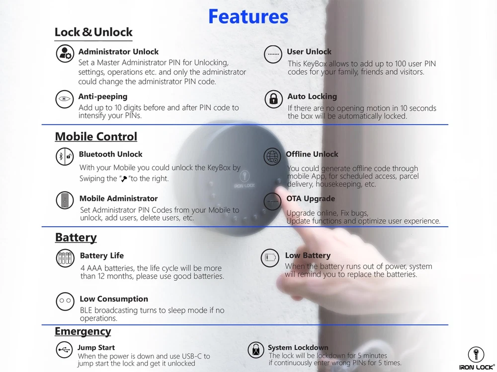 [Smart App Control]: Manage users, codes, and access logs from the free Android and iOS app. Get low battery alerts, share temporary or permanent access, and monitor who accessed the lock and when. [Multiple Unlocking Methods]: Unlock via Bluetooth, mechanical code, dynamic, or one-time passcodes through the free app. Share access with up to 100 users, perfect for family, friends, or guests. Ideal for any type of business-whether retail, industrial, or trucking—this lock box offers versatile security solutions for a wide range of industries. [Advanced Security Features]: Instant Auto-Lock Automatically locks upon closing the door, ensuring security, while a 5-minute system lockdown after 5 incorrect attempts provides extra protection against unauthorized access. [Durable & Weatherproof Construction]: Built with heavy-duty zinc alloy, the IP65-rated lock box withstands harsh weather conditions (-49°F to 140°F). Corrosion-resistant and waterproof, it’s perfect for both indoor and outdoor use. [Large Capacity & Easy Organization]: Features two upper hooks and lower storage space to securely hold multiple house keys, fobs, access cards, or car keys. Ideal for homes, garages, Airbnb properties, offices, and more.