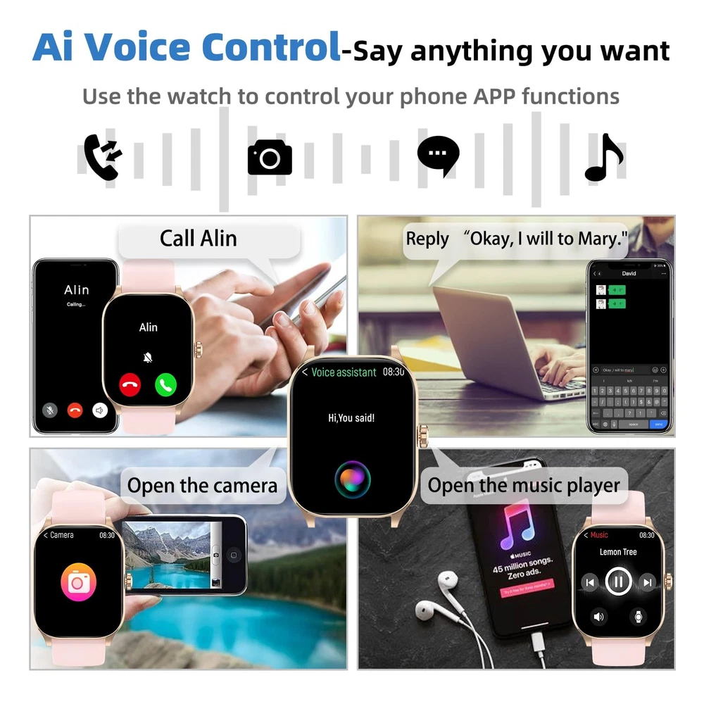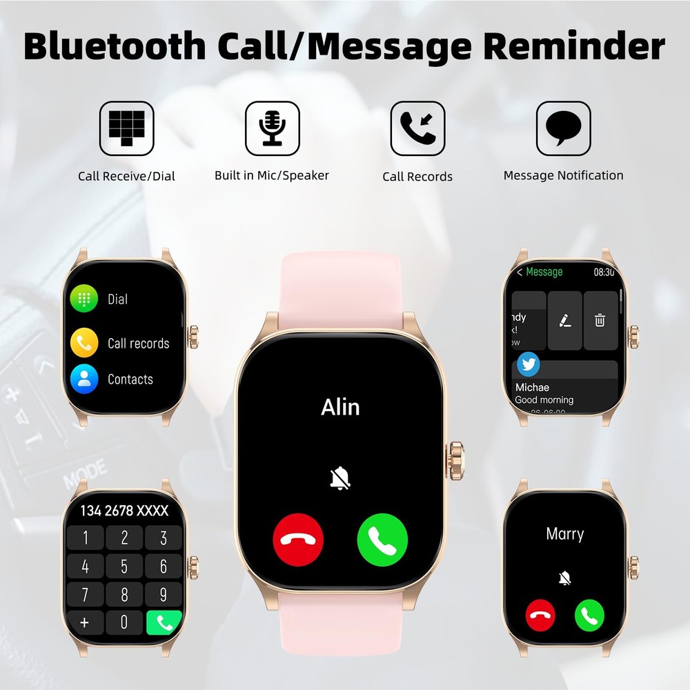 Introducing the Smart Watch for Men and Women - a versatile and advanced smartwatch designed to enhance your daily life. This state-of-the-art device allows you to effortlessly answer and make calls directly from your wrist, ensuring you stay connected on the go. Compatible with both Android and iPhone devices, this smartwatch is equipped with essential health monitoring features including heart rate tracking, sleep monitoring, and a pedometer to help you maintain a healthy lifestyle. With over 100 sports and fitness modes, the Smart Watch is perfectly tailored for fitness enthusiasts looking to elevate their workouts. Whether you’re running, cycling, or practicing yoga, this smartwatch provides valuable insights to optimize your performance. Furthermore, its IP68 waterproof rating ensures durability and reliability, allowing you to wear it in various environments without fear of water damage. Elevate your lifestyle with our Smart Watch – an indispensable fitness tracker that combines functionality with style, making it the perfect accessory for both casual and active wearers. Experience the convenience of technology at your fingertips and take control of your health with this innovative smartwatch. Bluetooth Call and Message Push: The smart watch can stay connected with phone call and message reminders right on your wrist by using Bluetooth to make/receive calls (with call logs, contacts). This smartwatch supports notifications for text messages, calls, and other app( Facebook, Whatsapp, Instagram, SMS and more) alerts, ensuring you're always in touch without constantly checking your phone. All-day Health Monitoring: This smart watch for women and men features advanced health tracking capabilities, including heart rate monitor, blood oxygen monitor, and sleep monitoring, ensuring you stay informed about your health status throughout the day. Daily Activity Tracking and Multi-sport Modes: With more than 100 sports modes, this smart watch supports running, cycling, walking, climbing, yoga, skiing, football, and more. It tracks your daily data such as steps, time, distance, and calories, and connects toyour phone to record all your training routes to further motivate yourself to complete your exercise plan., making it perfect for any workout scenario. 2.01" HD Touch Screen and Personalized Watch Face: Featured with a high-definition touch screen, this smart watch delivers vibrant visuals and intuitive navigation. Personalization is at the forefront of this device, allowing you to customize your watch face to match your unique style. Choose from a variety of stunning designs and layouts, ensuring your smart watch is not only functional but also a fashionable accessory. Large Battery and Widely Compatible: The smart watch is compatible with smart phone with iOS 8.0 and Android 6.0 and above.This military smart watches for men has a large capacity battery that can be fully charged in just 2 hours and lasts up to 5-7 days (Depends on actual use), up to 20 days in power saving mode and up to 30 days in standby mode. IP68 Waterproof and Additional Features:The smart wacth has multiple functions such as timer, stopwatch, alarm clock, sedentary reminder, music control, weather forecast, brightness adjustment, photo control, calculator, etc. Besides, IP68 water and dust resistant rating, the sport watch can beused even when washing hands and in the rain.