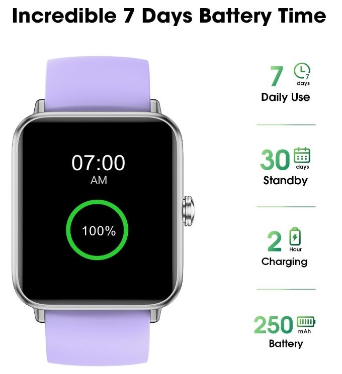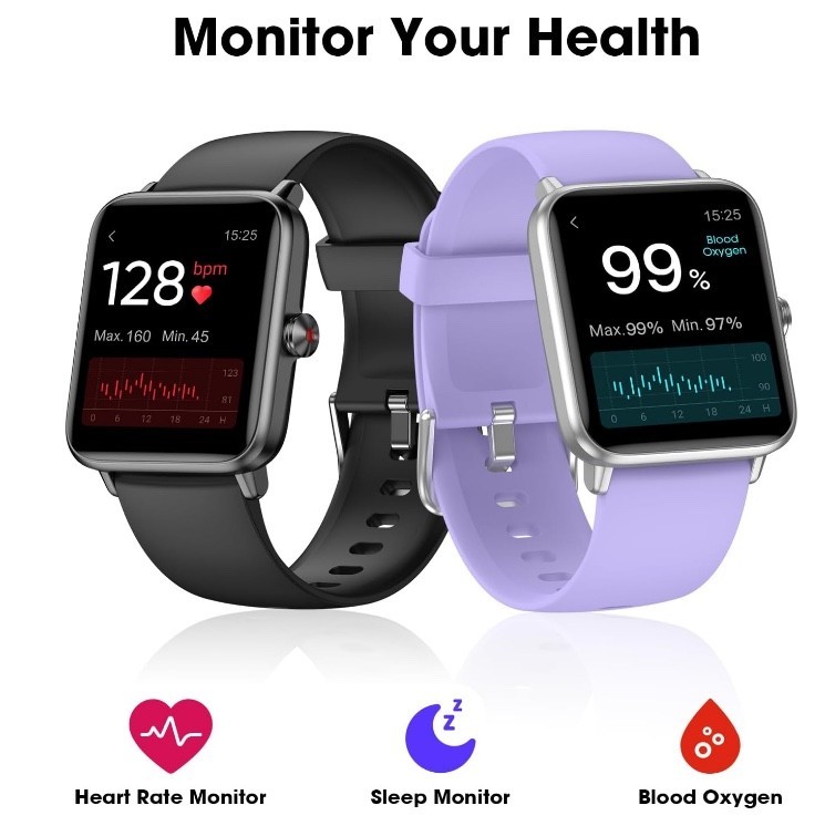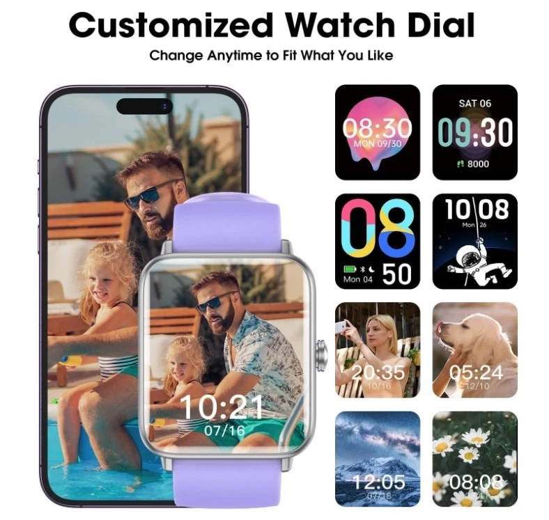 About this item Personalized Watch Faces with Practical Tools: The fitness watch for women comes with theme dials and you can personalize the watch face to your liking and customize the display content. Brightness adjustment make you an optiomal experience based on environment change. The smartwatch features practical tools such as stopwatch, timer, music control, breathing training, night mode, alarm clock and wrist up awake, giving more convenience and fun to your life. Healthy Monitor on Your Wrist: The smartwatch monitors your heart rate in real time and you can view recorded data on the watch or App. Our watch also allows for manual detection of blood oxygen. Besides, the fitness watch tracks your sleep status automatically, including light sleep, deep sleep and awake time, helping you develop healthy sleep habits and improve sleep quality. Multiple Sport Modes with Waterproof: Our fitness watch is equipped with 10 different sports modes suan as yoga, walking, running, ect, tracking automatically your steps, distance, calorie burn, and activity time. The smartwatch also can track your outdoor workout route if connected with your smartphone's GPS. The sport watch features IP68 waterproof rating, ensuring that it can withstand sweat, hand washing, or rain in daily life, and is also suitable for swimming and diving. Get Notified on Smartwatches: The smart watch receives incoming call and notifications from SMS, Facebook, Instagram, Whatsapp etc, This helps you stay up-to-date and avoid missing important information. (The watch can not make calls or text back). The watch also has a sedentary reminder function and you can create reminders for drinking water, meetings, dinners, appointments and more in the alarm settings, enjoying a healthier lifestyle and a well-planned schedule. Long-lasting battery and Extensive Compatibility: The smart watch will take 2 hours to charge and last for up to 7 days of continuous use or 30 days standby time. The watch is compatible with smartphones that run on iOS 10.0 or Android OS 5.0 and have Bluetooth 4.0 or higher. Please note that it is not compatible with tablets or computers. Gentle Reminders for Users: Please do not wear the watch too tightly to avoid excessive friction may scratch the skin. Make your watch a rest after prolonged use. Product description Product information Additional details Operating System Android 6.0 / iOS 11.0 or above, Bluetooth 4.0 or above Additional Features 1.5 inch Full Color Touchscreen, Built-in Dials, Customized Watch Face, Brightness Settings, Do Not Disturb Mode, Night Mode, Activity Tracker, Sleep Monitor, Heart Rate Monitor, Blood Oxygen Monitor, Pedometer, Calories Tracker, Time Display, Sedentary Reminder, Timer, Stopwatch, Breath Training, Raise to Wake, Music Control, Alarm Clock, Drinking Reminder, Screen Duration Setting, Smart Notification: Email, Messages from App, Call, SNS Reminder, 5ATM Waterproof, Multiple Sport Modes GPS Geotagging Functionality GPS Via Smartphone Band Material Type Silicone Case Material Type Resin or Plastic Water Resistance Level Waterproof Sport Type Outdoor Running, Indoor Running, Outdoor Cycle, Indoor Cycle, Outdoor Walking, Indoor Walking, Yoga, Rowing Machine, Elliptical Machine, Cricket, Hiking, Pool Swimming, Outdoor Swimming, Spinning Bicycle Human Interface Input Touchscreen Supported Application Heart Rate Monitor, Sleep Monitor Water Resistance Depth 1 Meters Supported Satellite Navigation System GPS Controller Type Android Metrics Measured Heart Rate Monitor, Sleep Duration, Blood Oxygen Monitor Battery Battery Capacity 5040 Milliamp Hours Battery Cell Type Lithium Polymer Battery Average Life 7 days Battery Charge Time 2 Hours Battery Power 210 Milliamp Hours Display Screen Size 1.5 Inches Display Type LCD Measurements Item Weight 2.39 Ounces Item Dimensions 6.85 x 3.3 x 0.6 inches Item details Brand TYKOIT Target Audience Men,Women Age Range Description Adult Model Number ee43a45a-3a02-4f30-b914-e90277d04284 Wearable Computer Type Smart Watch Manufacturer TYKOIT ASIN B0C1GNXTSW Item Height 0.6 inches Style Shape Square Style Name Modern Color Light Purple Band Color purple Connectivity Connectivity Technology Wireless Wireless Compability Bluetooth Communication Feature Notification Compatibility Compatible Devices Smartphone Compatible Phone Models IPhone 14 mini/14/14 Pro/14 Pro Max/iPhone 13 mini/13/13 Pro/13 Pro Max/iPhone 12 mini/12/12 Pro/12 Pro Max/iPhone 11/11 Pro/11 Max/11 Pro Max/iPhone XS/iPhone X/iPhone 8/8 plus/iPhone 7/7 plus/iPhone 6/6s/6 Plus/6s Plus/iPhone 5 ios phones; Samsung Galaxy S22, S21, S21 Plus, S21 Ultra, S20, S20 Plus, S20 Ultra, S20 FE, S10, S10 Plus, S9, S9 Plus, S8, S8 Plus, S7, S7 Edge, S6, S6 Edge, S5, Samsung Note 8, 5, 4; HUAWEI P40/P40 Pro/P30/P10/P9/MATE40/MATE40 Pro/MATE30/MATE30 Pro/MATE9/MATE 8/MATE 7; HONOR VIVO OPPO HTC SONY LG OnePlus Nexus Google pixel/pixel xl BlackBerry with most smartphones with iOS 11.0/Android 6.0 or above and Bluetooth 4.0 or above. User guide Waterproof Rating 5ATM Waterproof