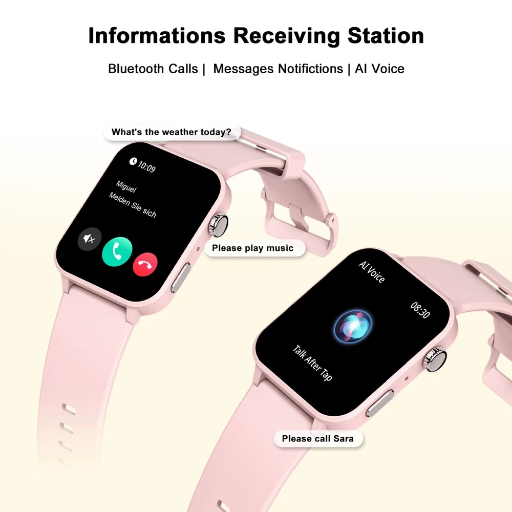 What do you get when you buy this smart watch? 1 * smart watch 1 * silicone band 1 * nylon braided strap 1 * usb charging cable 1 * user manual === Description:=== Resolution: 240 * 284p full hd Screen size: 1.85 inches Battery capacity: 350 mah Net weight of the product: 40g Waterproof grade: ip68 Charge interface: usb2.0 Standby time: 30 days Usage time: 7 days Charging time: 2 hours Mode of operation: full touch screen + buttons Bluetooth effective distance 5.3:20m Support system: android 6.0 and above, ios 9.0 and above Languages supported: Spanish, English, German, French, Italian, Japanese, Russian, Portuguese Watch format: 12/24h, you can change according to your own habits. ===Product description=== Its large 1.85 inch color screen is made of high quality tempered glass, giving you an excellent visual experience. You can control the clock by sliding your finger up, down, left and right, or by holding down the screen. The app comes with over a hundred wallpapers. Of course, you can also download your favorite photo and set it up as a watch screensaver, just lift the wrist to activate the screen easily! The smart watch features ip68 waterproof technology. Whether you sweat or rain, deep water resistant technology effectively protects your watch for a safe use experience; The perfect companion for everyday life. It supports the supervision of hundreds of sports modes, such as running, riding, jumping rope or ball games. You can use the watch to record the status of your exercise at any time. You can record exercise time, distance, calories burned, heart rate, etc., and you will become your close partner when you exercise. Smart watches can monitor your health at any time. You have 24-hour heart rate monitoring and can also measure blood oxygen saturation (spo2) and blood pressure. Both blood oxygen meters and blood pressure meters are on your hands. Apps connected to your mobile phone, with synchronous sleep logs, weather information and information notifications. It also has a sedentary reminder that when you are busy with work and forget about time, it will gently vibrate to remind you to relax your body and mind. 350 mah aluminium polymer battery, superdurable and reliable standby mode. It only takes 3 hours to fully charge and can run continuously for 5-7 days or standby for up to 30 days. At the same time, the clock supports a wide range of android and ios systems. The watch has a green light sensor. When there is a call or a message, it vibrates and it rings. The clock can also call and receive the phone. Supports 100 synchronized contact Numbers. You can also control and play music directly. You can suspend and play the last song or follow the song (you must first open the music player via your mobile phone). In the camera interface, you can take photos remotely. More practical functions like: alarm clock, voice assistant, calculator, mini game, etc., wait until you find out. === Instructions for use=== 1. After receiving the product, check the corresponding charging cable of the product 2. Hold down the side button of the watch for 3 seconds to turn on 3. Scan the qr code or download the app through the app store 4. Connect your bluetooth mobile phone through the app 5. Open the application, switch to the device interface and match the device 6. Start enjoying your time and be happy with your smart watch Legal notice • battery life depends on the use of the product.