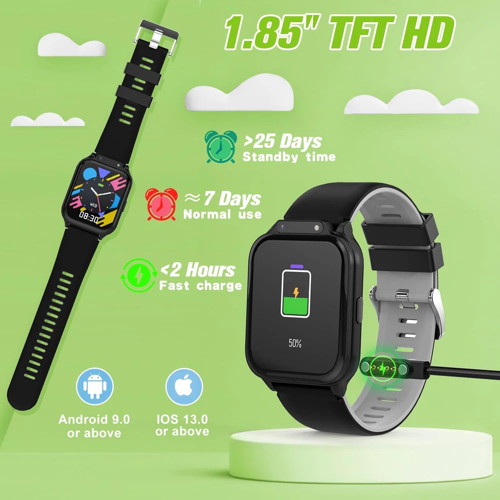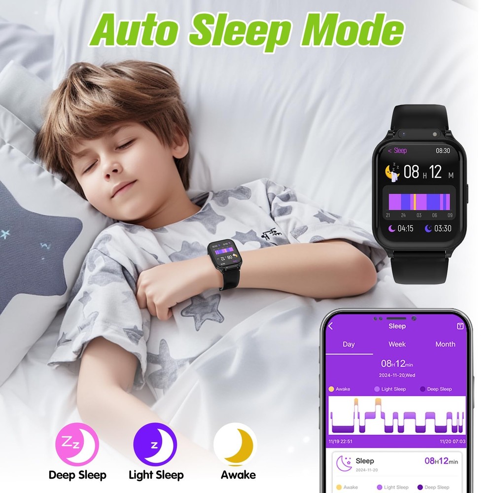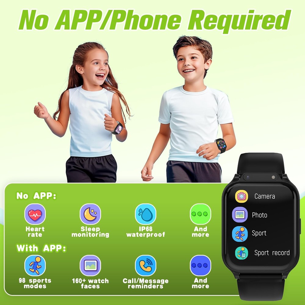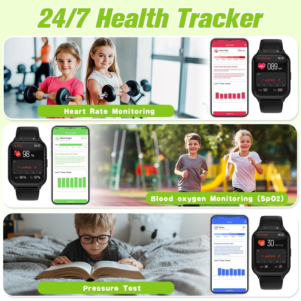 Introducing the Smart Watch for Kids, a versatile and feature-packed fitness tracker designed to keep your little ones active and engaged. With a 1.85" display, this watch not only tracks steps, calories burned, and heart rate but also monitors sleep patterns, ensuring your child's well-being is prioritized. Boasting an IP68 waterproof rating, it can withstand splashes and accidental water exposure, making it perfect for outdoor adventures. But that's not all - this watch doubles as a fun companion with its built-in puzzle game, providing entertainment and mental stimulation. Whether used with or without the accompanying app, this smart watch is a must-have for kids aged 5-16, encouraging an active and balanced lifestyle while keeping them connected. Lightweight and comfortable, it's the perfect accessory for your child's daily activities. Sleep Monitor, heart rate, blood oxygen, stress, 22/100+ sport modes, DIY Dial, rewards, games, learn card, storybook, camera, alarm clock, stopwatch, calculator, timer, calendar, audiobooks, learning cards, 20 languages, music, torch, player, volume and more. MUTI-FUNCTIONAL KIDS SMART WATCH - Sleep Monitor, Heart Rate, Blood Oxygen, Stress, 22/100+ Sport Modes, DIY Dial, Rewards, Games, Storybook, Camera, Alarm Clock (Set 10+), Stopwatch, Calculator, Timer, Calendar, Audiobooks, Learning Cards, 20 Languages, Music, Torch, Player, Volume, Bluetooth Phone and more. HEALTH & SLEEP MONITORING - Stay informed about your child's heart rate, blood oxygen, and stress data by selecting the 24/7 detection mode. The sleep-monitor feature of our kids watch provides insights into various sleep stages, such as the duration of deep sleep, and offers helpful tips to improve sleep quality. 1.85" HD TOUCH SCREEN & 160+ DIALS (Customizable) - our kids smartwatch has 1.85" HD touch screen for better operation. In APP HanFit kids can customize their own dials with favorite pictures, in addition to more than 160 beautiful dials (continuously increasing)! CLASS MODE & SOS - Set specific times on the phone to disable the watch, helping your child stay focused and reduce distractions during class or any other time. During this time, press and hold the button for 3 seconds and the watch for kids will sound an alarm to attract the attention of those around the child. UNBREAKABLE, IP68 EXTREME WATERPROOF - This kids watch for kids features a sturdy stainless steel case that protects your child from bumps and scratches during play. The ultra-high water resistance of IP68 keeps the watch functioning in virtually any water environment, except for deep dives, and the silicone band ensures comfort. NO APP/PHONE REQUIRED - The kids digital watch can be used directly without app/phone. But with the APP, you could explore more functions. Tips: the kids boys girls watch does not support SIM card. Compatible with Android 9.0+ and iOS 13.0+ smartphones. PERFECT GIFT FOR KIDS - This kids fitness watch is designed for children. Children can develop good habits and become healthier by earning virtual gold coins after completing customized tasks or workout goals. It is the perfect birthday Christmas gift for kids, or any other occasion.