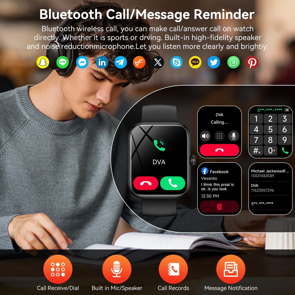 Smart Watch with Alexa Built-in, 1.83" HD Fitness Tracker Watch with Bluetooth Calls/Messages, IP68 Waterproof, 120+Sports Modes, 24/7 Heart Rate/Sleep Fitness Tracker Compatible with iOS/Android Bluetooth Call & Messaging Notification: Smart Watch with HD speaker & mic enables hands-free calls via Bluetooth 5.3. Get WhatsApp, Telegram, Facebook alerts directly on 1.83" touchscreen. Auto-wrist lift wake-up minimizes phone dependency(Reply message not supported) Alexa Built-in Voice Control: Command Amazon Alexa to check news/weather/schedules instantly. Set reminders, control smart home devices & control music with an Alexa-enabled watch. Having Alexa on your wrist, with 24/7 voice command access wherever you go 24/7 Health Tracking: Android smart watch has a built-in optical sensor that continuously monitors your stress, heart rate, and sleep quality. The sleep tracker provides a comprehensive quality analysis of your sleep to help you make informed decisions 100+ Sports Modes: Smart watches for women has more than 100 sports modes. Whether you are exercising outdoors or in the gym, you can set the amount of exercise and duration to conduct standardized exercise. Keeps you in the know wherever you are Multi-functional Smartwatch: Fitness tracker is equipped with basic functions such as voice assistant, weather forecast, camera and music control, customized dials, with its multifunctionality, this watch makes your every day easier, and more productive 1.83"HD Touch and DIY Dials: Smartwatch let you have different touch screen watch experience, watch smart light up the screen for your use, equipped with 100+screens for you to choose, you can also DIY unique fitness tracker screen IP68 Waterproof: Fitness trackers is IP68 rated waterproof, so you can wear it while washing your hands, face or daily sweating without worrying about water intrusion. (Do not use for baths, saunas, hot springs, etc.) Quality Service: Fitness watch for men and women offers 30 days return and 1 year warranty. If you have any questions about the use of the product, please feel free to communicate with us through “Click on your order at Amazon - Contact Seller”