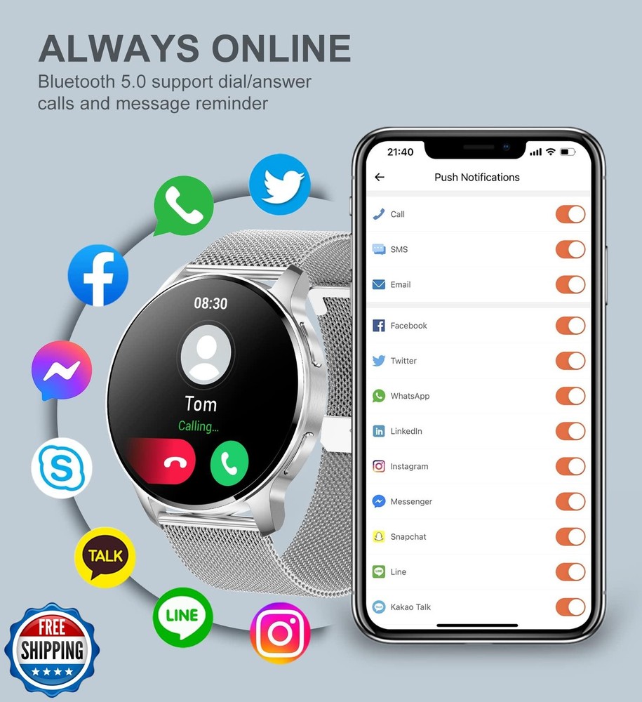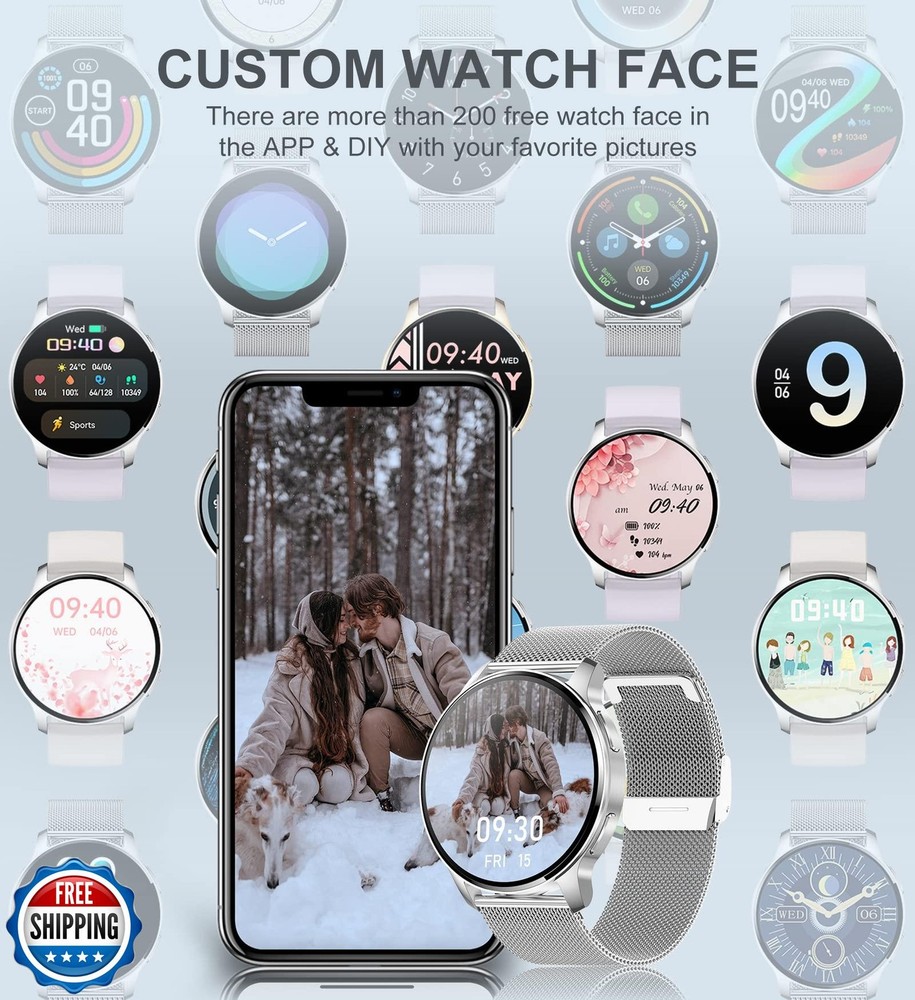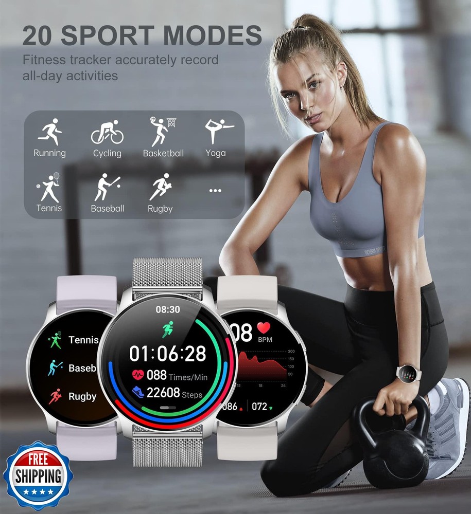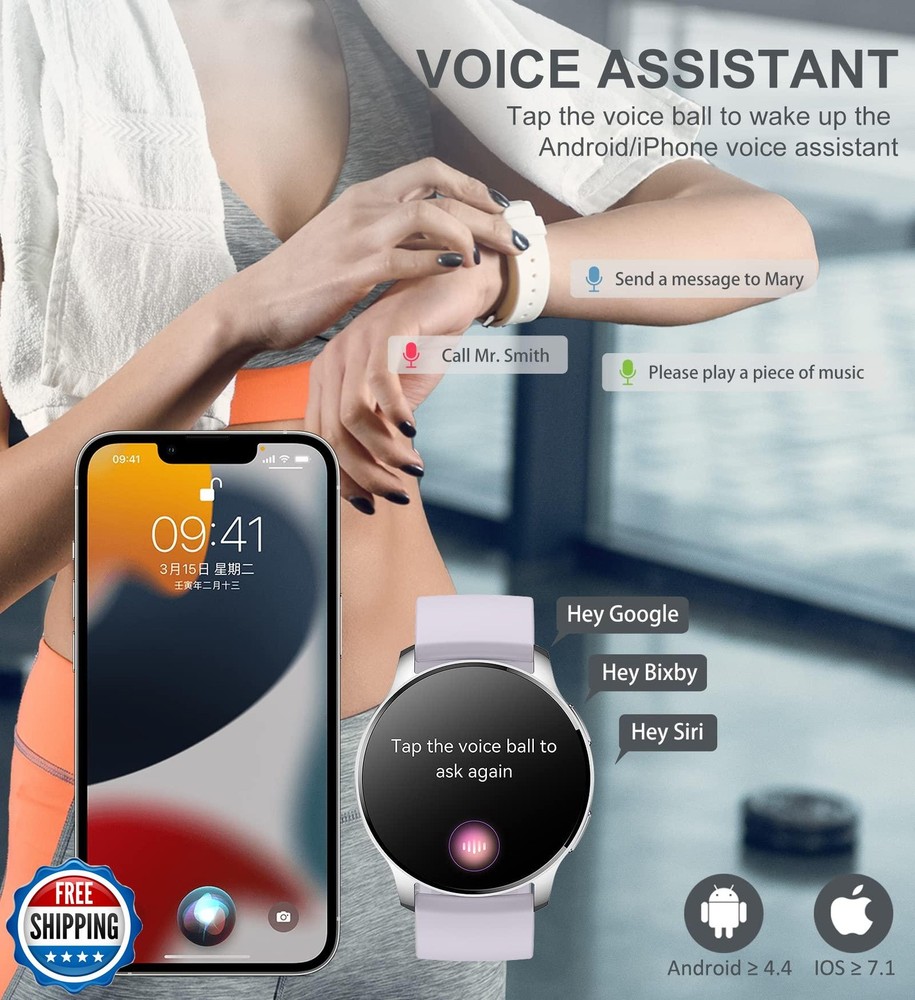 Smart Watch for Women (Answer/Make Call), Fitness Tracker for Android and iOS Phones Waterproof Smartwatch with 1.32" HD Full Touch Screen AI Voice Control Heart Rate Sleep Monitor Pedometer, Silver Features BLUETOOTH CALL & SMART NOTIFICATION: Just connect the smart watch with your phone via Bluetooth, you can dial and answer calls on your watch. The smartwatch will vibrate to remind you when your phone receives SMS and SNS messages ( Facebook, WhatsApp, Instagram, Twitter...) Never miss any important notification. This smart watch with text and call can also control your phone's AI voice assistant, such as Siri Bixby Google. ROUND SMART WATCHES FOR WOMEN: Ultra-thin metal frame with 1.32" HD full touch color screen brings smooth touch and excellent visual experience. There are 200+ free dials for you to choose from, you can also change your favorite picture as a watch face. Comes with 3 bands, the silver stainless steel one is exquisite, while the purple and beige silicone bands are more casual, switch between elegant and sporty, ignite your passion for fashion! ALL DAY ACTIVITY & FITNESS TRACKER: The fitness watch supports 20 sports modes (walking, running, climbing, cycling, swimming, elliptical, yoga, tennis, golf, etc.) and accurately records all-day activities such as steps, distance, calories, active minutes and heart rate. All data can be synchronized to your phone for analysis, helping you exercise scientifically and achieve your fitness goals. The best choice for fitness enthusiasts. ALL-ROUND HEALTH MONITORING: This women smart watch can detect your 24/7 heart rate, blood pressure and blood oxygen to get a better understanding of your health (Not for medical use). The high-performance motion sensor monitors sleep status automatically and provides comprehensive sleep quality analysis (deep sleep, light sleep and awake). You can also use the Female Physiological Cycle, Drink Reminder and Sedentary Reminder features to help you make reasonable adjustment on your lifestyle. SMART WATCH FOR ANDROID PHONES AND IPHONE: iOS 7.1 and above, Android 4.4 and above, Bluetooth 5.0 distance 8-10 meter. 270mAH battery capacity, only takes 2.5 hours to get fully charged and can be used for 3-7 days (Note: depends on individual usage). IP67 waterproof watch, so you don't have to take off while washing your hands, not suitable for diving, shower or sauna. More practical tools such as mobile music playback and photo control, weather display, find phone, timer, alarm clock, etc. Shipping Free & Fast Shipping: We offer free shipping to most of the USA with a normal delivery time of 3-7 days. However, due to the current situation, additional delivery time (up to 3 weeks) may be required for some items. Alternative Carriers: We may use alternative carriers (e.g., USPS, FedEx, UPS) to ensure your package arrives safely and on time. Due to the use of multiple carriers, we are unable to provide a tracking number automatically. Handling Time: Orders are processed and shipped within 1-2 business days of receiving cleared payment. Shipping Restrictions: Shipping to Alaska, Hawaii, Puerto Rico, Guam, and other US territories may incur shipping charges or delivery restrictions. Please contact us before ordering, or your order can be refunded/cancelled. State Restrictions: Certain items may not be shipped to California due to state regulations. Contact for Tracking Updates: If you require tracking updates or have any concerns about the delivery of your order, please feel free to contact us, and we will be happy to assist you. Return Policy 30-Day Hassle-Free Returns: If you are not completely satisfied with your purchase, you can return the item for free within 30 days of receiving it for a full refund or exchange. Easy Return Process: Contact us, and we will provide you with a prepaid return shipping label and detailed instructions. No Restocking Fee: There are no restocking fees for returns. However, the buyer is responsible for return shipping costs if the return is not due to a seller"s error. Refund Processing: Refunds will be processed within 1 business day of receiving the returned item in its original condition. Feedback Your feedback is extremely important to us. We strive to provide the best products and customer service possible. If you are satisfied with your purchase, please take a moment to leave us a positive review. If you have any concerns or issues with your order, please contact us before leaving negative feedback. We are committed to resolving any problems and ensuring your satisfaction. Contact Us If you have any questions or concerns, please feel free to reach out to our customer support team. You can contact us through the eBay messaging system. We are available Monday to Friday, 9:00 am to 5:00 pm EST, and we will do our best to respond to your inquiry within 24 hours. Thank you for supporting our small family business!