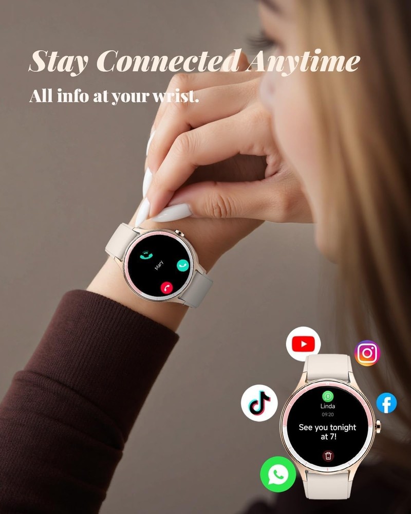 Stay Stylish & Connected – The Perfect Smartwatch for Women! Upgrade your everyday look with ’s latest women’s smartwatch, crafted for elegance and functionality. Featuring a sleek round design with a premium zinc alloy bezel, this watch blends modern aesthetics with durability. ✔ 1.27” HD Touchscreen – Enjoy a crystal-clear display for effortless navigation. ✔ & Message Notifications – Stay connected without reaching for your . ✔ Health & Fitness Tracking – Monitor your heart rate, sleep and daily activity. ✔ IP68 Waterproof – Perfect for workouts and everyday wear. ✔ Customizable Watch Faces – Match your style with multiple dial options. Designed for the modern woman, this fashionable smartwatch complements any outfit, from casual to formal. Elevate your lifestyle with – where style meets innovation! Luxurious Craftsmanship, Exquisite Elegance - Crafted with a sparkling zinc alloy frame and silky-smooth silicone band, this smartwatch features a vibrant round display offering 100+ cloud watch faces and personalized customization – upload your favorite photos to craft your wearable statement piece. Compatibility with Android & iOS Phones - Connect effortlessly via Bluetooth and the app across all Android and IOS phones — simple setup, instant access! Answer and make calls directly from your wrist to stay connected. Get real-time SMS alerts and notifications from top apps, keeping every update at your fingertips with just a glance. Becoming A Fitness Star - Precision tracking captures every detail: daily steps, calories burned, workout duration. With 100+ sport modes and pro-level running programs built in, your personal trainer now lives on your wrist. Your Health Coach - Employs the latest health monitoring technology to meticulously record and analyze your entire sleep process, assisting you in continually improving sleep habits and start each day refreshed. 24/7 heart rate and stress monitoring; precise female menstrual cycle management — embrace a healthy life together with the SMARTWATCH! Use with Full Confidence - Equipped with a large-capacity battery, delivering outstanding endurance performance: daily use lasts up to 7–10 days; standby time extends up to 30 days; charging requires only around 2 hours. IP68-rated waterproof technology handles everything with ease—from swimming pools to kitchen dishwashing.