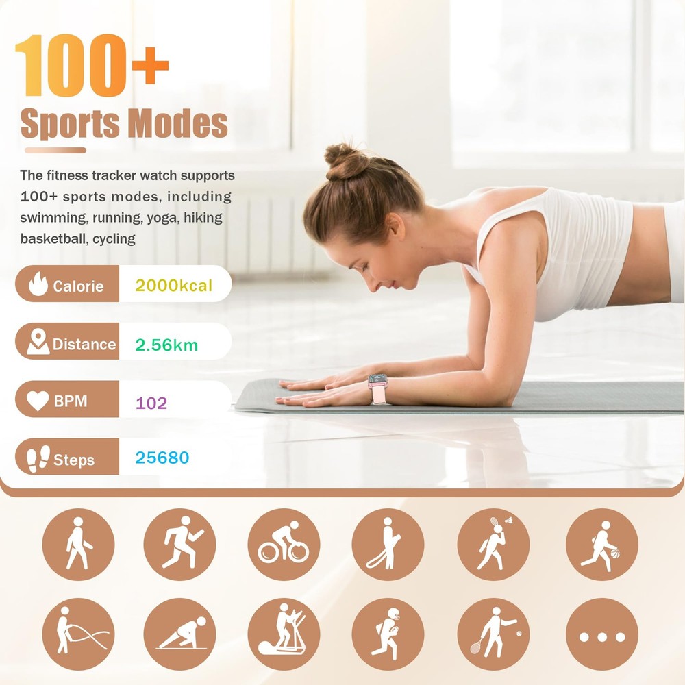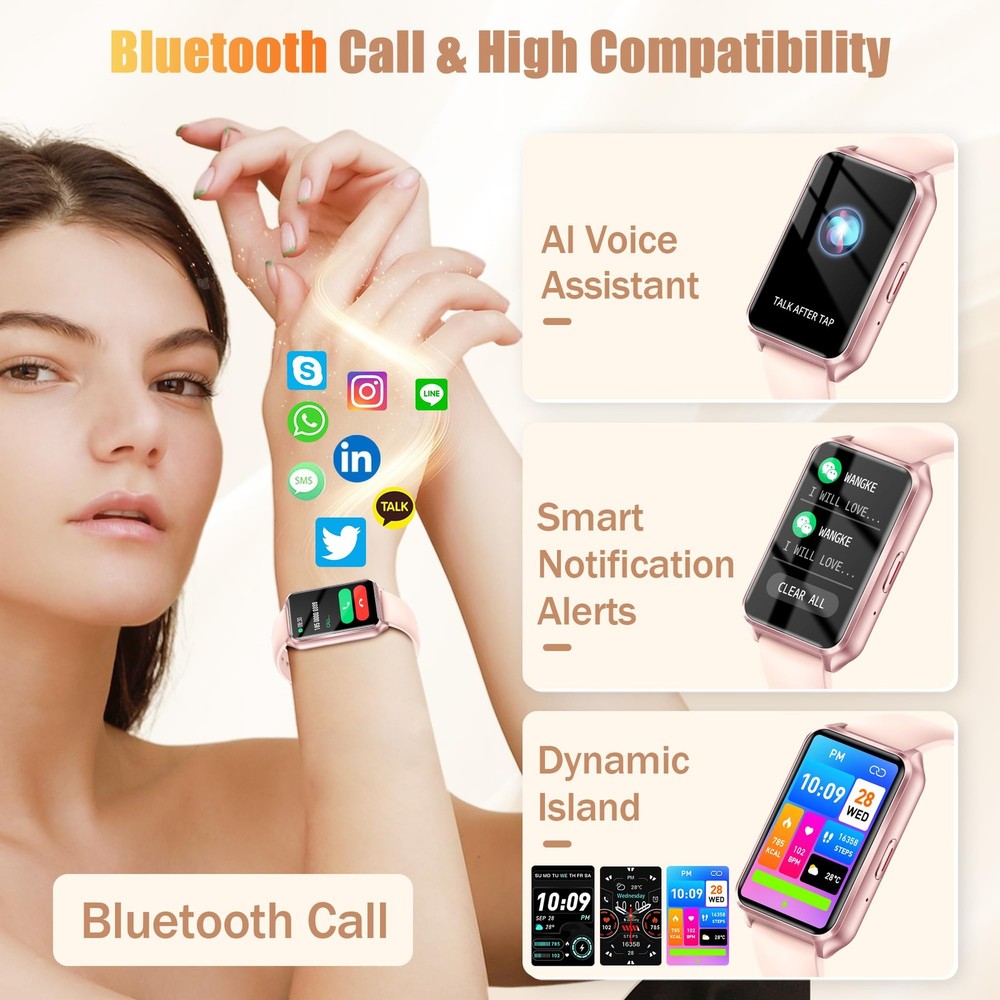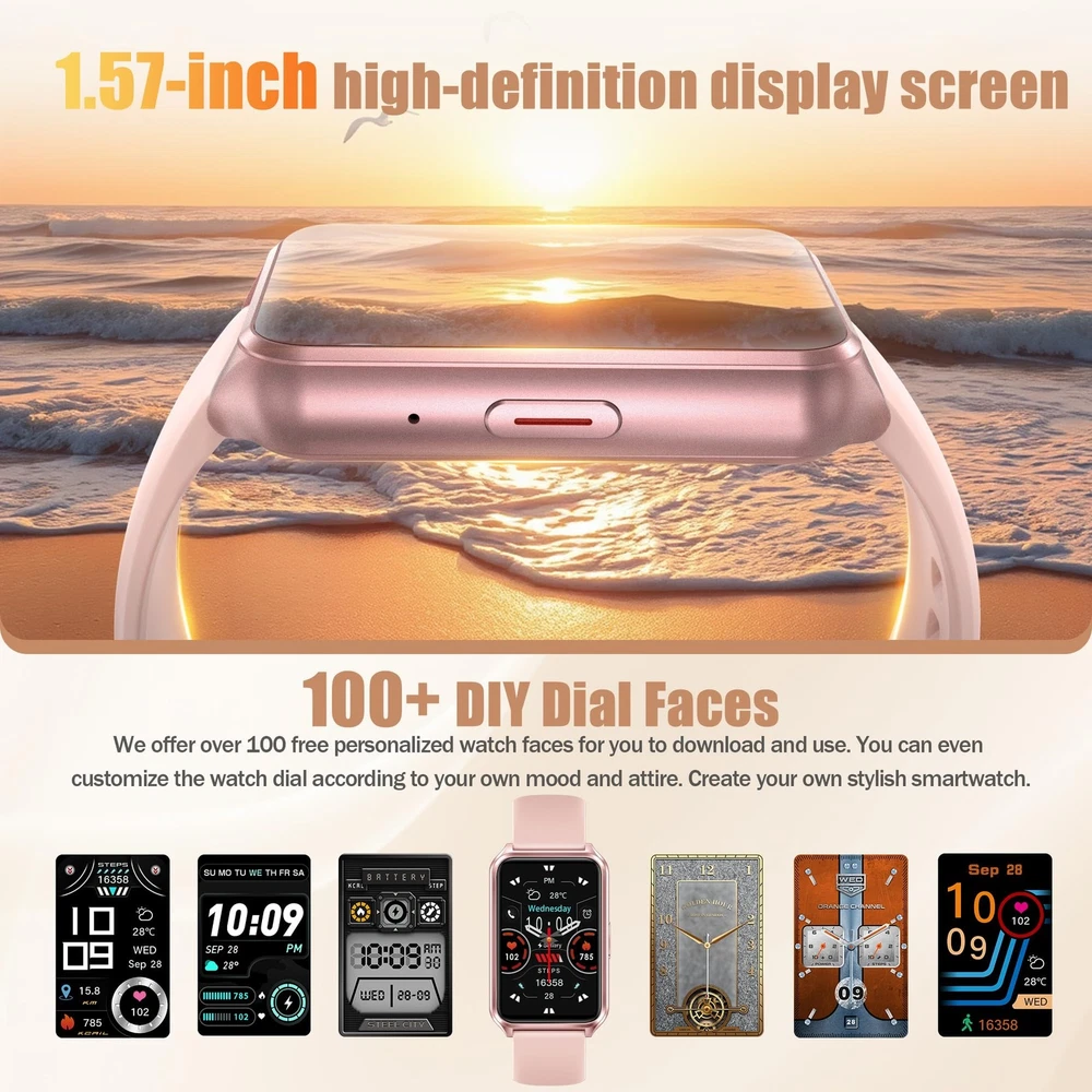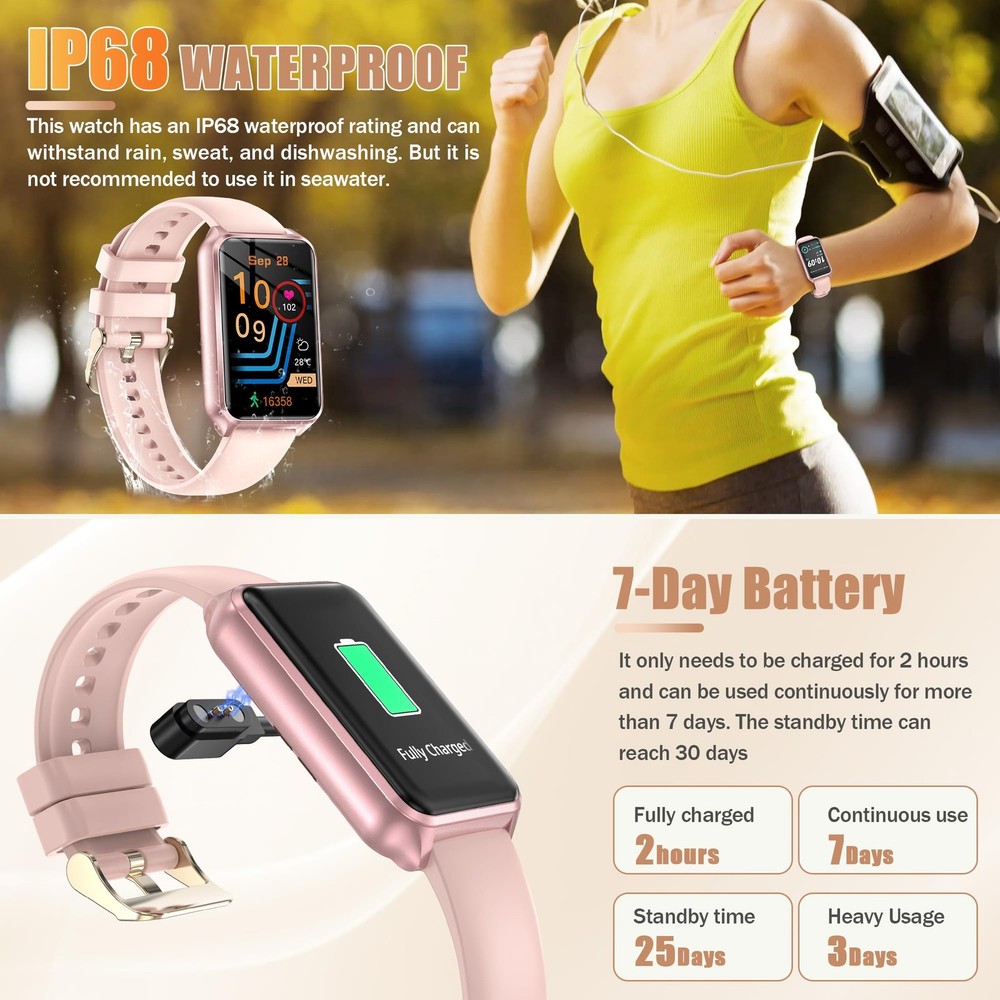 Elevate your daily wellness routine with this versatile smart watch designed for both men and women. The sleek 1.57-inch display puts your health metrics at your fingertips while enabling convenient call management directly from your wrist. This comprehensive fitness tracker monitors your daily activities, sleep patterns, and stress levels, helping you maintain a balanced lifestyle. The IP68 water resistance rating means you can confidently wear it during workouts or while washing hands without worry. Track your fitness goals, receive notifications, and stay connected throughout your day with this feature-rich smartwatch. The intuitive interface makes it easy to navigate through various health monitoring features, making it an ideal companion for anyone looking to take control of their wellness journey. Perfect for fitness enthusiasts and busy professionals alike, this smart watch combines functionality with modern style. SMART CALLING: Features Bluetooth calling capability allowing you to make and answer calls directly from your wrist with built-in speaker and microphone DISPLAY & DESIGN: 1.57-inch touchscreen display with crisp resolution and customizable watch faces for personalized style HEALTH MONITORING: Tracks heart rate, blood oxygen levels, sleep patterns, and stress levels throughout the day for comprehensive health insights FITNESS FEATURES: Multiple sport modes, step counter, distance tracking, and calorie monitoring to help achieve your fitness goals WATER RESISTANCE: IP68 rated water resistance protects against splashes, rain, and brief submersion in water 100+ Sports Modes and More Functions: This watch supports over 100 sports modes to track your different workout data accurately, including running, walking and more; It also features weather display, timer, alarm clock, music control and so on Ideal Gift for Families and Elders: This smart watch is an ideal gift for your families and seniors; It is easy to use and can work without a mobile phone, it is also comfortable to wear Bluetooth Calling Function: Using our App and connecting your phone via bluetooth, you can make and answer calls directly on this smartwatch; If there is incoming text or call, the watch will vibrate to remind you; Never miss an important info Long-Lasting Battery: With a simple magnetic charging method, the watch can be fully charged in just 1.5 hours and provides up to 7 days of battery life on a single charge. Multiple Practical Functions:The activity trackers and smartwatches with various smart features including menstrual cycle reminder, breathing training, drinking water reminder, sedentary reminder, voice assistant, weather, music, stopwatch, timer, alarm, calculator, find phone, camera control, do-not-disturb mode, making it a convenient assitant in your life. There are 12-hour or 24-hour time display format options and ℉/℃ options, set one style that fits your routines mostly. Wide Compatibility:The smartwatches are compatible with Android 4.4 / iOS 8.4 or above smartphones . Its comfortable durable, replaceable and washable strap with secure clasp is adjustable between mix 5.0in and max 9.05in, offering comfortable fit for women and men.Its slim and stylish design makes the smart watch a perfect accessory for any outfit. Whether you're hitting the gym or heading to the office, this fitness watch will seamlessly blend into your daily routine.