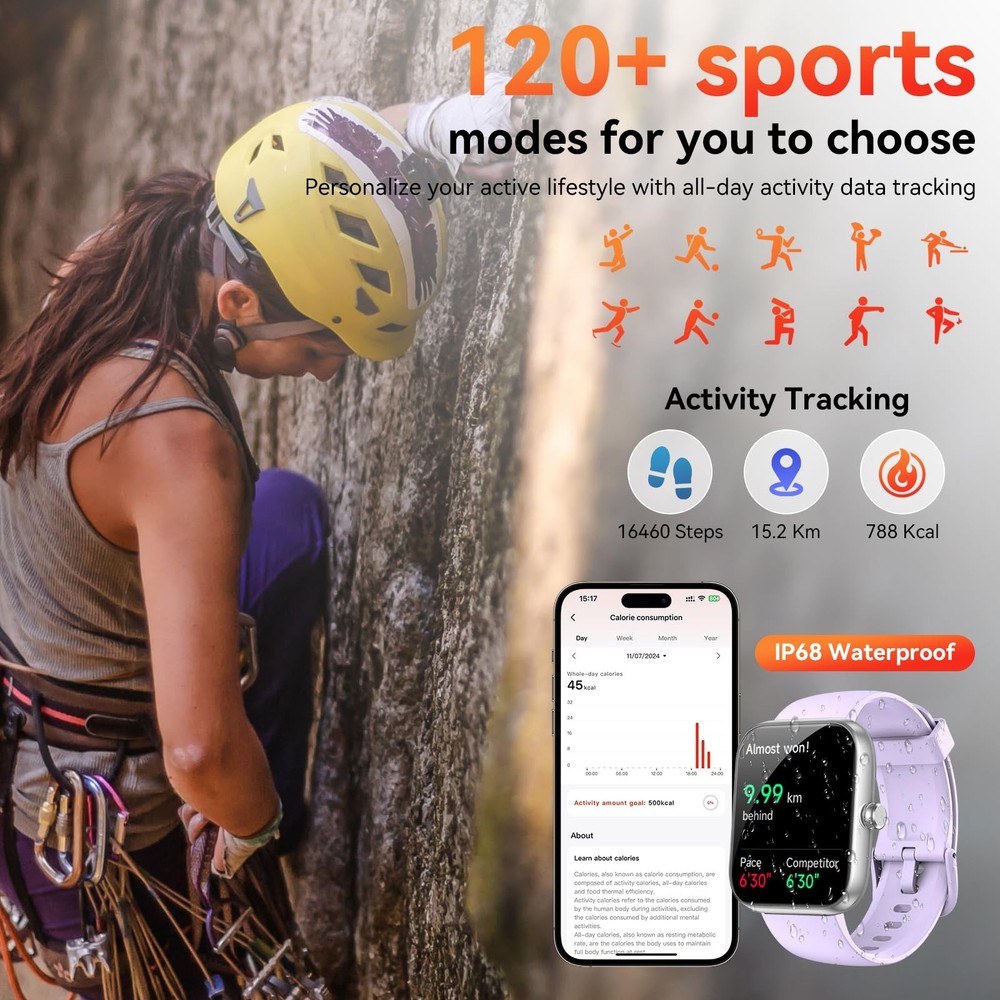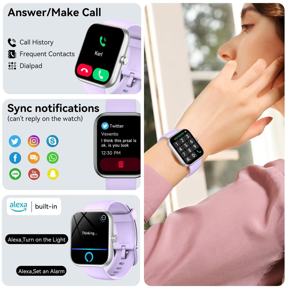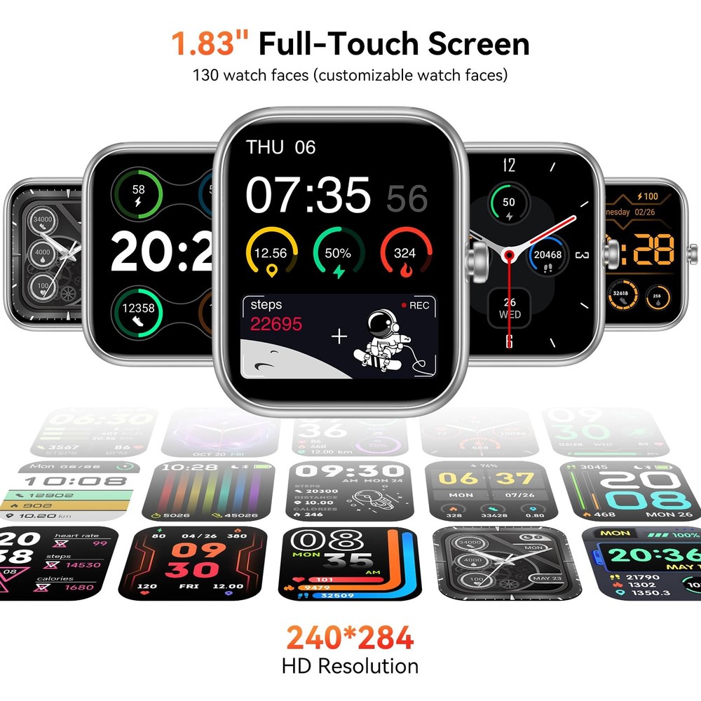 Smart Watch with Alexa Built-in, 1.83" HD Touchscreen, Bluetooth Calling, IP68 Waterproof Fitness Tracker, 120+ Sports Modes, 24/7 Heart Rate/Sleep Monitor for iPhone Android Alexa Built-In & Hands-Free Convenience: Smart watch with built-in Alexa voice assistant, control music, set reminders, check weather, and access over 6M Alexa skills directly from your wrists, life just got easier Bluetooth Calls: Smart watch for men women is powered by Bluetooth 5.3 chip Provides you with a stable connection, make or answer calls directly through the watch’s, ideal for workouts, driving, or busy days 1.83 HD Screen: Fitness tracking watch with HD screen, enjoy vivid colors and sharp details on the ultra-large touchscreen, even under sunlight, with customizable watch faces 120+ Sports Modes: Sports watch from running, cycling, swimming to yoga, monitor real-time stats (calories, distance, duration) for all activities 24/7 Health Monitoring: Fitness watch with advanced sensors track heart rate, Steps, calories, sleep quality, and stress levels, providing actionable insights for better wellness (not intended for medical diagnosis) IP68 Waterproof: Smartwatch has IP68 waterproof rating, swim, shower, or train in heavy rain worry-free; withstands submersion up to 1.5 meters for 30 minutes(Note: High water temperatures can affect water resistance) iOS & Android Compatibility: Sync effortlessly with iPhone and Android phones (iOS 10.0+/Android 6.0+), receive notifications for calls, texts, and apps (Note: Compatible with message notifications but does not support replies)