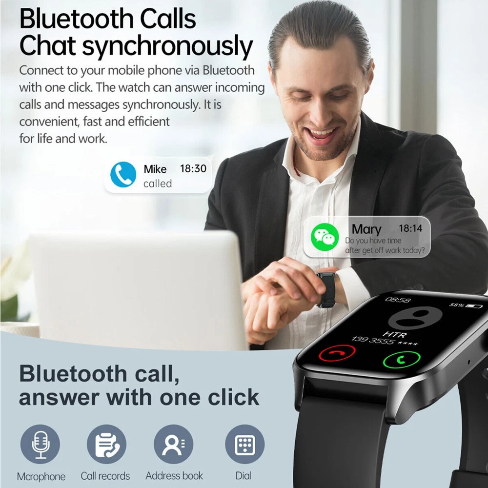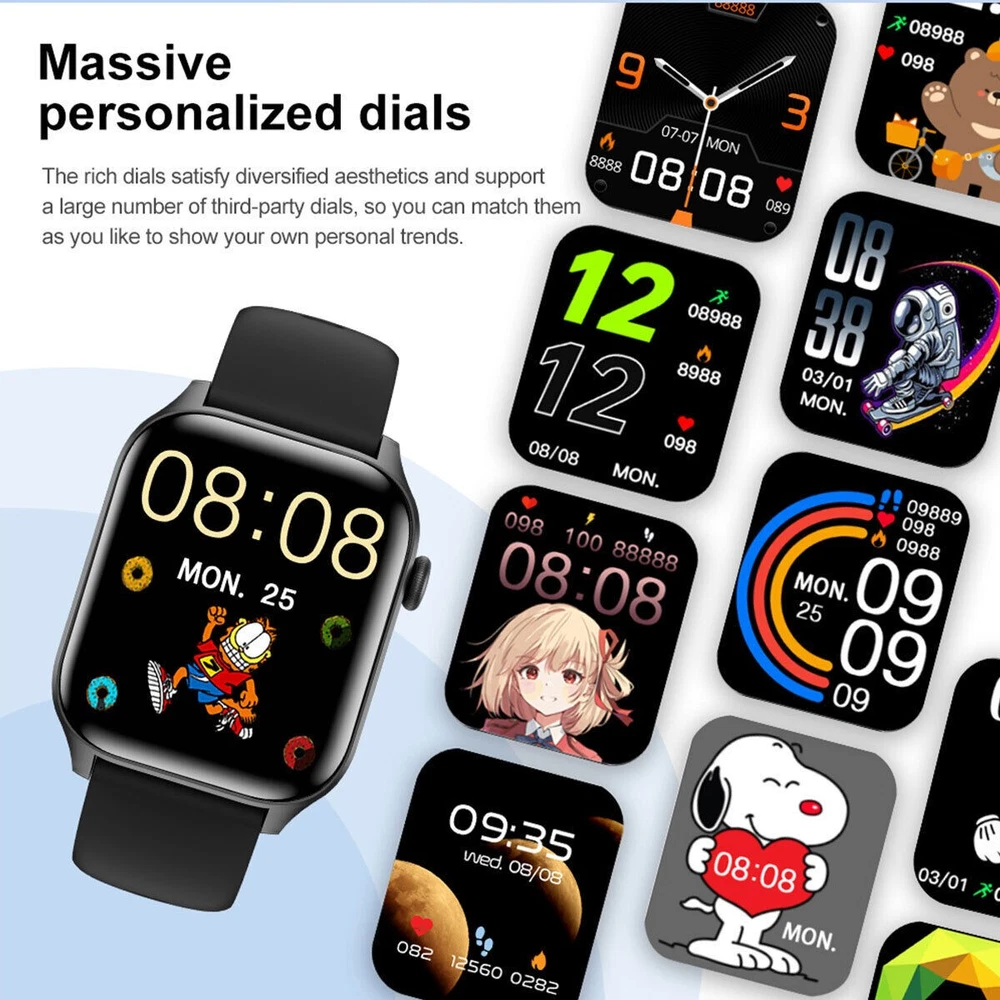 Smart Waterproof Watch Heart Rate Blood Pressure Sleep Tracker for iOS Android Features: ■1.85" High-Definition Screen The design of high-pixel display with a narrow bezel and a plastic body brings you a more expansive visual experience. ■High-fidelity large speaker, clear calls It highly restores the human voice during calls, delivering clear and natural sound with extremely strong anti-interference ability. ■All-weather health monitoring It has functional modes to monitor blood oxygen, blood pressure, heart rate, sleep, etc. in real time, helping you keep track of your health status at all times. ■Bluetooth Call for Smooth Conversations Connect your phone with one-touch via Bluetooth. The watch can answer incoming calls and receive messages synchronously, which is convenient, fast, and boosts an efficient life and work. Specification: Color: Black Weight: 85g Screen type: TFT screen Charging method: Magnetic suction charging Waterproof rating: Daily waterproof Size: 44.5 * 37.8 * 11.7mm Package list: 1*Watch, Charging Cable, Instructions