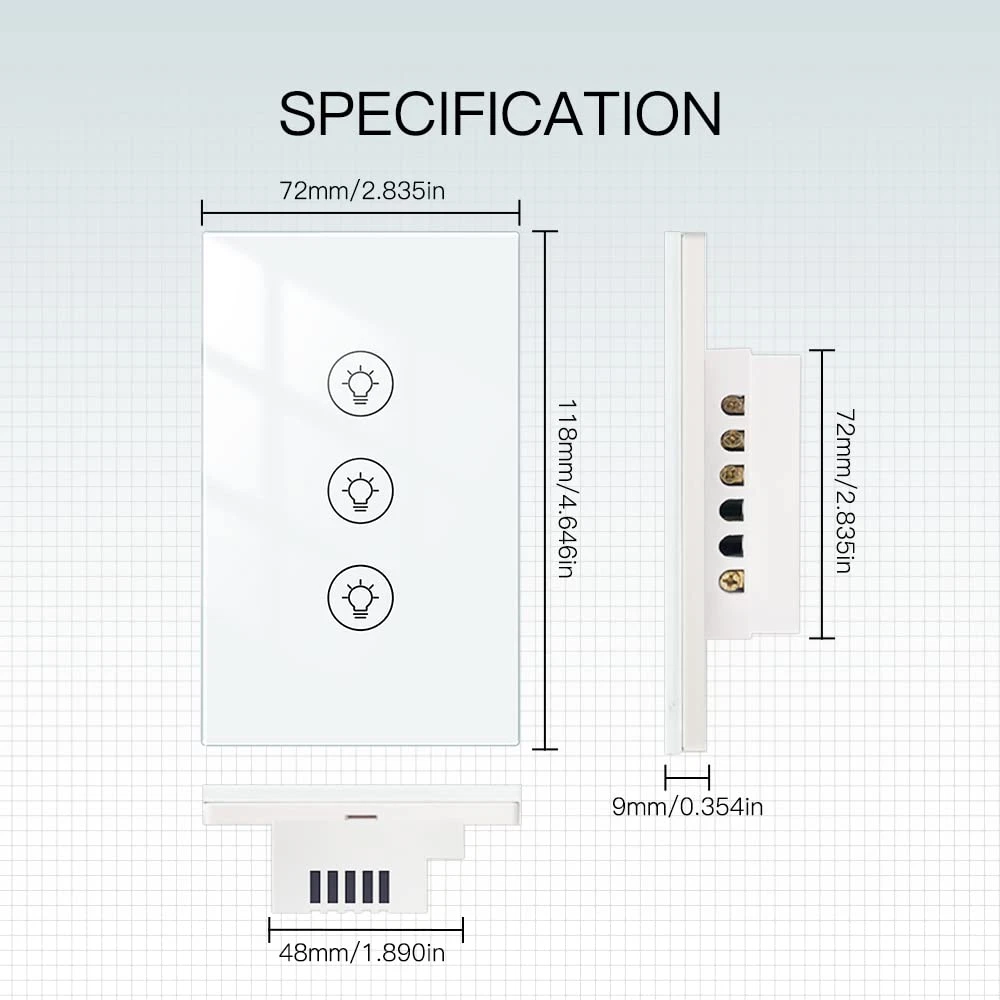 【0%-100% Triple Dimmer】Features three touch button for full-range dimming of two separate lights. This Wi-Fi double dimmer switch for led lights is compact and space-saving, perfect for both residential and commercial locations such as offices, showrooms,family rooms, home theaters, and more! Occupy only 1-gang for more controlin limited space setups,it cannot use in a 3 gang electrical box. 【Voice & App Control】Each touch button can be individually named and controlled by voice via Alexa and Google Home Assistant,just speak a simple voice like “Alexa, dimmer switch 1 to 60%". Compatible with Tuya Smart/Smart Life APP with no hub required. 【Luxury Glass Panel 】The panel is made of high quality tempered glass, making it extremely durable, moisture and water resistant. 【Timing Function】Create schedules to automatically turn the light on or off with preset brightness via Tuya/Smart Life APP app anytime, anywhere; dimming the lights with Alexa to save your eyes from harsh brightness or access the scene mode and timing mode via the app. 【Note】Neutral, Live, Load Wires are Required; Not 3 way smart switch; Cannot work with smart bulb and fans. Max. Load: 300W(INC)/110V;75W(LED/CFL)/110VProtocol: Wi-Fi 2.4GHz Product Description Product Specifications: Working Voltage: 90-250V AC 50/60Hz Max. Load: 600W(INC)/220V;300W(INC)/110V; 150W(LED/CFL)/220V;75W(LED/CFL)/110V Protocol: Wi-Fi 2.4GHz Working Frequency: 2.4G Wireless Distance(outdoor): 20-30M MOES Wi-Fi Smart Dimmer Light Switch Easily set the ambiance of any room and control your lights from anywhere with Moes Dimmer Switch.,it can easy replace the traditional switches directly,then you can start controlling your lights from your mobile phone by 'Smart Life' APP(ios or android).The smart dimmer light switch also a normal switch,simply touch the switch to dim or brighten your lights. Package listing Smart Dimmer Switch*1 User Manual*1 Screw*2 Hands-Free Voice Control After paired with Amazon Alexa or Google Assistant,you can turn your lights on/off or dim/brighten your lights just by your voice. Ultimate Beauty Ingenuity design Beauty appearance,Highly texture. Toughened Glass Surface Prevents the scratch from knives or something hard. Dampproof available for humid operation. Fire Retardant Strengthen protection for the short circuit of power lines. Group Control You can remotely Control Your House lights on smart phone. Touch Dimming Add schedule for flexible timer control of Your Lights with countdown featured.Timer your schedule for all three lights or set individual one for each lights without interference. Sharing device to family membeer. Neutral line required. No hub required. WIFI 2.4G (Not 5G)