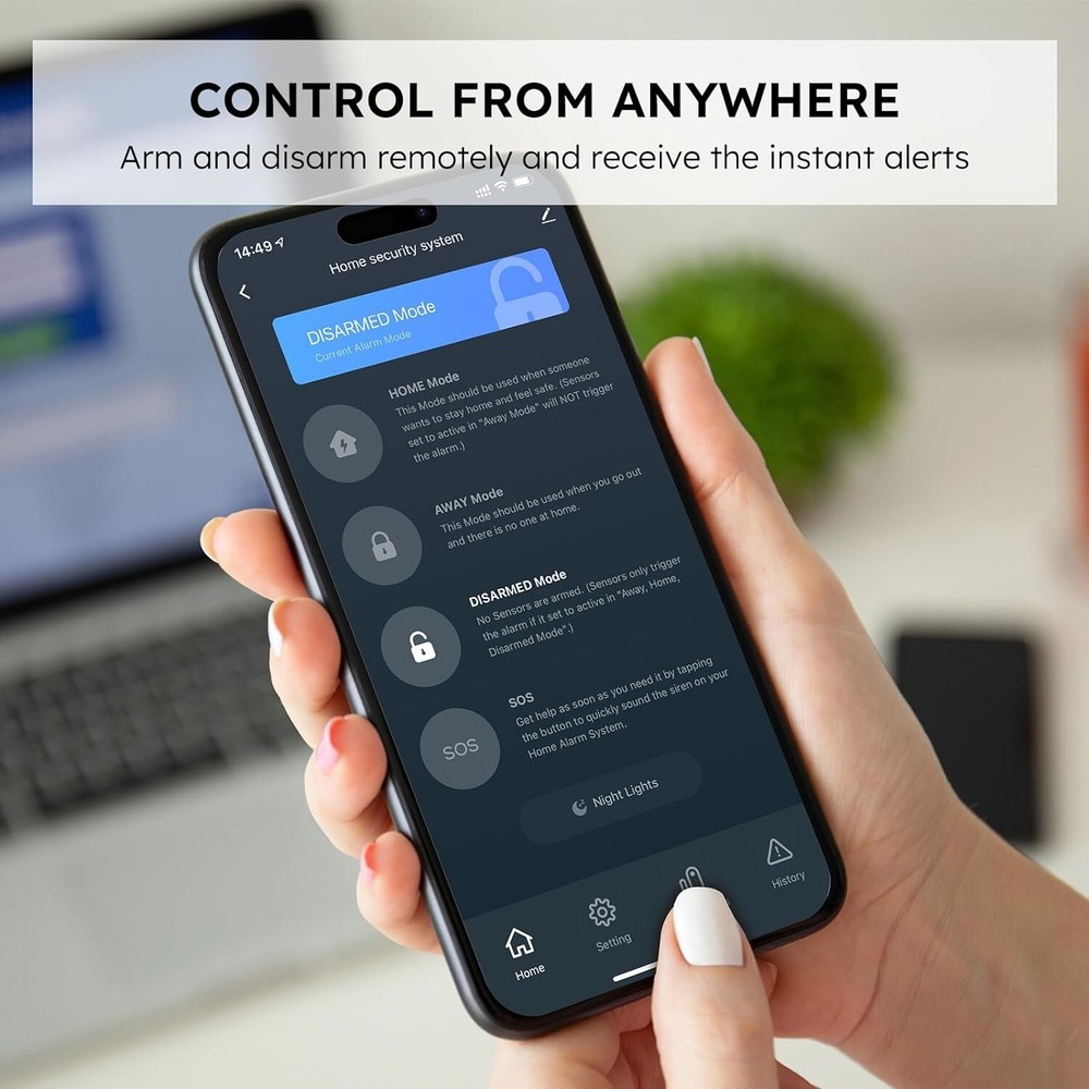 WiFi Door Alarm System, Wireless DIY Smart Home Security System, with APP Alert, 8 Pieces-Kit Alarm Siren, Door Window Sensor, Remote, Work with Alexa, for House, Apartment, by ALPHA WIRELESS SECURITY SYSTEM: A smart way to protect your house with Smart Home Security System. 8-piece kit includes the 1 alarm siren station, 5 windows & door sensors and 2 remote controls. No contracts and No subscription fee. SMART ALARM SYSTEM for Home: Alarm Security System is an affordable solution for your apartment security. You have full control over the door alarms for home security through your smart and get instant notifications of alarms alert in your house or apartment. CUSTOMIZATION: You can add extra door and window sensors, motion detectors, wireless doorbell, and water detectors to different rooms in your home security systems;It supports expansion of up to 20 sensors and 5 remote controls/keypads, which can be added to the WiFi alarm station. DIY INSTALLATION: Easily set up Wireless Home Security System in minutes without tools. The wireless connection devices does not damage the wall. The alarm station should ALWAYS CONNECT to AC adapter. The backup battery works for 8 hours, only as an emergency battery. VOICE CONTROL and WIFI Network: Your Home Alarm System can be easily controlled by Away, Disarm, and Home modes with your voice. Works with Alexa and Google Assistant. WIFI connection, Only works on WiFi network, does NOT support 5GHz WiFi networks.