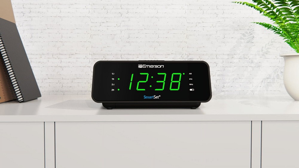 With Emerson Radio Corp.'s Award-Winning and Patented SmartSet Technology, the flashing "12:00" display is a thing of the past. The CKS1900 clock radio automatically sets itself on the first use to the correct year, month, date, day, and time. The clock radio features a large, easy-to-read LED display with dimmer control so it is easy on your eyes in the dark. The alarm can be programmed to operate on weekdays only, weekends only, or all seven days of the week. The alarm displays the month and date with the touch of a button. Set the alarm to wake you to your favorite AM/FM music or news station, or to the buzzer. The clock radio adjusts itself automatically for daylight savings time and leap year, as well as maintains the correct time when the power returns after power outages. Getting out of bed will no longer be a chore with the help of the CKS1900. Digital Tuning AM/FM Radio with unit Dimension: 6.1 w x 4.9 D x 2.5 H, battery included Easy-to-Read, 0.9 Jade Green LED Clock Display Automatically sets itself to the correct Year, Month, Date, Day and Time as soon as you plug it in and after every Power Interruption Snooze/Repeat Alarm, Programmable Sleep-to-Music Timer, Wake to Radio or Buzzer Alarm 4-Level dimmer for LED display