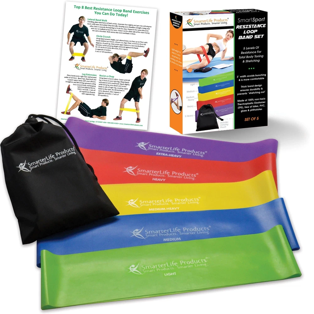 Increase Your Fitness Level Now - When you purchase the SmartSport Resistance Loop Band Set, you'll improve fitness level, increase strength, & enhance balance - Strengthen your core, target muscle groups - abs, thighs, glutes, arms, lower & upper back - Perfect for rehabilitation, physical therapy, cross-training, core strength work, CrossFit, yoga, Pilates, and during & after pregnancy Unique, Exclusive Design - Each band is 12 inches long and 3 ¼ inches wide - A full 1 ¼ inch wider than typical resistance bands - Extra width ensures comfort, no bunching or pinching - Prevents tearing, ripping, snapping and "stretching out" Band Specifications - Light band is .45 cm thick, up to 8 lbs resistance, and can be stretched 24 inches - Medium band is .55 cm thick, 8 - 15 lbs resistance, and can be stretched 24 inches - Medium-Heavy band is .65 cm thick, 15 - 20 lbs resistance, and can be stretched 24 inches - Heavy band is .75 cm thick, up to 20 - 25 lbs resistance, and can be stretched 24 inches - Extra-Heavy band is .85 cm thick, up to 25 - 30 lbs resistance, and can be stretched 24 inches Highest Quality, Durability & Eco-Friendly - Made of non-toxic Thermoplastic Elastomer (TPE) - TPE materials are highly-elastic and durable - TPE is also ECO-FRIENDLY - Requires less energy to produce, minimizes waste products & is recyclable (unlike latex, rubber) - Won't cause skin irritations or rashes - Bands are free of latex, PVC, glues & Phthalates What's in the Box - SmartSport Resistance Loop Band Set of 5 (Light, Medium, Medium-Heavy, Heavy, Extra-Heavy) - Travel pouch - BONUS: "Top 8 Best Resistance Loop Band Exercises You Can Do Today" PREMIUM RESISTANCE BANDS FOR HEAVY STRETCHING: Our exercise bands weigh only 7 ounces and can fit perfectly in a backpack, gym bag, or carry bag during yoga, Pilates, physical therapy, or any fitness workout. This will become an essential piece of your home gym equipment you can take wherever you travel. EXTRA WIDE RESISTANCE BANDS: Unlike other elastic bands, ours offer more coverage with a 3.25-inch width and a 12-inch length. They won't roll or pinch so you can focus on toning and strengthening your abs, arms, shoulders, legs and butt, hips, thighs, ankles, and booty. Also, unlike other resistant loops, these exercise bands won't stretch out of shape and are perfect for your calisthenics exercises. FIVE STACKABLE RESISTANCE OPTIONS: Our heavy-duty loop bands come in a set of 5 bands - Light, Medium, Medium-Heavy, Heavy, and Extra-Heavy. Each elastic band is color-coded and labelled based on its tension level. Start with one or two Light or Medium resistance bands and move up to Medium-Heavy, Heavy to Extra-Heavy for a greater, more intense workout challenge. SAFE AND ECO-FRIENDLY MATERIAL: Each workout band is made of TPE, a rubber-like latex-free polymer so it's odorless and hypoallergenic for people with sensitive skin. It stretches beyond its length and returns to its original size without snapping or tearing. CONVENIENT TRAVEL POUCH: Our resistance bands' small, compact design makes them perfect for taking them on the go. Use them at home, the gym, the office, or on vacation! The convenient travel pouch is waterproof, making travelling with your SmarterLife Resistance Loop Bands simple and easy! COMPLIMENTARY WORKOUT GUIDE: Stuck on what to do or where to start? Our resistance bands come with the “Top 8 Best Resistance Band Exercises You Can Do Today” inside the box, containing easy and effective exercises you can do at home and quickly start on strength training today!