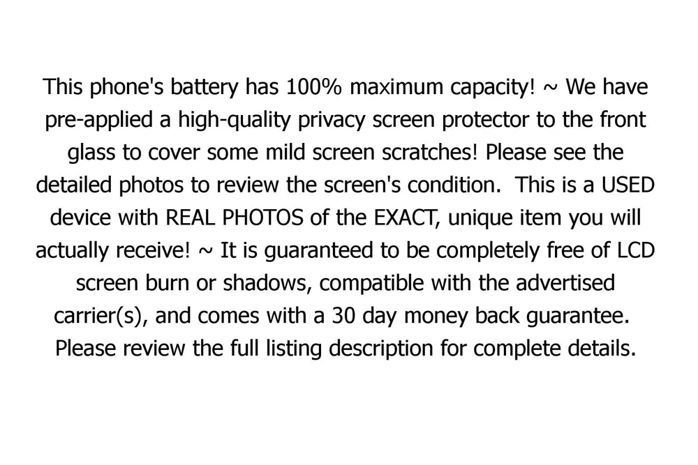 WebPage Google Pixel 7 256GB Black Verizon Smartphone w/Warranty w/ 100% batt! 7601778 This item is in EXCELLENT cosmetic condition. PLEASE SEE RATING SCALE BELOW BUT MORE IMPORTANTLY REVIEW THE PRODUCT PHOTOS! Condition Description Excellent Lightly Used - Minimal signs of wear Good Normal wear - Minor scratches or scuffs Acceptable Fairly worn - Scratches, scuffs, nicks and dents Poor Heavy wear - Major scratches, scuffs, nicks, and dents IMPORTANT: All items are fully functional unless advertised otherwise. Please review the entire listing before purchase. The following items are included with your purchase: USB Sync/Charging Cable Generic Retail Box 30 Day Warranty Free Shipping *PLEASE NOTE: A wall charger adapter is NOT included, but you can purchase one here: WALL CHARGER LISTING UNLOCK STATUS: This item is LOCKED to Verizon. Per Verizon's guidelines, the device should unlock automatically after 60 days of active service with a Verizon SIM card. It is guaranteed to be compatible with Verizon only until it is unlocked after the 60 day period. SIM card not included! IMPORTANT NOTES: We have pre-applied a high-quality privacy screen protector to the front glass to cover some mild screen scratches! Please see the detailed photos to review the screen's condition. This phone's battery has 100% maximum capacity! ~ We have pre-applied a high-quality privacy screen protector to the front glass to cover some mild screen scratches! Please see the detailed photos to review the screen's condition. This is a USED device with REAL PHOTOS of the EXACT, unique item you will actually receive! ~ It is guaranteed to be completely free of LCD screen burn or shadows, compatible with the advertised carrier(s), and comes with a 30 day money back guarantee. Please review the full listing description for complete details. Generic Description: Domestic Shipping General Information: Once we receive your payment, your item will be shipped for FREE within one business day via USPS First Class Mail. Depending on your location, you may also have the option to upgrade to a faster shipping service. Please see below for information on cost and transit time. Business days do not include weekends or holidays. USPS First Class Mail (Cost = FREE) : Estimated delivery 2-6 business days after purchase depending on your delivery location. This includes one business day for processing and one to six business days for delivery. FedEx 2Day Shipping (Cost = $5.99) : Estimated delivery 2-3 business days after purchase depending on your delivery location. This includes one business day for processing and two business days for delivery. FedEx 1Day Shipping (Cost = $69.99) : GUARANTEED delivery 1 or 2 business days after purchase. This includes one business day for processing and one business day for delivery. International Shipping General Information: We are proud to offer International shipping to many countries through the eBay Global Shipping Program! The item will be shipped to an eBay approved export facility in Erlanger, Kentucky, USA. From there, the item will be exported to your international delivery address. This item includes a 30 day warranty through our online store. If your item is received in a condition other than described, please contact us directly by phone or email for an immediate solution. When purchasing from us, you can rest assured we are 100% committed to satisfying our customers and are proud to stand behind our products with a Full 30-Day Money Back Guarantee. Please do not leave low ratings on our account without contacting us first by phone or email. We proudly accept all payment methods supported by eBay Managed Payments! Payment is due immediately upon purchase. eBay requires that we ship only to the address provided with your payment at the time of checkout. Please make sure the shipping addres you provide to eBay is correct prior to confirming your payment. If you have any questions or concerns before or after receiving your item, please do not hesitate to contact our customer service team by clicking on the button below. Please make sure to reference an eBay item number with your message. E-mails are answered Monday through Saturday in the order they are received. Please allow up to 24 hours for a response to your message. Rest assured all customer inquiries are a high priority and will be responded to in a timely and professional manner. Your satisfaction is guaranteed!