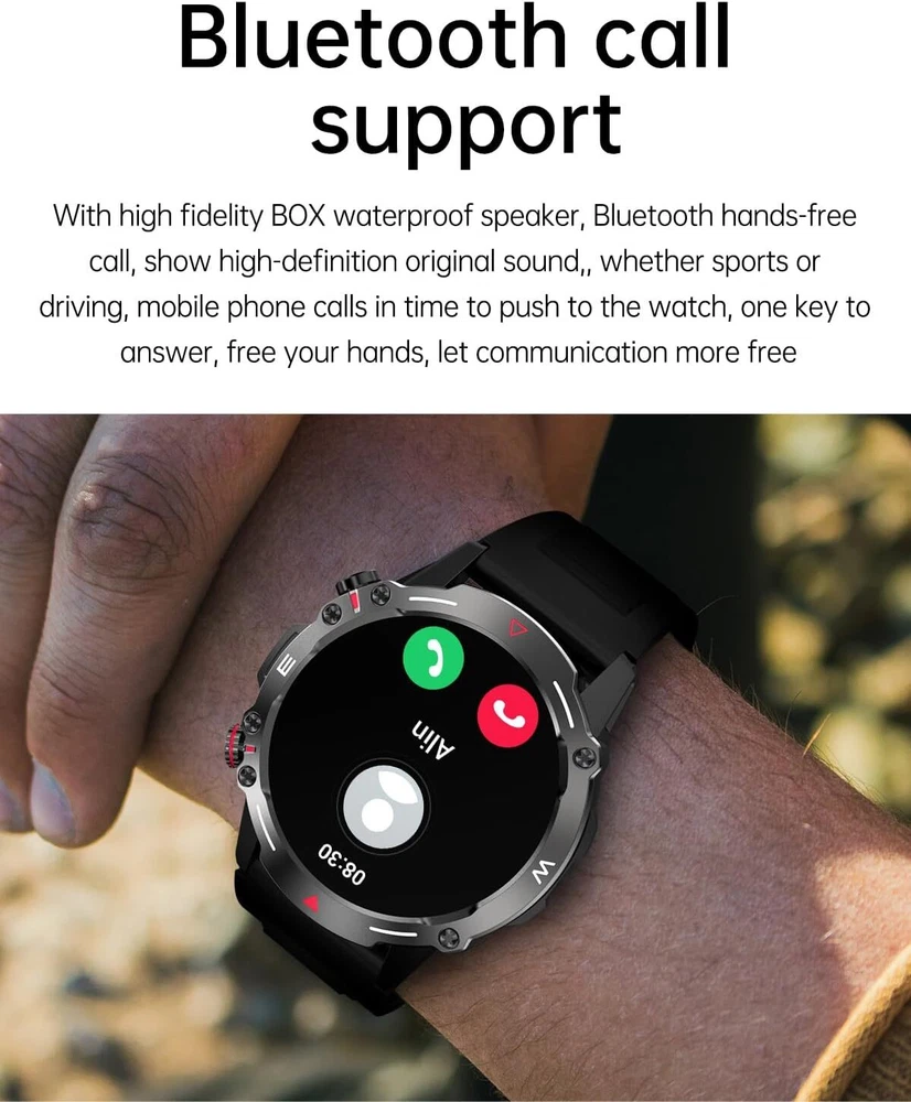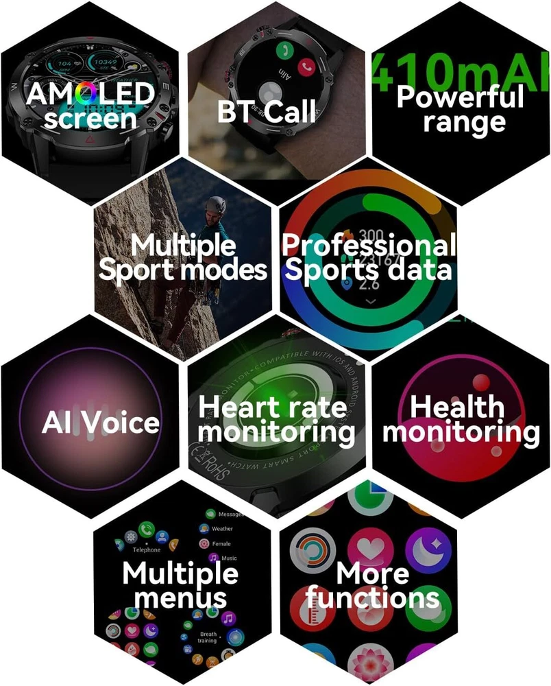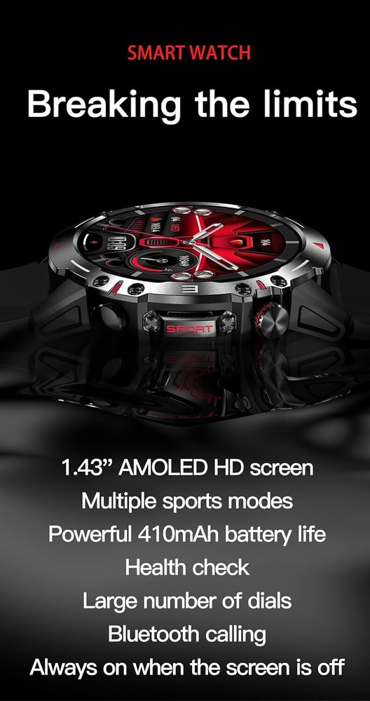 Smartwatch with AMOLED Display & Bluetooth Calling Experience a premium wearable with a vibrant 1.43" AMOLED full-touch screen (466×466), delivering ultra-clear visuals anytime. Key Features: Bluetooth Calling & Voice Control: Make and receive calls directly on your wrist with built-in voice assistant support. Comprehensive Health Tracking: 24/7 monitoring of heart rate, blood oxygen, blood pressure, sleep, steps, calories, and sedentary alerts. Smart Lifestyle Tools: NFC for offline payments, weather updates, music control, message notifications (SMS, WhatsApp, etc.), alarms, and Find My Phone. Customization: Access 100+ watch faces and upload your own photos for a personalized look. Durability & Battery: IP68 waterproof rating for daily wear and workouts. Battery lasts 5-7 days, with standby up to 30 days. Fast magnetic USB charging in ~2 hours. Compatibility: Works seamlessly with Android and iPhone devices.