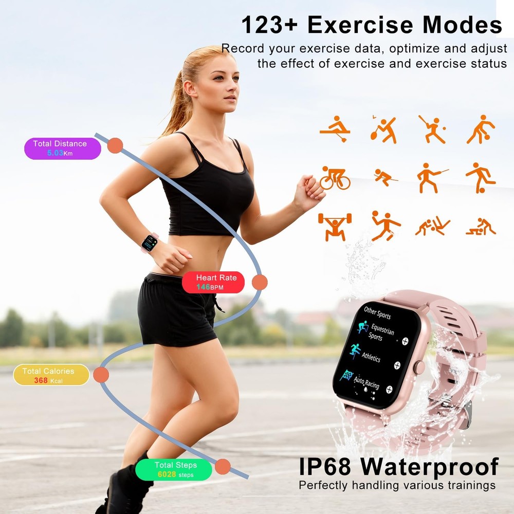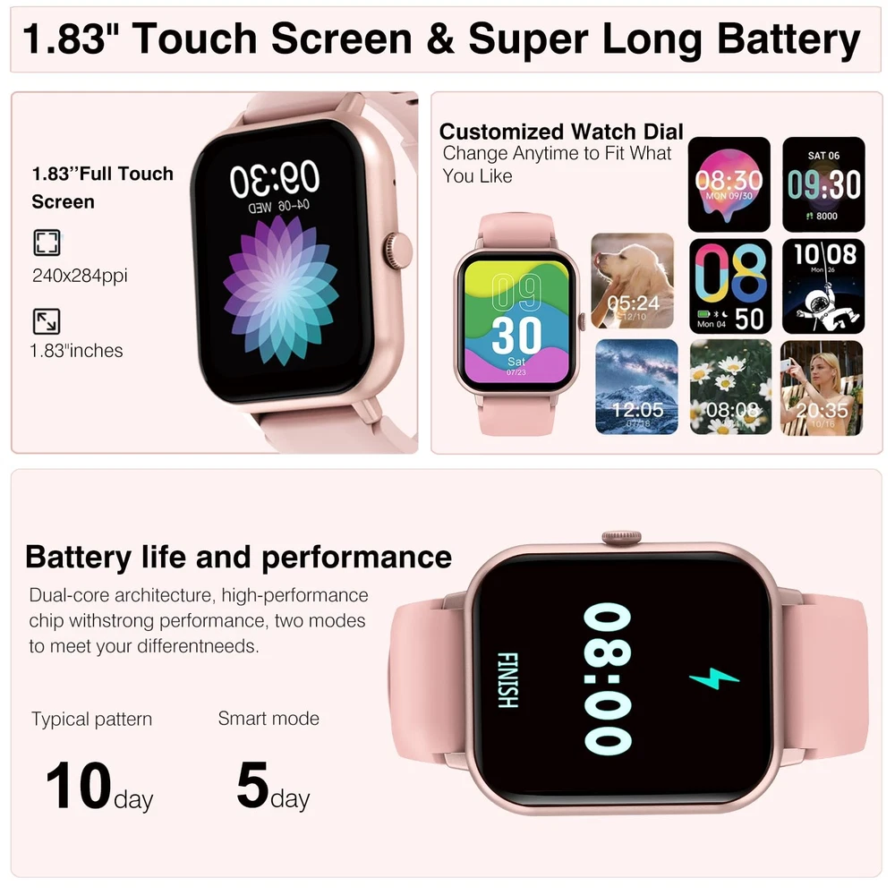 Get better results from your workout routine with smart watches for women men. Track more exercises than ever right from your wrist with 123+ exercise modes and never miss a beat with calls, texts and notifications right on your wrist. Smartwatches can help you manage your health and keep track of your information. ●App Download :Download and install the "DaFit" app on the App Store, Google Play or by scanning the QR code below. ●Pairing :Turn on "DaFit" app -> Activate Bluetooth connection on your phone -> Search on the app for the device to pair with (or scan the QR code on the device) -> Finish binding on the app (or on the device). ●Bluetooth Phone Call : To make and receive calls successfully, and make sure the device is binded with the blutooth "ZL54C". Tips: 1. A pop-up window will pop up after logging in to the APP, please always allow the APP to access the mobile phone to send and view information, device location information, address book, make calls and manage calls, call records, device information, and other permissions. 2. During the connection process of mobile phone Bluetooth, the mobile phone will pop up a Bluetooth pairing request, please select to allow pairing. ⌚【Blutooth Calls & Message Reminders】:This full-screen fitness activity smartwatch for iPhone and Android phones uses the latest Bluetooth 5.2 to answer calls/voice control/store contact information/view call logs. In addition, the Bluetooth smartwatch can hang up calls, receive and display WhatsAPP/Text/Facebook/Twitter/Instagram alerts. It gives you the freedom to socialize and have fun on your wrist. ⌚【Your 24 Hour Daily Health Monitor】:Track your health and fitness goals with this smartwatch. Multi-functional Andriod smartwatch monitors heart rate, stress levels and sleep tracking in real time. Your sleep can be monitored in different modes, including light and deep sleep. All recorded data can be synced to your phone for analysis, providing valuable insights into your health and helping you make lifestyle adjustments. ⌚【IP68 Waterproof & 123+Sports Modes】:This women's watch has IP68 waterproof, you don't have to worry about the watch's normal use, even while swimming, washing your hands, or exercising in the rain. Built-in 123+ kinds of regular motion modes. It can also provide data on 8 types of exercise, according to different exercise modes, the data such as steps, exercise time, GPS exercise track(smartwatch APP View), calories, exercise heart rate tracking, mileage and so on are displayed respectively. ⌚⌚【More Functions Smart Watch】:This fitness activity smart watch full screen for iPhone and Android phones includes a bunch of new features including: Weather forecasts, Stopwatch, Timer, Music control/ play,Adjustable brightness, find phone/ watch, Breathing training, Smart alarm clock, Camera control, Women health, Sedentary reminder, ect. It can support android and iPhone phones(Android6.0 and above IOS 9.0 and above). ⌚【Larger 1.83'' Full Screen Watch & Super Long Battery】:1.83" touch screen color smart watch women with 240*284 resolution ratio, brings you a unique visual and better interactive experience. The android smartwatch built-in 230mAh high-capacity battery. Fully charged in 2.5-3 hours, the battery can be used for 5-10 days, Normal use for 7 days and standby for 30 days.