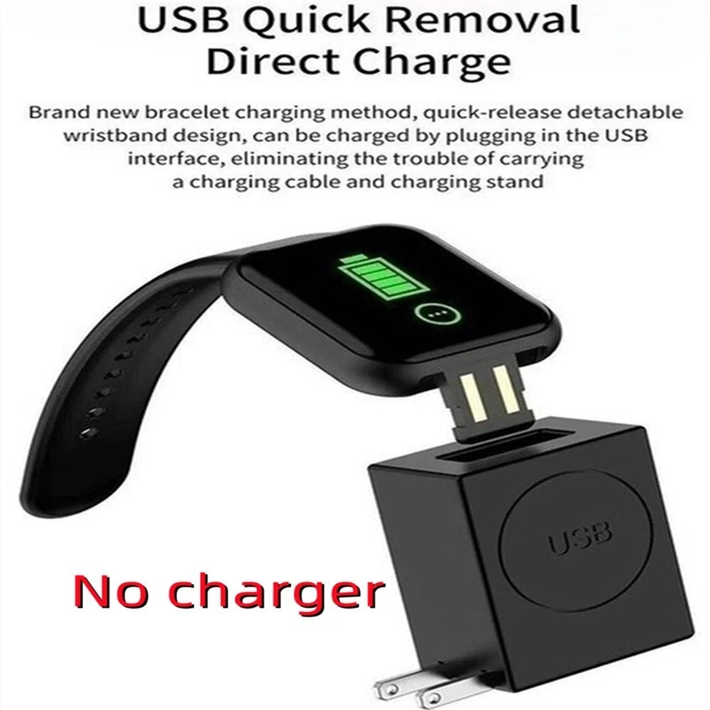 Package Contents: 1 Smartwatch, 1 Manual, 1 Box (Note: No charger included). The box may be damaged after long transportation, but the watch is fine. Thank you for understanding. Dear buyers, this watch does not require a charging cable; it can be charged directly via a charging head or USB interface. How to Use: Charge it properly for 30 minutes upon receiving it. It may have run out of power after long shipping. Press and hold the circular mark at the bottom of the screen to turn on the device. Watch operations are also performed by pressing the circular mark (the screen is not touch-sensitive; it can only be operated by short or long pressing the circular icon). Before use, scan the QR code in the manual to download the app and connect it to the watch via the app. Always allow the app access to all phone functions and keep it running in the background. Features: Smart Life Assistant: The watch tracks steps, calories, heart rate, distance, sleep quality, and more throughout the day. It can also connect to a smartphone to display notifications, take photos remotely, locate the phone, provide sedentary reminders, alarms, and other practical functions. These features help you stay informed about exercise intensity and physical condition to adjust your fitness plan in real-time. Skin-Friendly Material: The bracelet is made of soft, lightweight, and skin-friendly TPU material with a lightweight design that ensures comfortable wear. New Bracelet Charging Method: Features a detachable quick-release strap design. It can be charged by connecting it to a USB interface, eliminating the need to carry a charging cable or dock. App Language Support: Supports multiple languages including English, French, Italian, Japanese, Korean, Polish, Portuguese, Russian, Spanish, Chinese, and more. Notes: As firmware is continuously updated, the user interface may also change. Images are for reference only; the actual product will prevail. Download the app and pair the watch before use. Do not pair the watch directly through your phone's Bluetooth settings. If already paired, remove the watch from the phone's Bluetooth device list. Use a charger with an output below 1A. Chargers with output above 1A or fast chargers may not work. This product is only splash-resistant (cold water). Do not use it for swimming, washing hands, submerging in water, or any other activities involving prolonged water exposure.