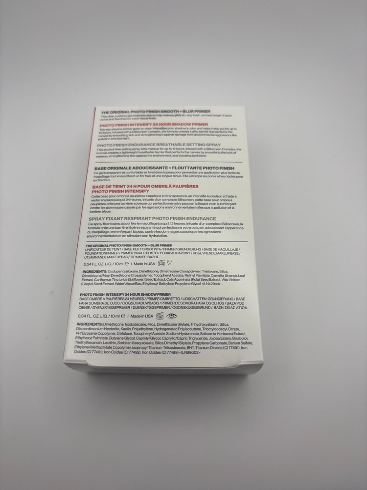 A $59 Value. A three-piece eye and face set from Smashbox for prepping and setting on the go with a full-size eye shadow primer, mini blurring primer, and mini setting spray. Meet the Photo Finish staples: Intensify 24 Hour Shadow Primer intensifies shadow’s color and helps it stay put for up to 24 hours. The Original Smooth & Blur Primer smooths the look of pores and fine lines. Endurance Breathable Setting Spray sets makeup for up to 12 hours while boosting hydration. Vegan and cruelty-free. This Kit Includes: • Full-Size Photo Finish Intensify 24 Hour Shadow Primer: 0.34 fl. oz./10ml • Mini The Original Photo Finish Smooth & Blur Primer: 0.34 fl. oz./10 ml • Mini Photo Finish Endurance Breathable Setting Spray: 1 fl. oz./30ml How To Use: Photo Finish Intensify 24 Hour Shadow Primer • Smooth a thin layer over bare lids or brows. • Let it dry for about 60 seconds before applying makeup. • Studio Tip: Use to tame brows or set brow powder. The Original Photo Finish Smooth & Blur Primer • Smooth a layer over clean, moisturized skin • Let it set for 15 seconds • Wear alone or under makeup • Can also be used over makeup for touch-ups • Studio Tip: Try it in your hair to tame frizzies. Photo Finish Endurance Breathable Setting Spray • Hold bottle 8-10” from face, close mouth and eyes, and mist onto skin evenly. Avoid spraying in eyes. • Studio Tip: Spray in an X motion across the face for even application.