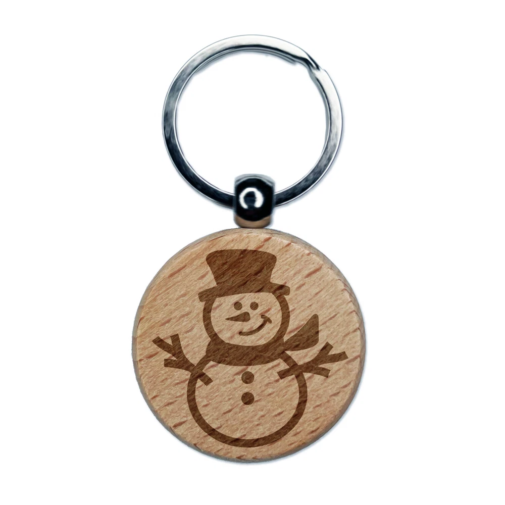 Smiling Snowman Winter Christmas Engraved Wood Round Keychain Tag Charm