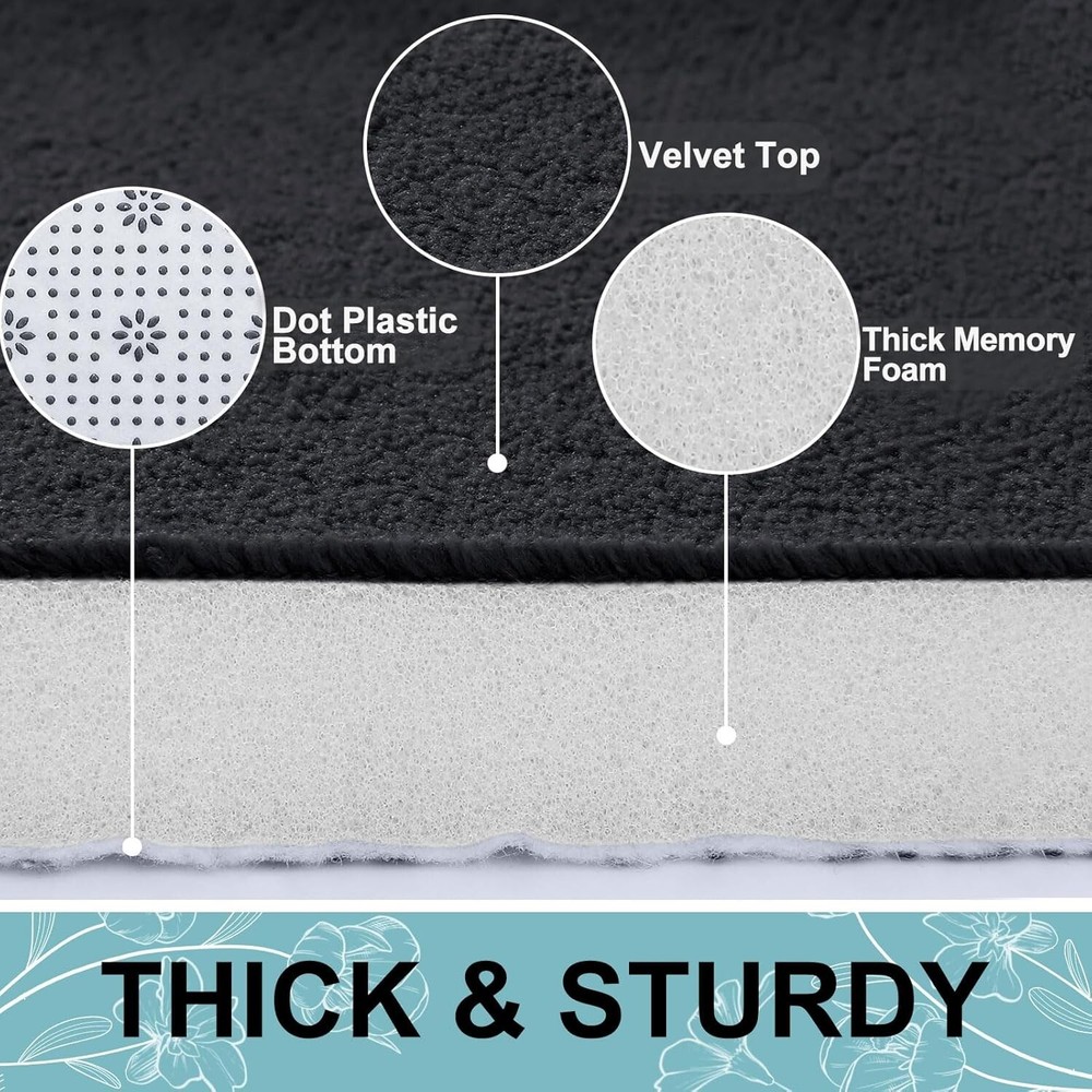 Memory Foam Bath Mat 24x16, Extra Soft and Absorbent Bathroom Mats, Non Slip Washable Carpet for Floor, Shower and Tub, Black About this item Polypropylene EXTRA SOFT & COMFORTABLE - Smiry bath mats are filled with high-density polyurethane memory foam that soothes tired feet and shields toes from the cold floor. The flannel outer material, ultra-soft and cozy, relieve pressure and fatigue on your feet. Let you enjoy the comfort of standing on the clouds! FAST WATER-ABSORBENT - Smiry bath rugs with soft flannel layer can quickly absorb moisture, make your feet dry immediately, and the water does not stay on the surface of the bath mat, helping to keep your floors clean and dry. NON-SKID PVC BOTTOM - Our bathroom mats have thousands of dots on the underside, which are much stronger for long lasting use, unlike other brands where the backing tends to wear and peel off after a number of washes. WARNING: Ensure that the area underneath the mat is kept dry for optimum performance and test to ensure that it does not move before use. MULTI-PURPOSE and EASY CLEAN - Smiry bath mats are made of memory foam, available in multiple sizes and colors, can be widely used in bathroom, kitchen, living room, laundry room, hallway, bedroom, balcony, etc. Choose from various colors and sizes to harmonize with your home decoration seamlessly. The mats are machine washable, place the mats in the washer using cold water on the gentle cycle. Don't use chlorine or bleach. Tumble dry on low heat or dry naturally. REMOVE CREASE - Our bath mat is carefully rolled for packaging. To effectively remove the creases, please follow these steps: 1. Place a damp towel over the folded areas of the bath mat; 2. Gently press and move the iron over the mat periodically, detailed ironing tips are given on the product detail page. This process should significantly reduce the creases. Once the creases are minimized, the bath mat can be placed anywhere in the bathroom. B08TGZKG75