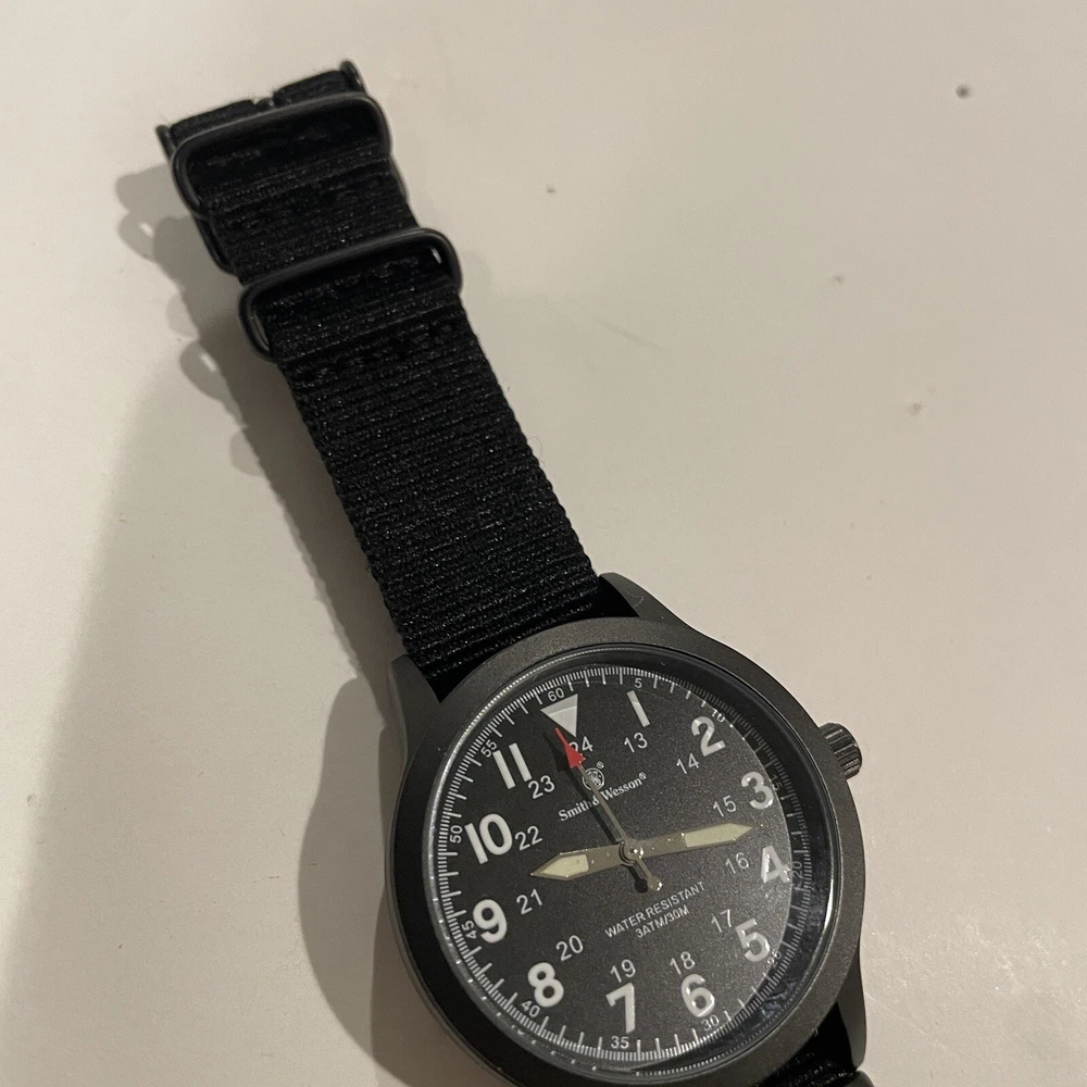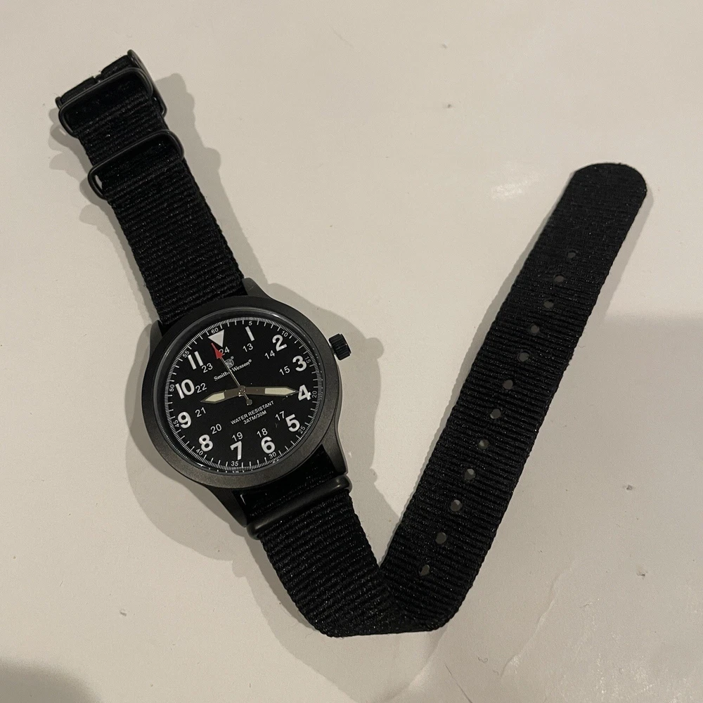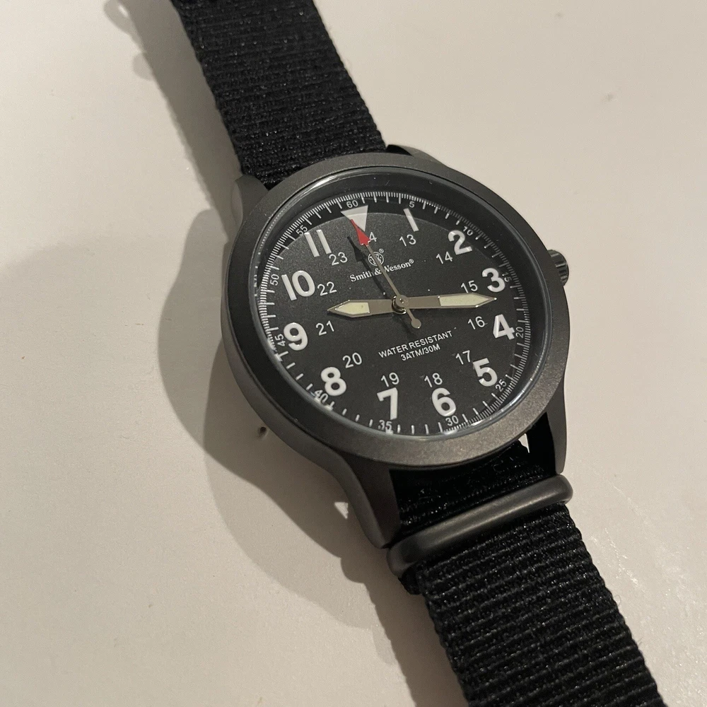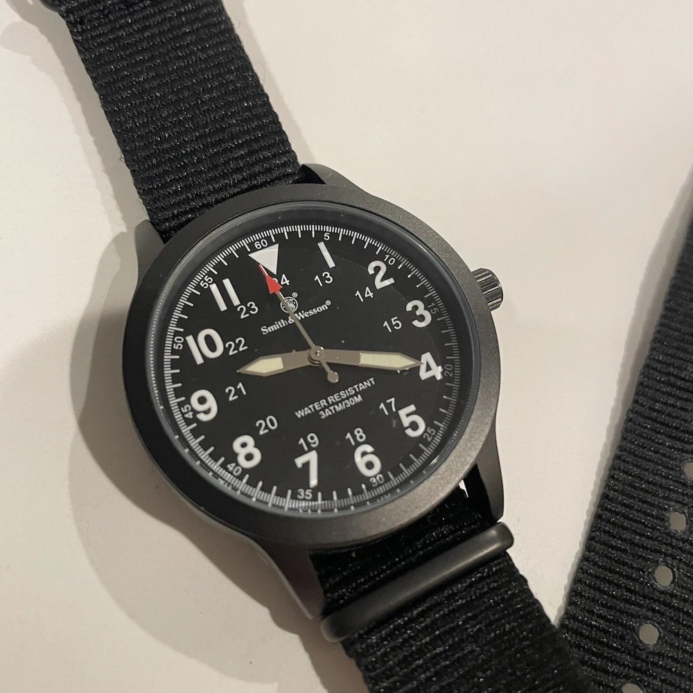 Crafted for durability and functionality, the Smith & Wesson Black Canvas Tactical Field Watch boasts a robust military case designed to withstand demanding conditions. The unisex timepiece features a sleek black canvas band, complemented by a matching black dial, bezel, and case. With a practical 30m water resistance, this watch is suited for everyday wear and light aquatic activities. The watch is powered by a reliable quartz movement, ensuring precise timekeeping. The analog display, paired with a 12-hour dial and stainless steel case, offers a clear view of the time in any setting. This timepiece merges a classic military style with modern durability, making it an excellent choice for those who value both form and function in their accessories.