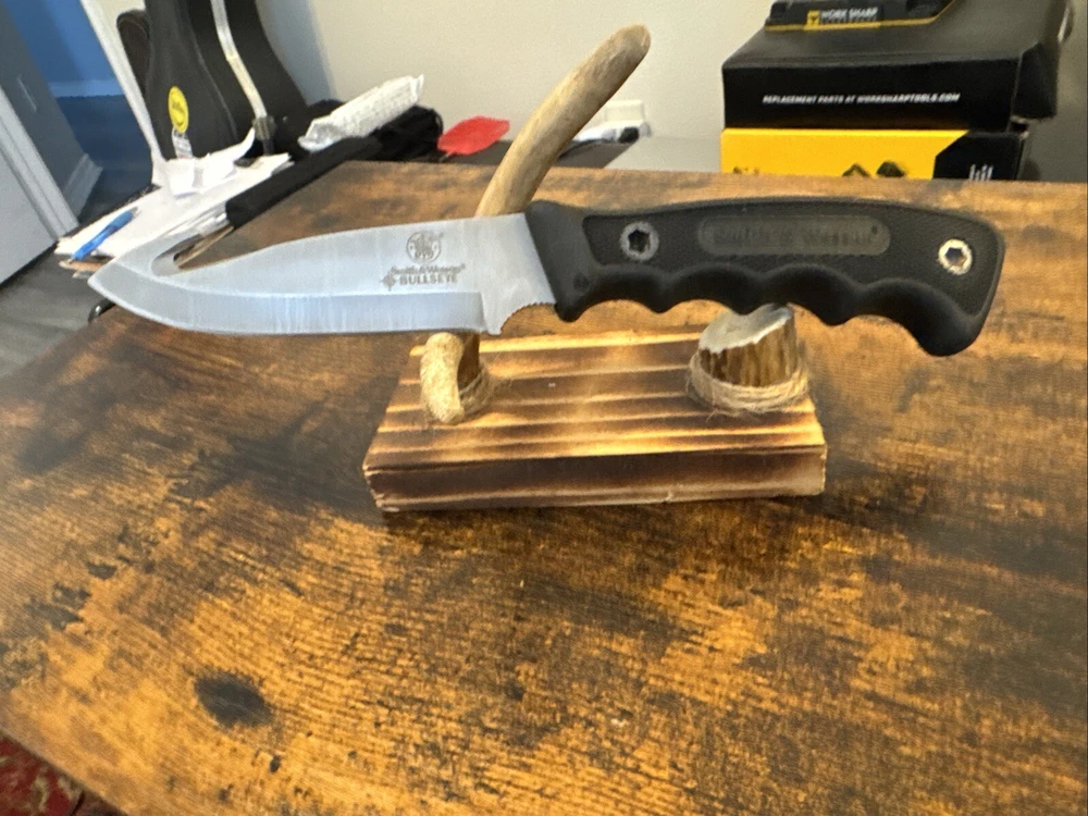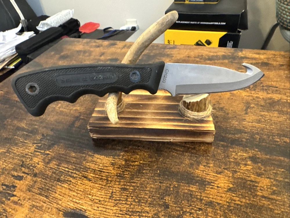 This Smith & Wesson CH200 BULLSEYE HUNTING KNIFE is a must-have for any hunting enthusiast. The 9 1/2" long blade is made of high-quality materials and has never been used. The drop point blade type is perfect for hunting, and the gray blade color adds a touch of style to the knife. The knife is made by Smith & Wesson, a trusted brand in the industry. It falls under the categories of Collectibles, Knives, Swords & Blades, Collectible Fixed Blade Knives, Modern Fixed Blade, and Factory Manufactured. This knife is perfect for hunting and makes a great addition to any collection. Appears unused and un carried. No sheath included.
