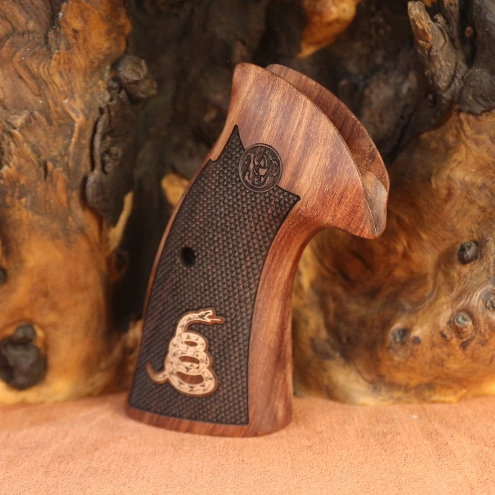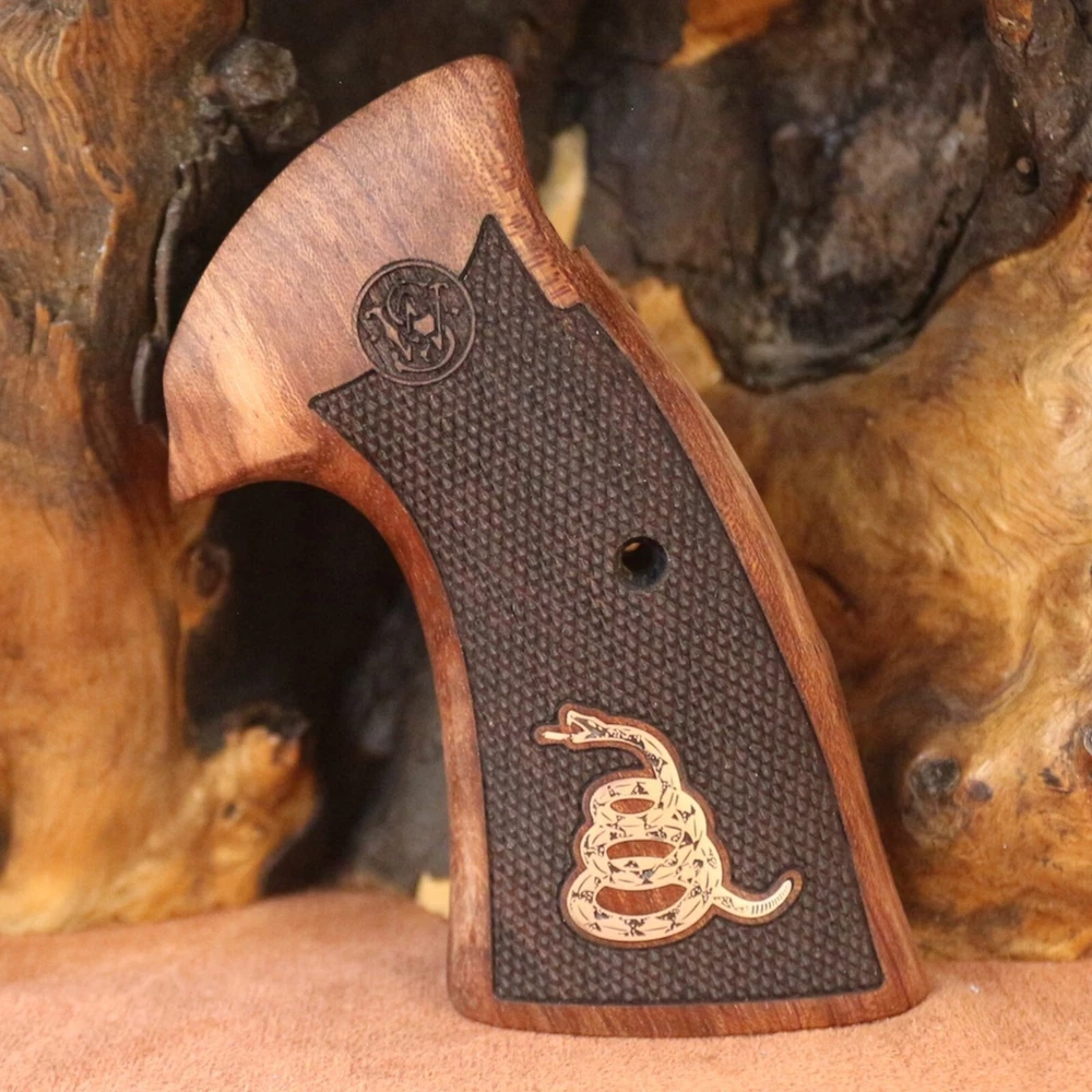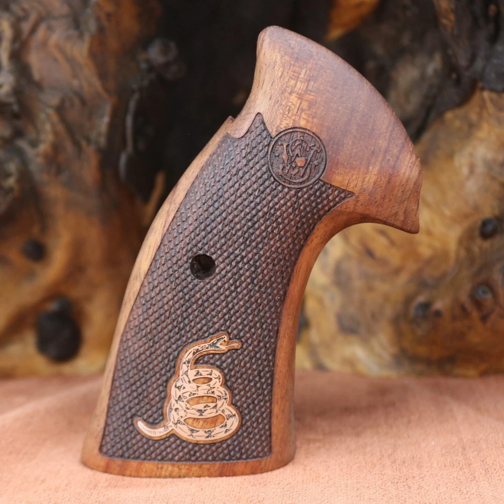 Smith Wesson K L X Frame Round Butt. Compatible Models: 3.57 MAGNUM (Models 10, 12, 13, 14, 15, 17, 19, 64, 65, 66, 67, 69, 242, 296, 386, 396, 460, 500, 520, 547, 586, 617, 619, 620, 646, 647, 648, 681, 686, 696, 986, Governor) Note Not compatible with square butt stock type models. A set of interlocking screws and a set of pins are included to hold the wood tightly together. The wood material of our products is made of high quality Turkish Rosewood and the material of our logos is made of pure brass. Dont Tread On Me Silver Logo All our products are guaranteed for 2 years. Within 60 days you can return the product free of charge.