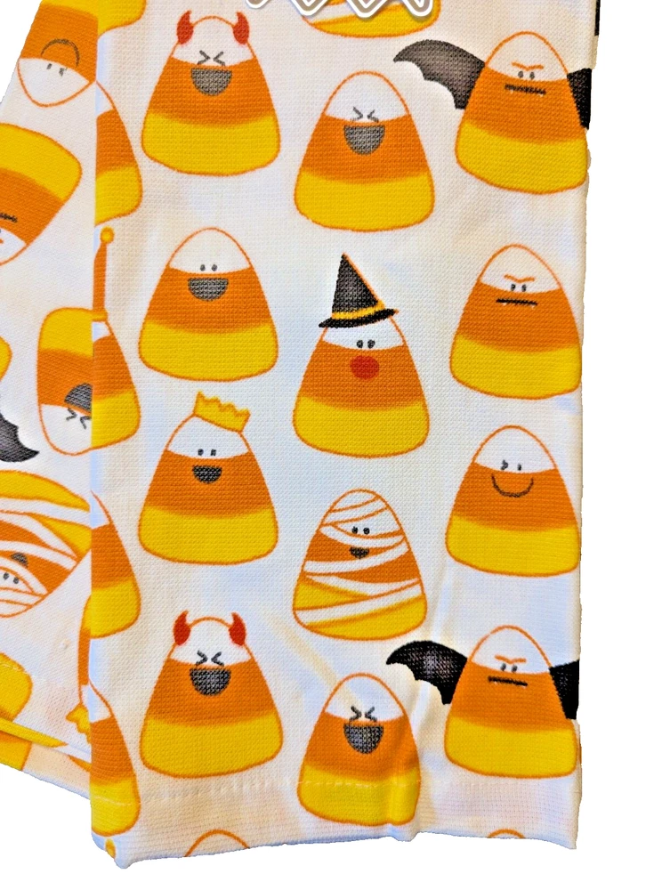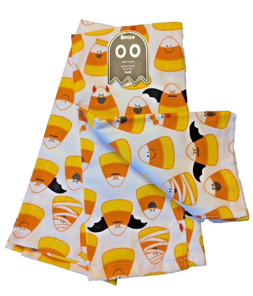 Smize kitchen towels features a Halloween theme with candy corn dressed up in costumes. Size - 18 x 28 100% cotton. From a non-smoking and pet-free environment. AA-3H